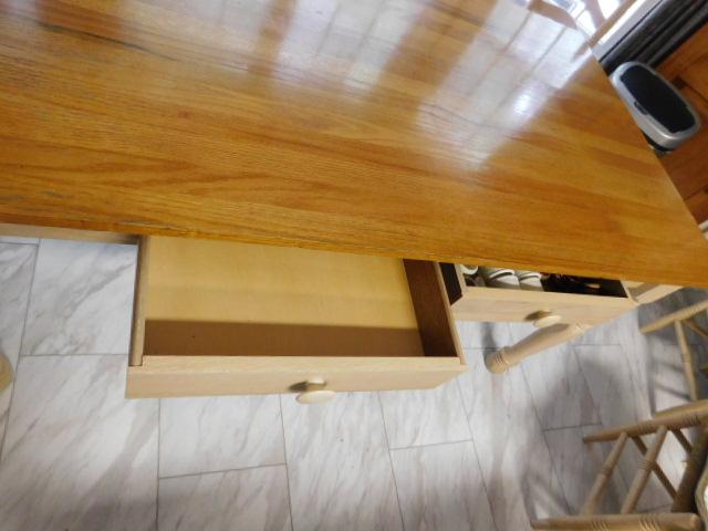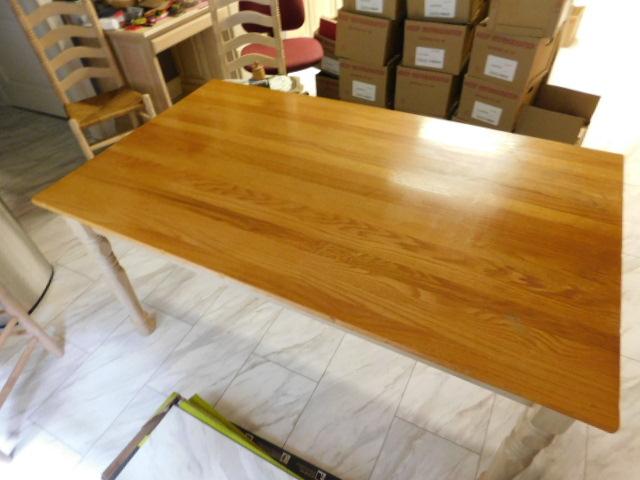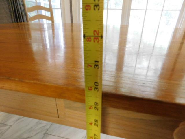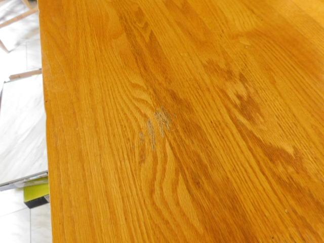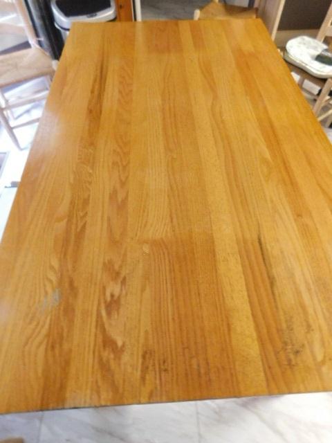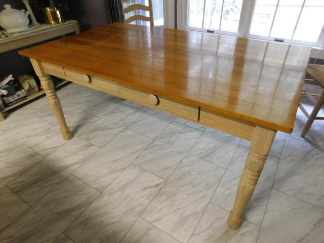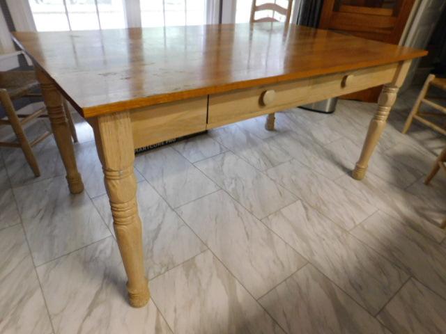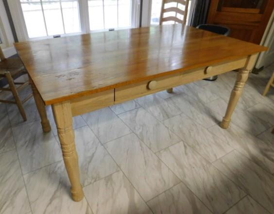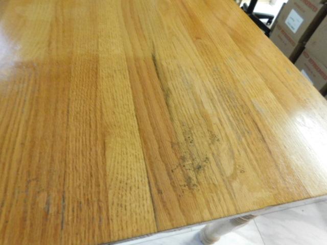 Solid Wood Kitchen Farm Style Table 62"x36"x30" main floor. Has some marks on top as shown