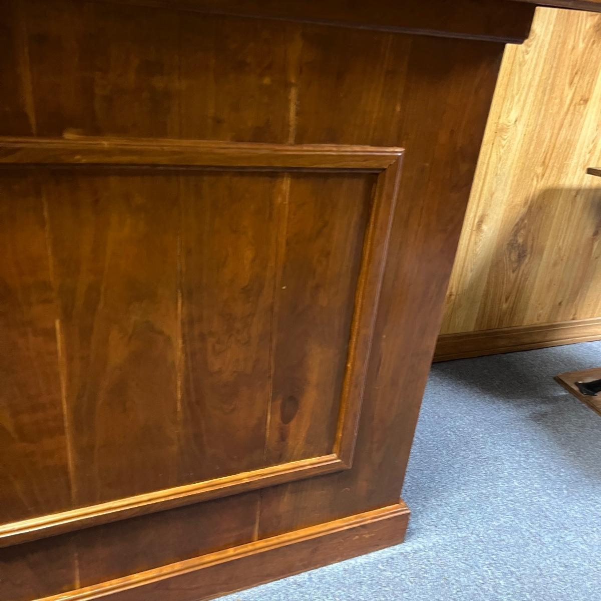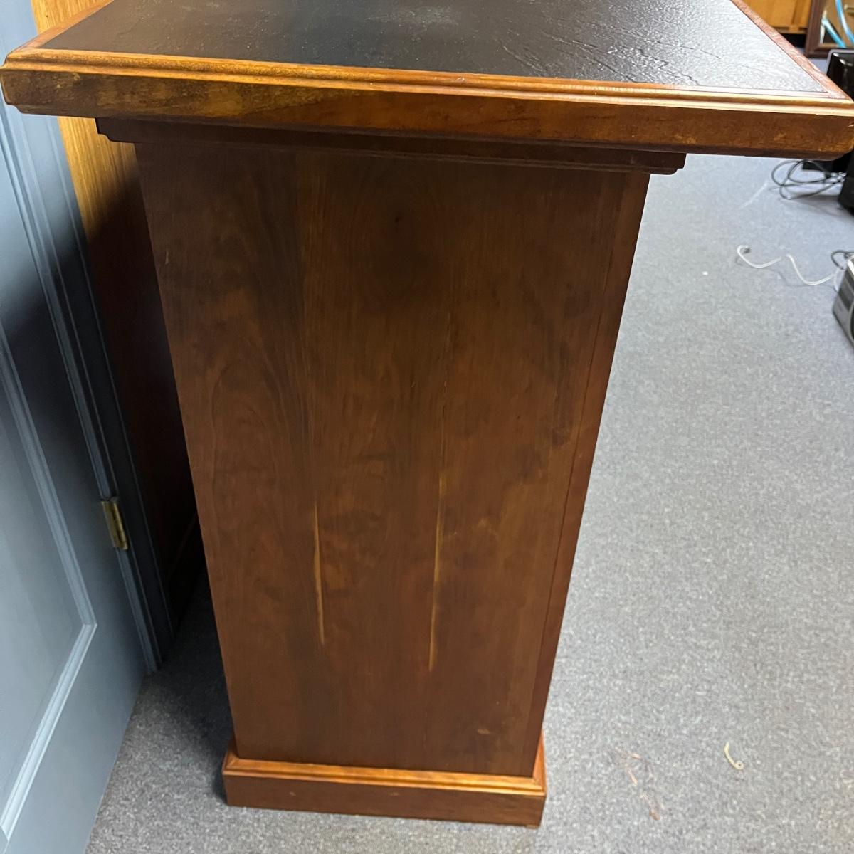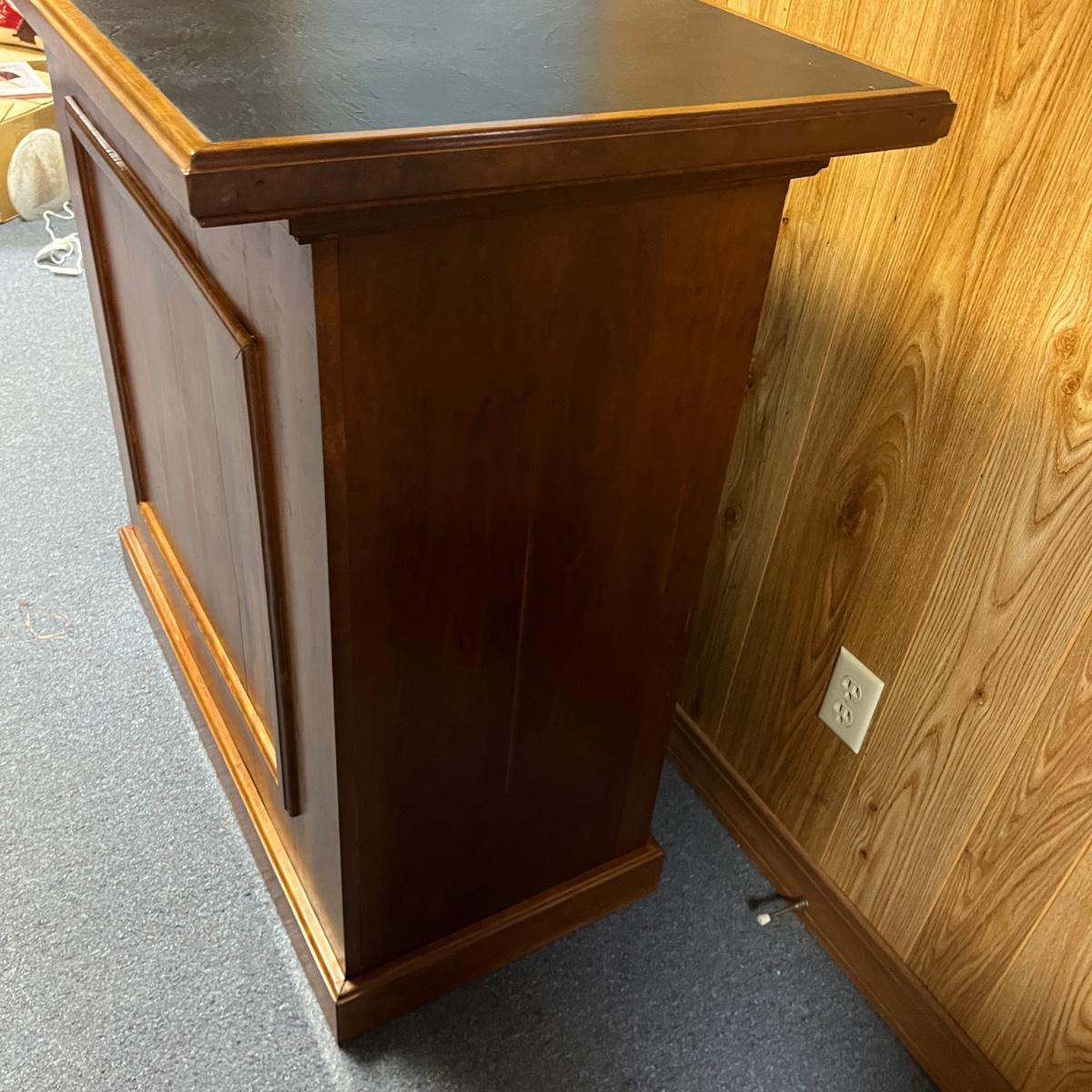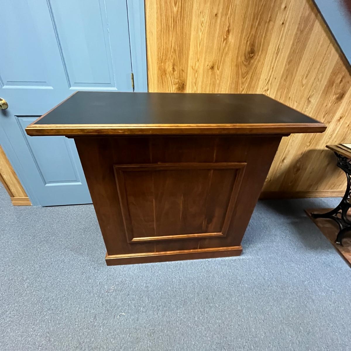 This solid wood bar measures 45” x 22” x 21.5”H. Bar has a crack on the front piece, see pictures. There is one shelf on the backside. The black top appears to be formica material.