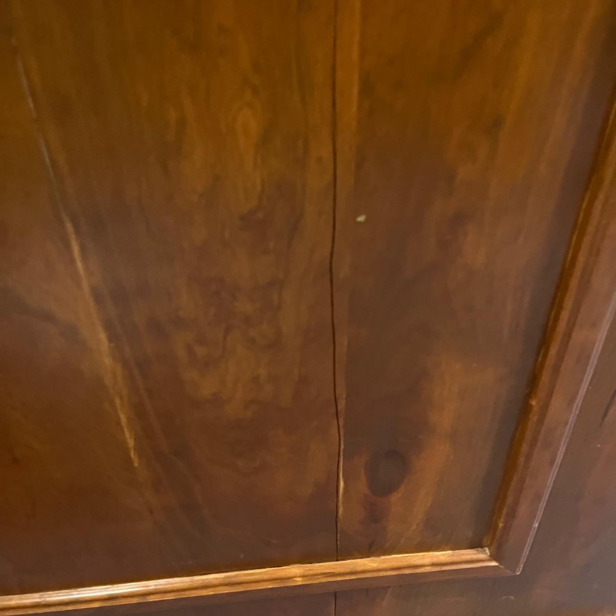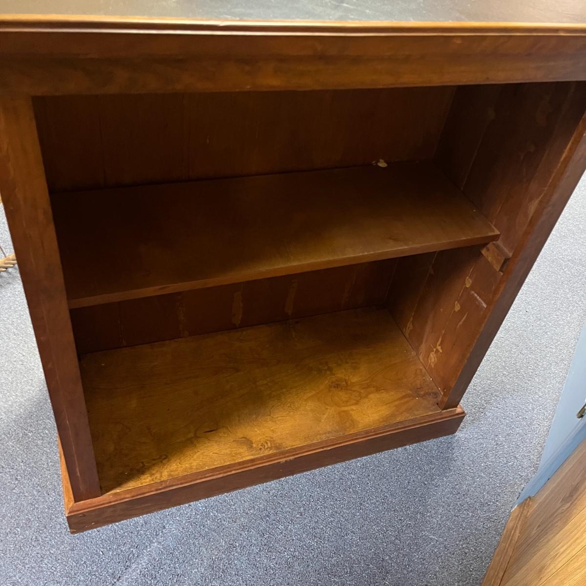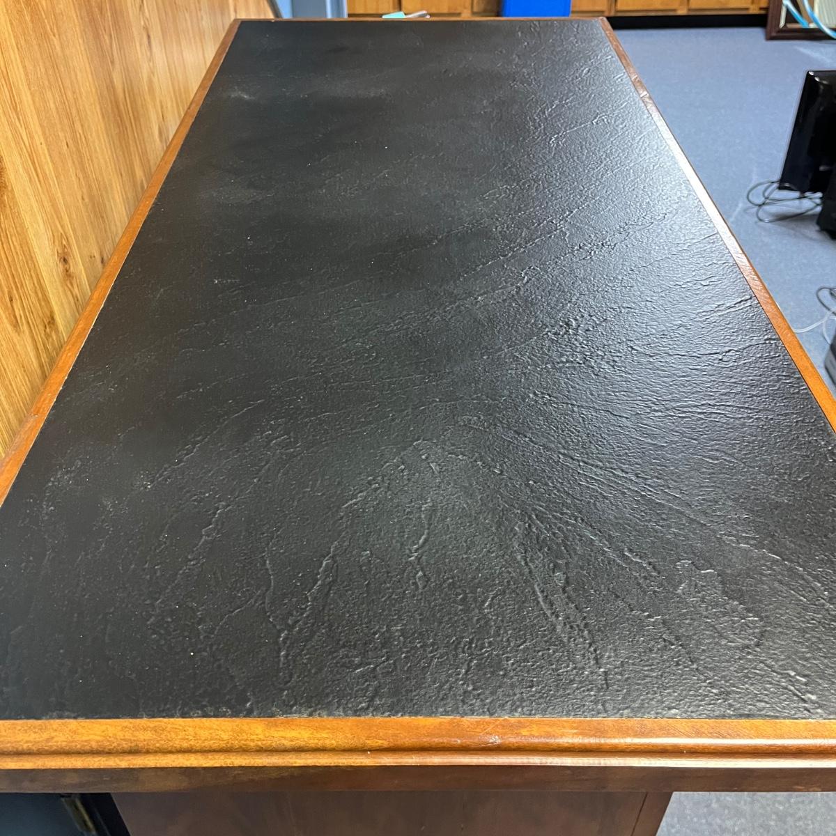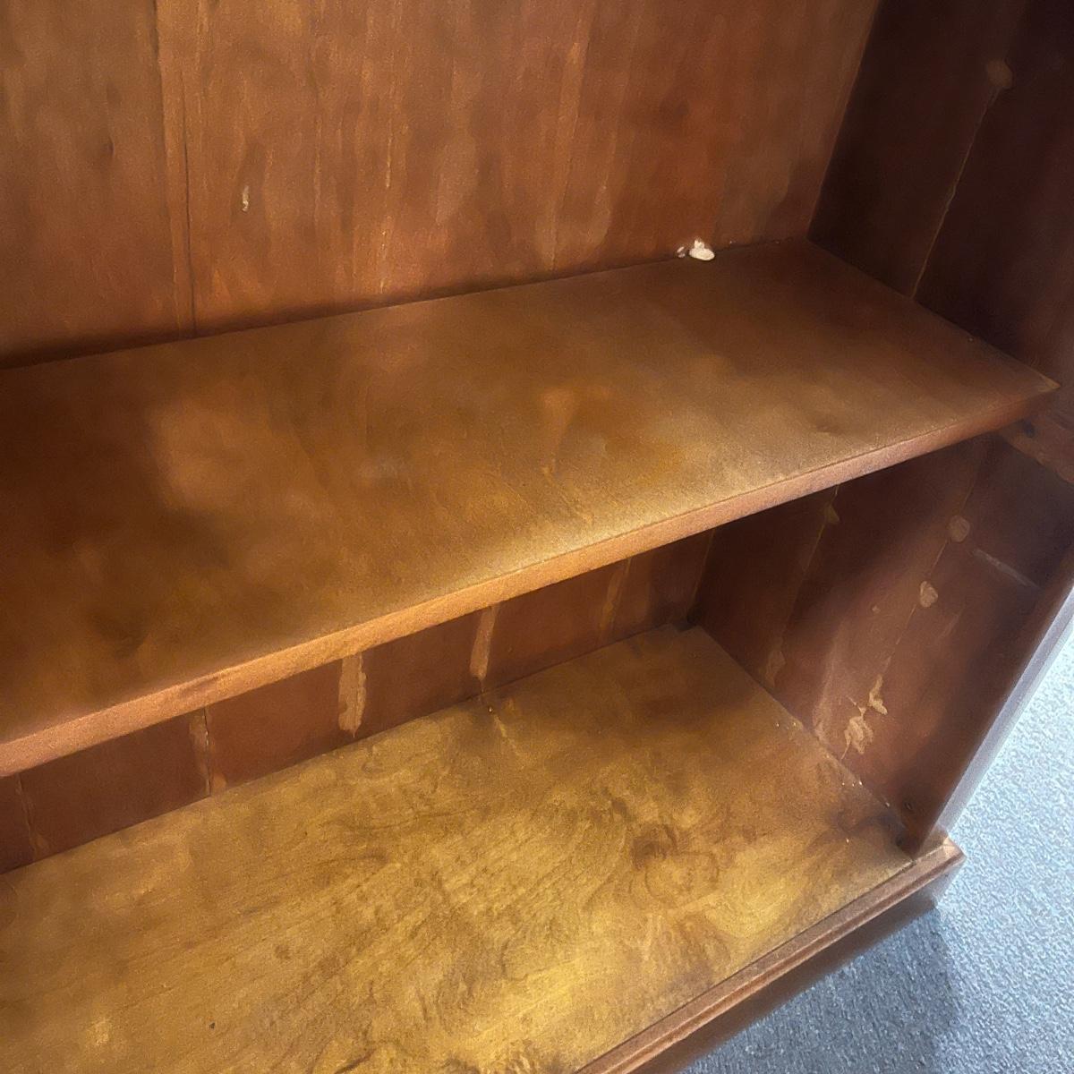 This solid wood bar measures 45” x 22” x 21.5”H. Bar has a crack on the front piece, see pictures. There is one shelf on the backside. The black top appears to be formica material.