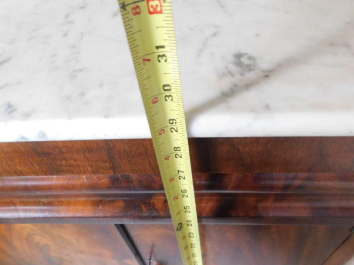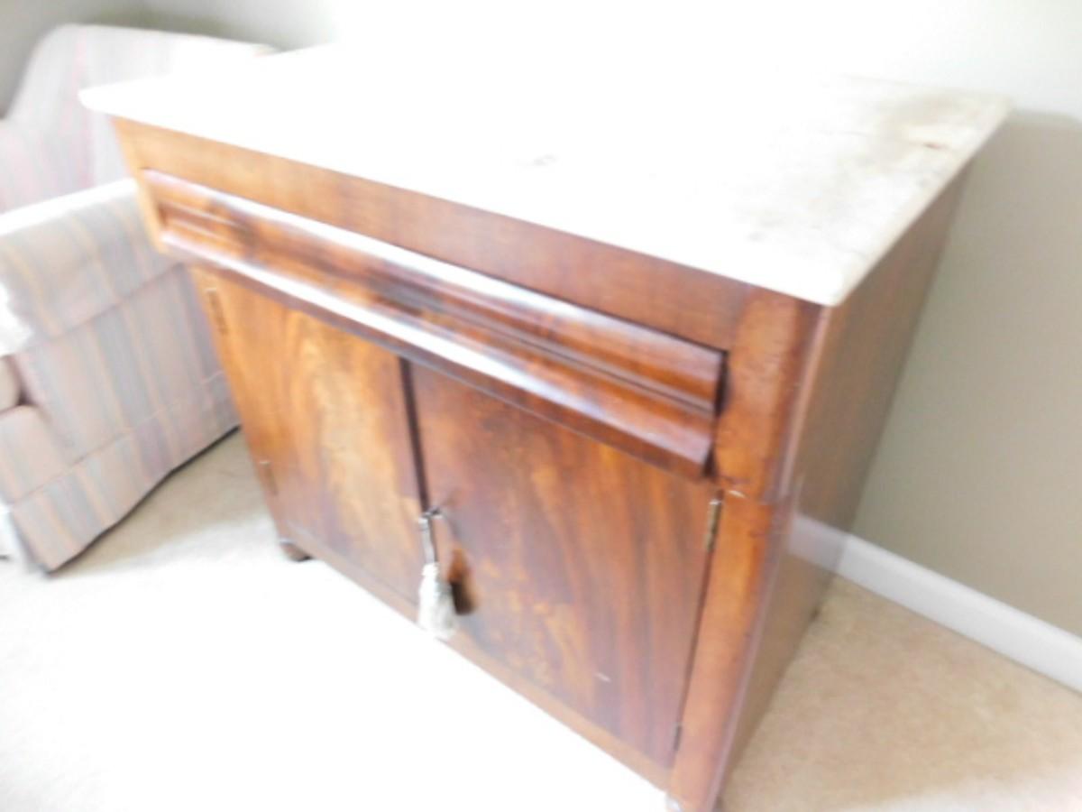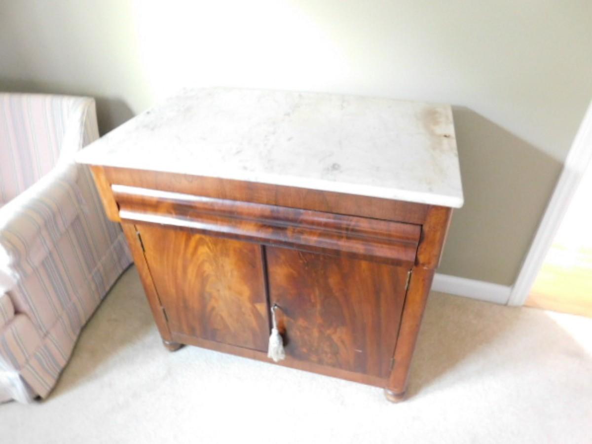 Solid Wood Mahogany Cupboard with Marble Top. Marble has crack on corner as shown. Main floor item