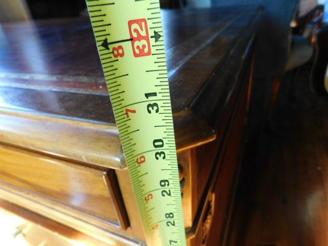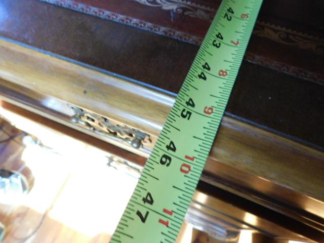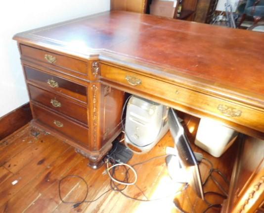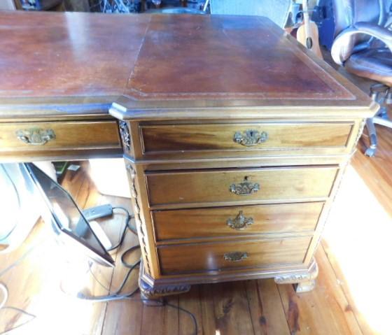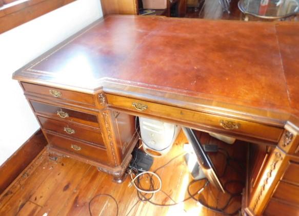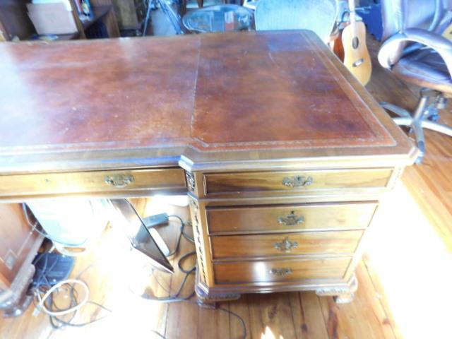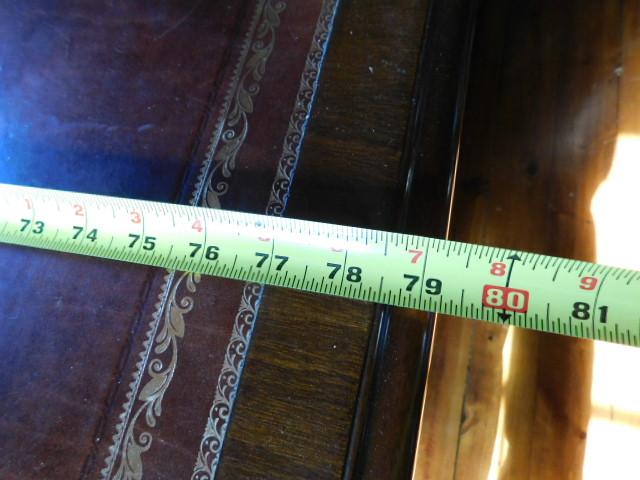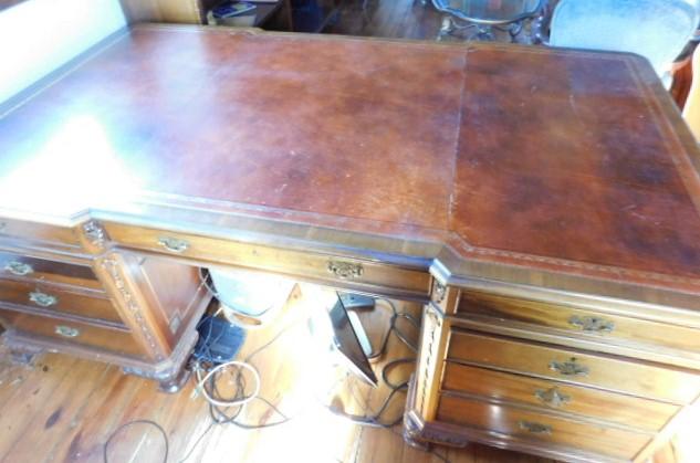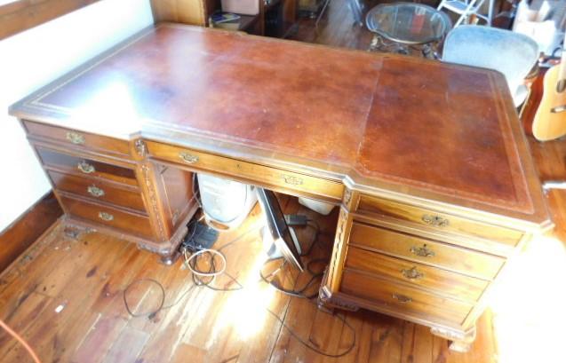 Solid Wood Maple Executive Desk with Leather Top and Marquetry Accents 81"x46"x30" expect some wear and scratches to the surface. There a couple of minor burns on surface of leather. This is an upstairs item. Please bring tools to breakdown if needed. 2 to 3 person removal