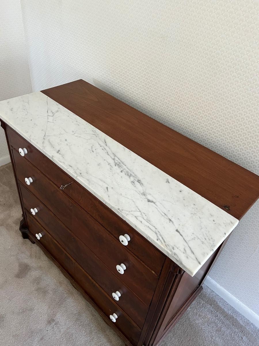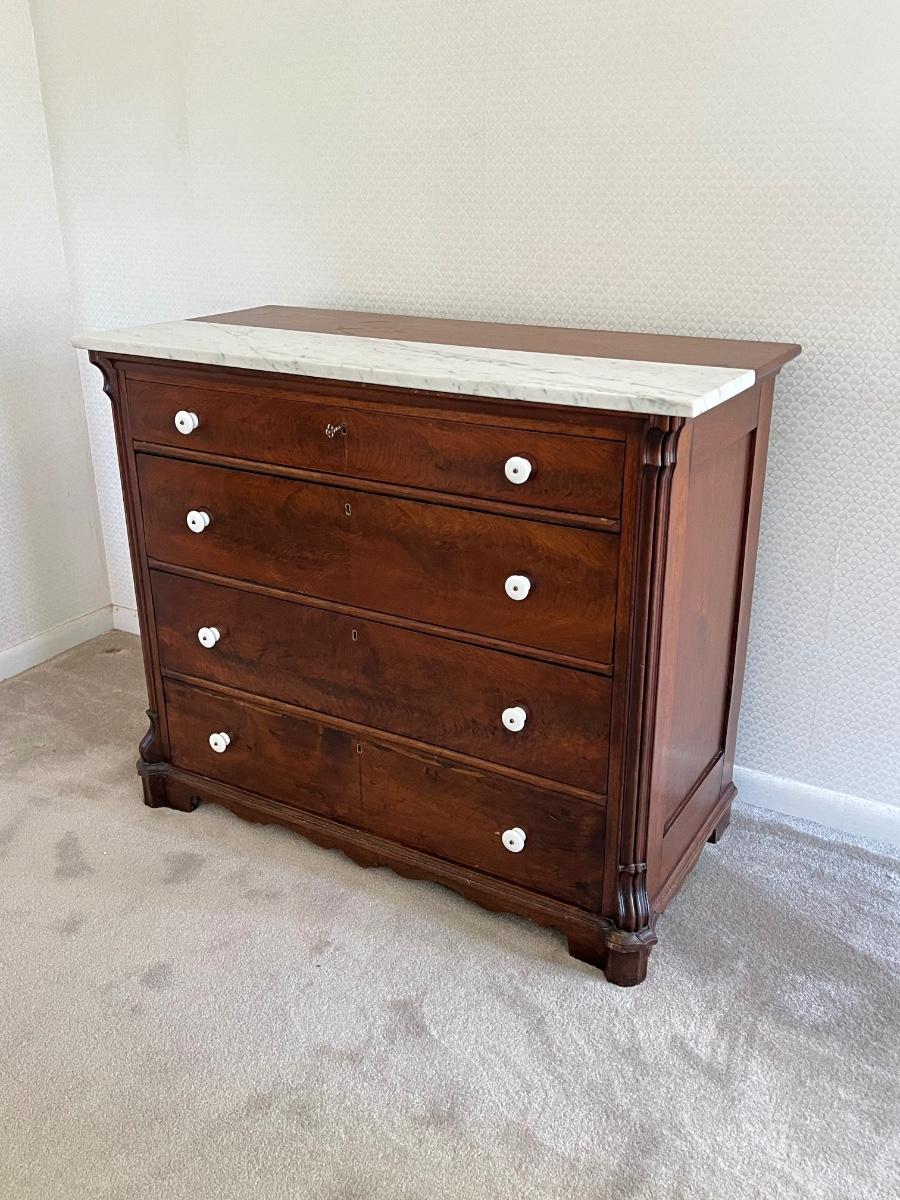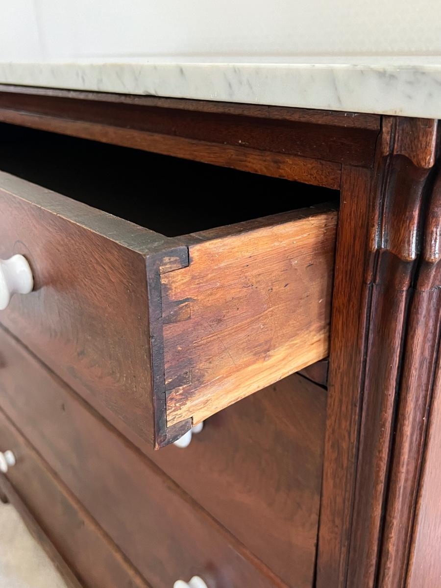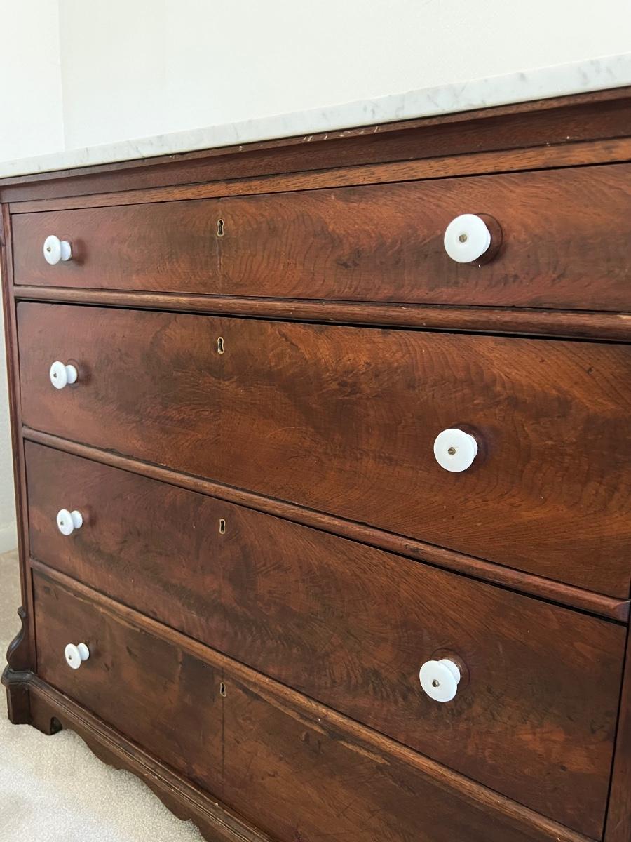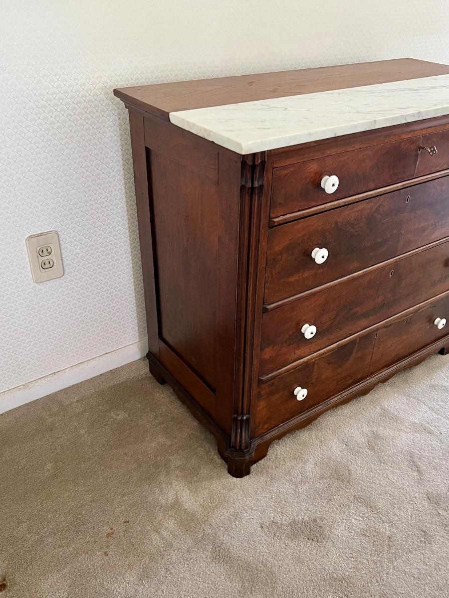 Front half of chest has marble top, marble is removable ~ All drawers slide easy, only top 2 drawers lock, 2 bottom drawers have faux key holes ~ Has key ~ No brand ~ 35” H x 42.5” W x 21” D