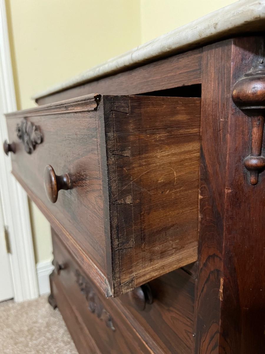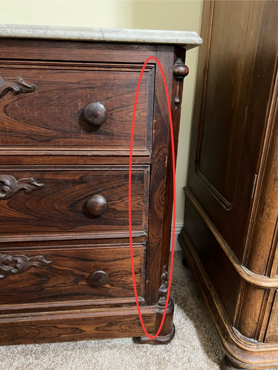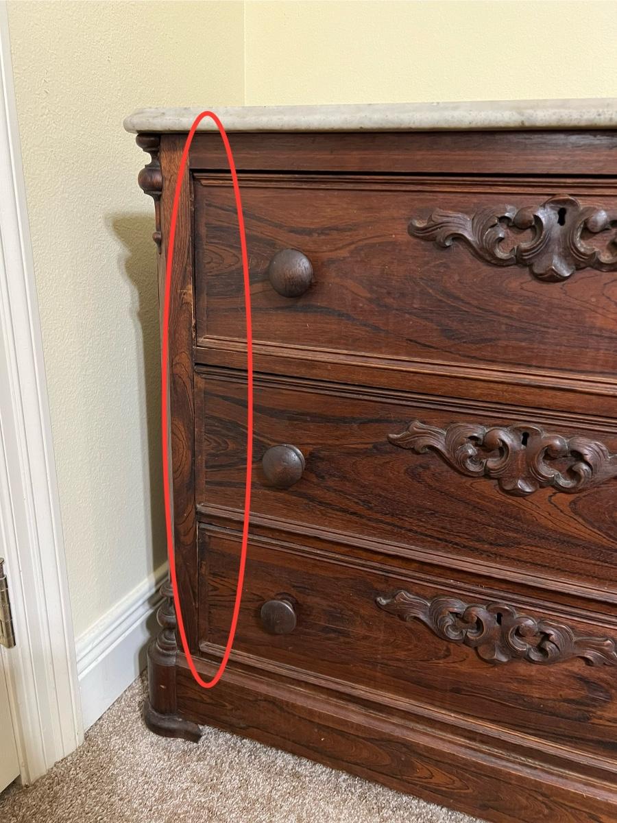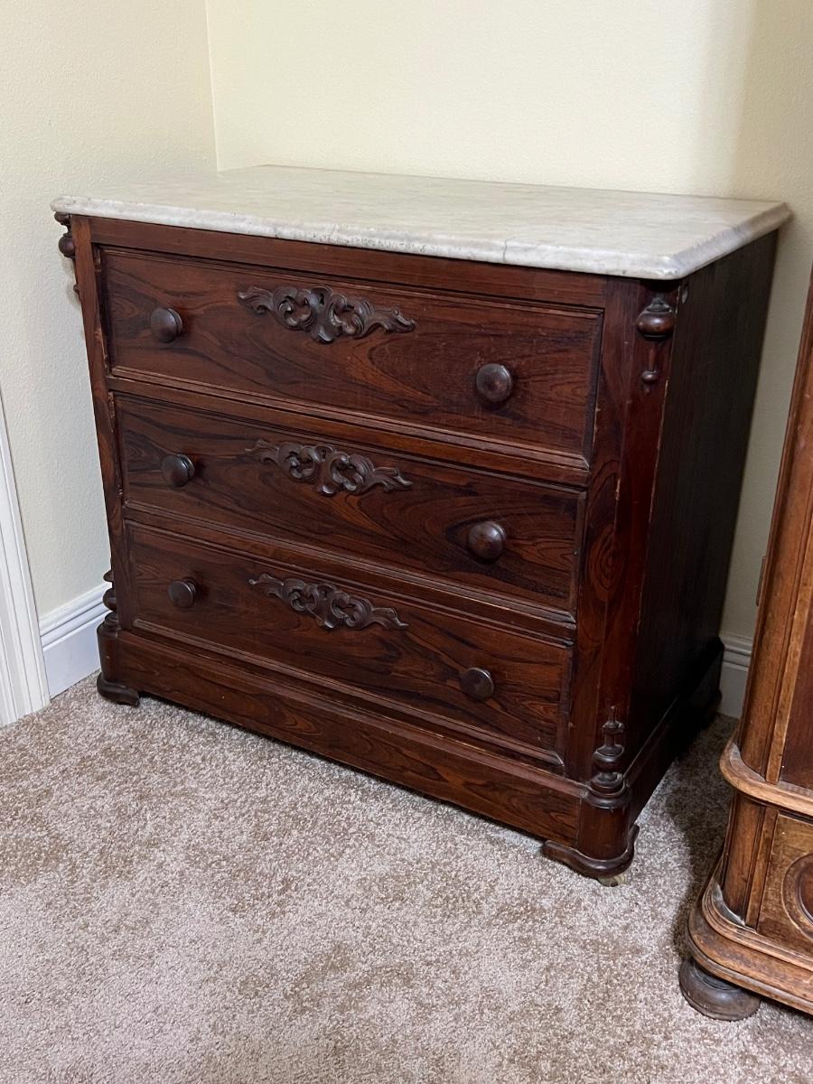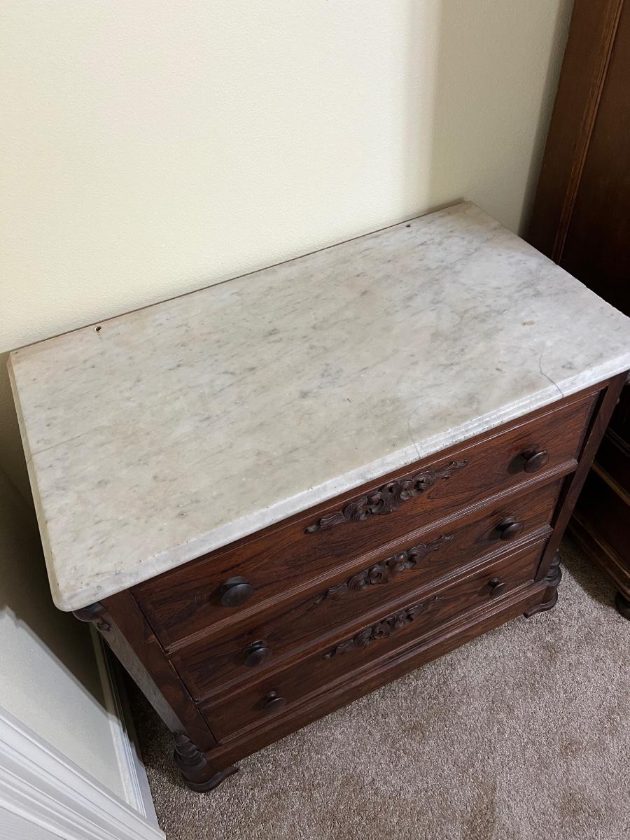 Marble top is removable ~ Does have some trim missing due to age, see photos ~ Has no key ~ 30” H x 33.5” W x 18.5” D