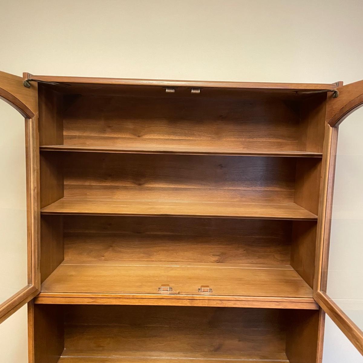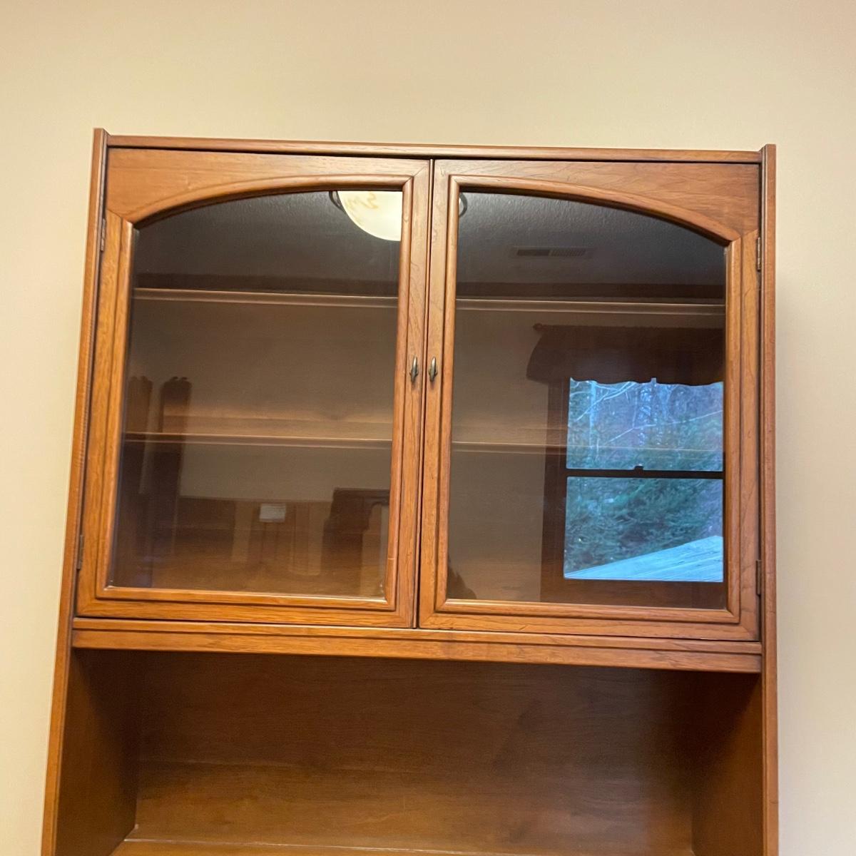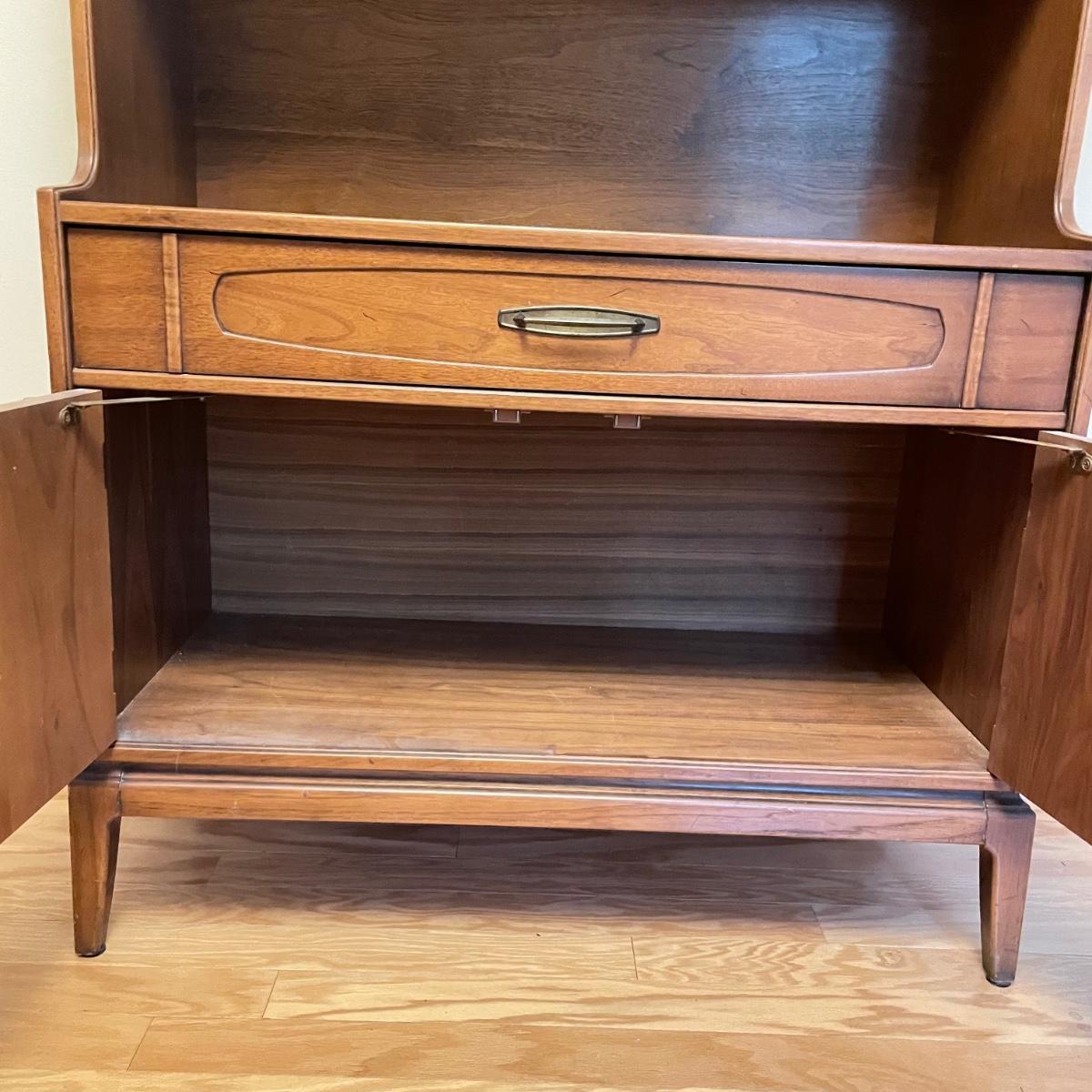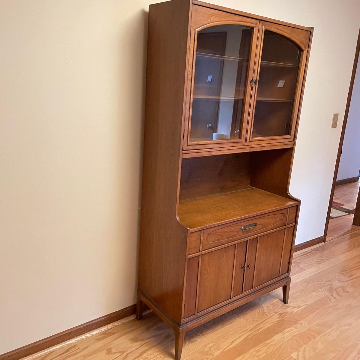 Stylish MCM style hutch. Piece has an upper cabinet with single panel glass doors and three fixed shelves with plate grooves. The middle shelf also has one plate groove and a very small hole in the lower left area, which appears to be intentional, but it doesn’t seem large enough for an electric cord. The lower portion has one dovetailed drawer and a cabinet with no shelves, perfect for larger storage. The hutch was housed in a guest bedroom and shows very little wear, it measures 38” x 17” x 72”H. Hutch is one piece, it will not come apart for transport. Winning bidder will need at least two people to transport to their vehicle, there are no flights of stairs involved. Winning bidder must bring assistance to help move and load this item due to its weight and/or size.