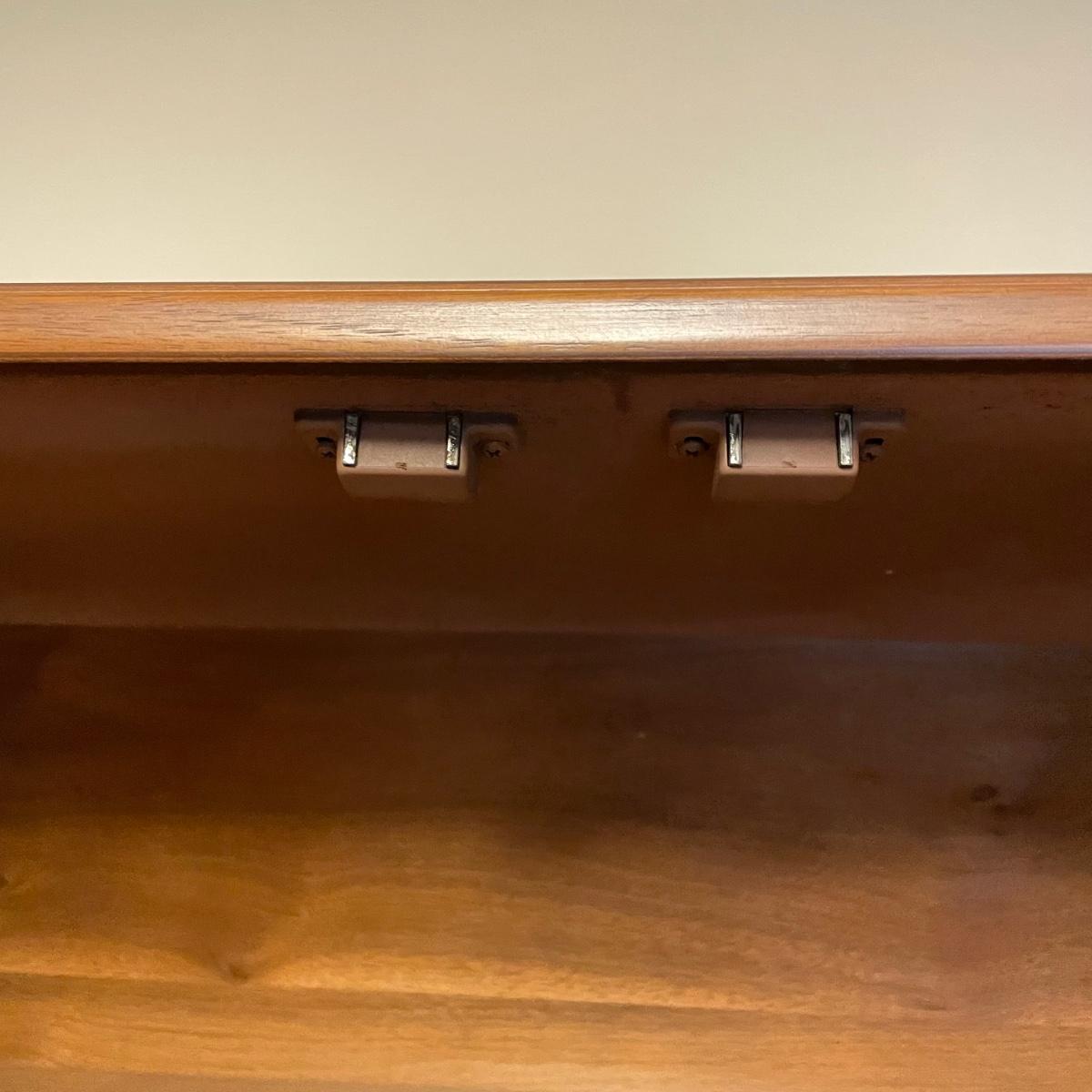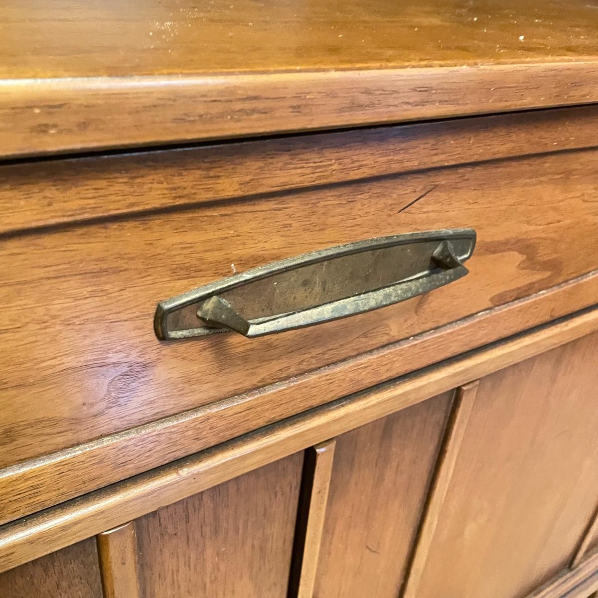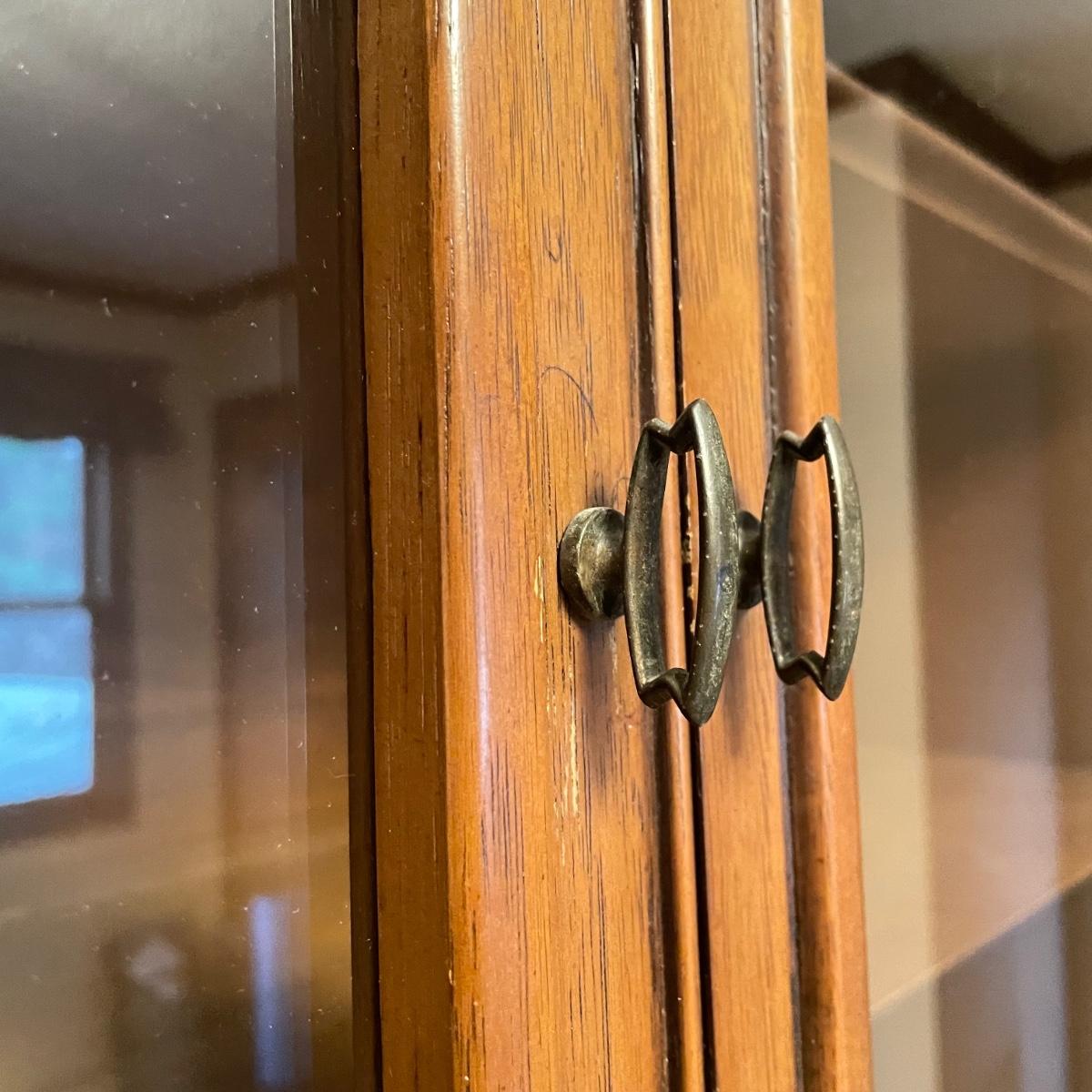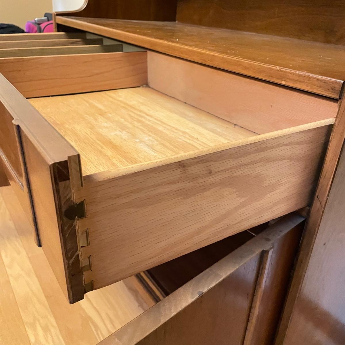 Stylish MCM style hutch. Piece has an upper cabinet with single panel glass doors and three fixed shelves with plate grooves. The middle shelf also has one plate groove and a very small hole in the lower left area, which appears to be intentional, but it doesn’t seem large enough for an electric cord. The lower portion has one dovetailed drawer and a cabinet with no shelves, perfect for larger storage. The hutch was housed in a guest bedroom and shows very little wear, it measures 38” x 17” x 72”H. Hutch is one piece, it will not come apart for transport. Winning bidder will need at least two people to transport to their vehicle, there are no flights of stairs involved. Winning bidder must bring assistance to help move and load this item due to its weight and/or size.