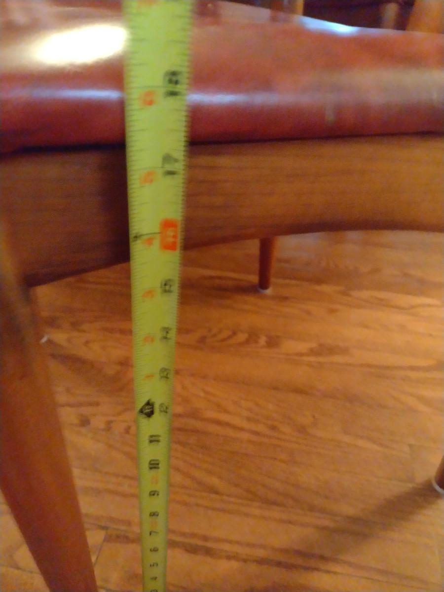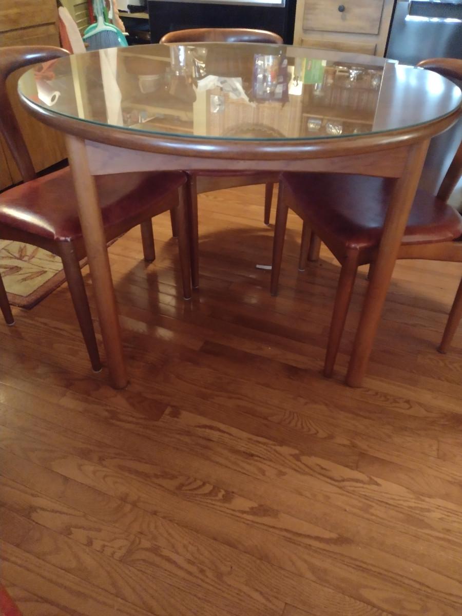 Solid Wood MCM Style Young Hinkle Round Table and Four Chairs. Table is approx 41 1/2" in diameter. Chairs are approx 19 3/4" in diameter.