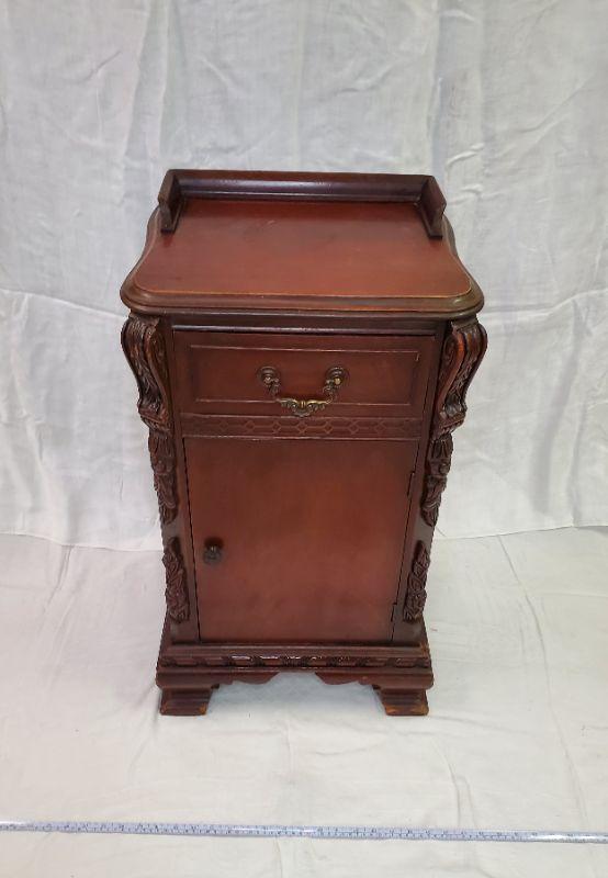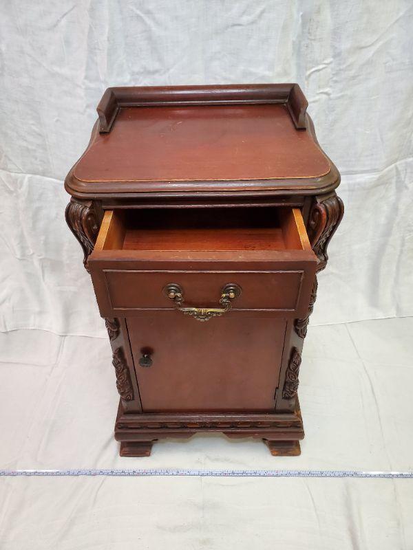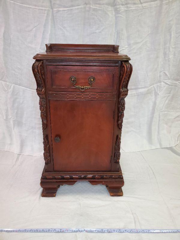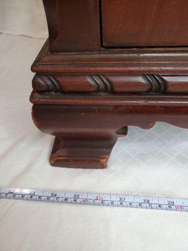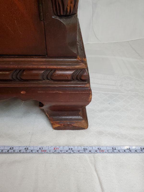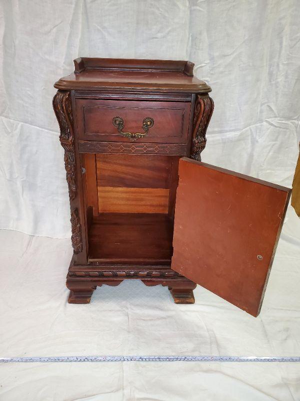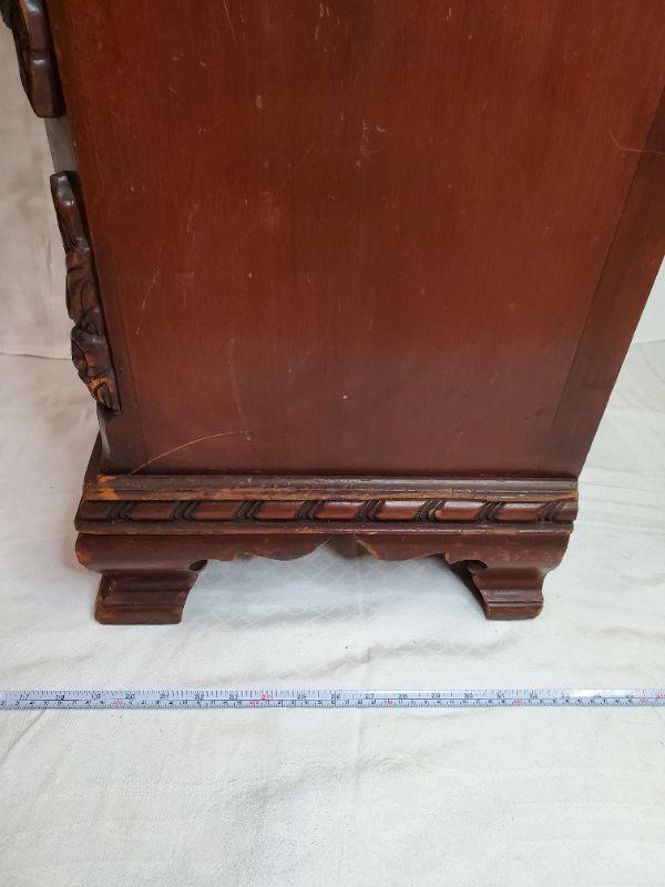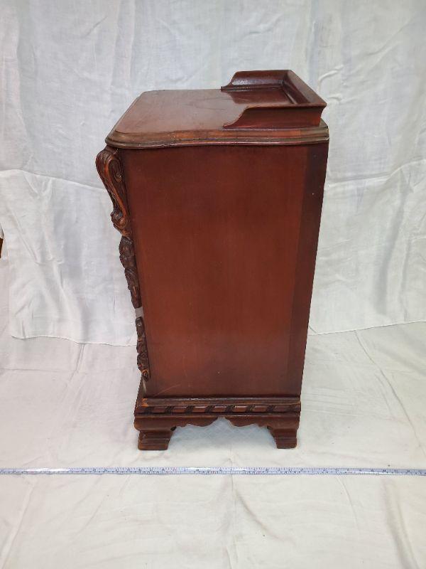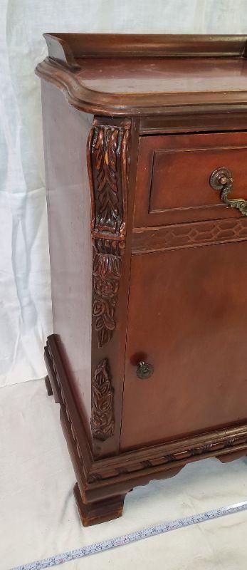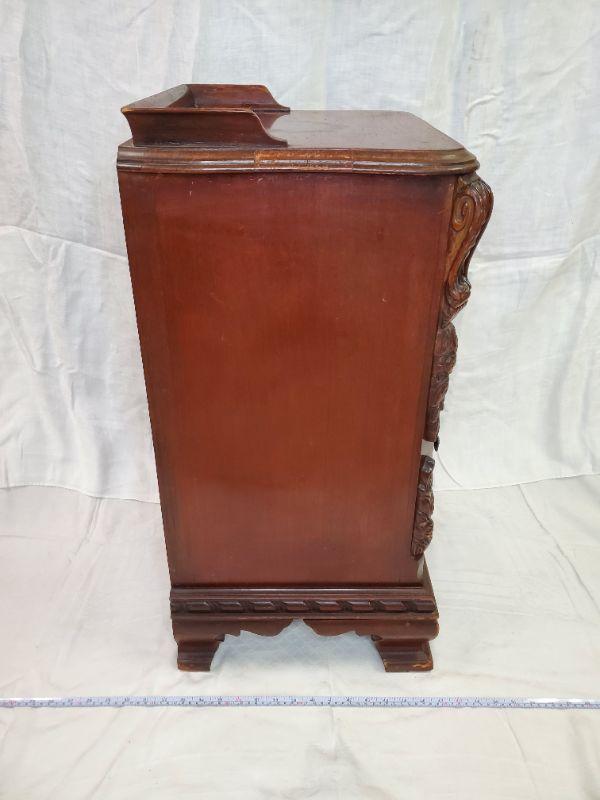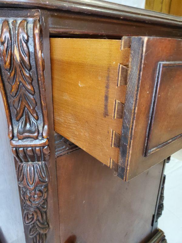 This piece could be used for so many purposes and is absolutely beautiful! Solid wood and super sturdy. Dovetail drawers and beautiful carvings in the wood. This piece has been used and may show signs of such, still plenty of life to use as is!