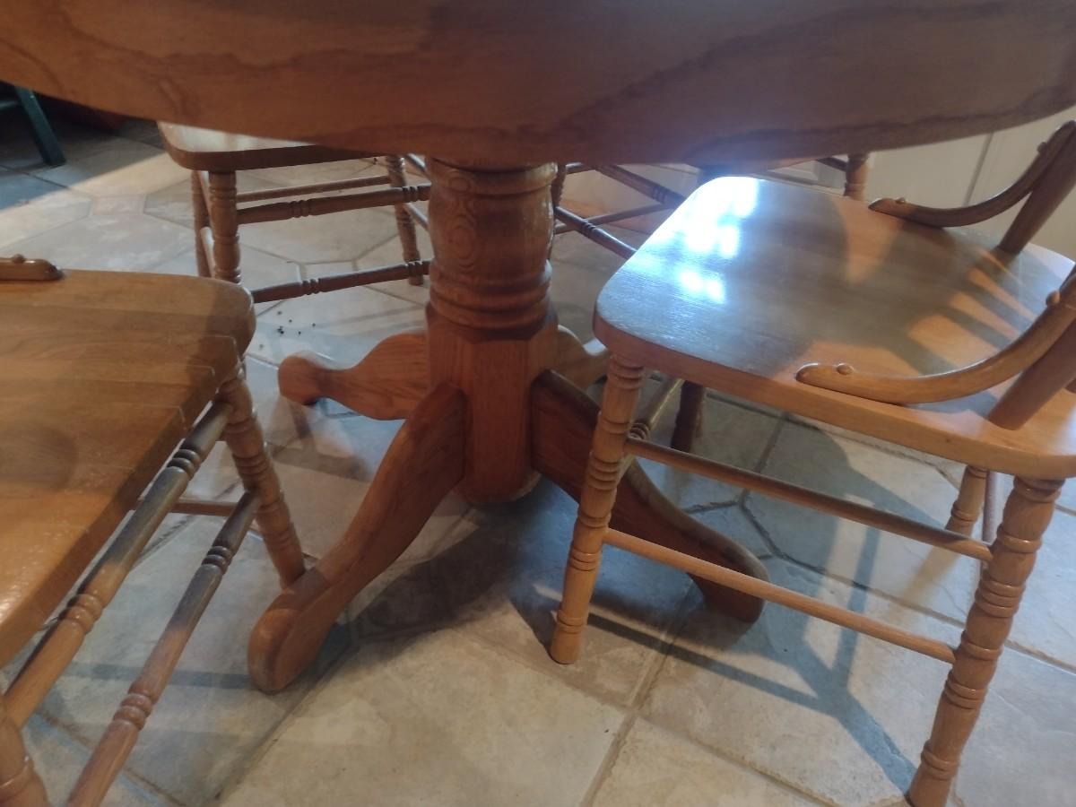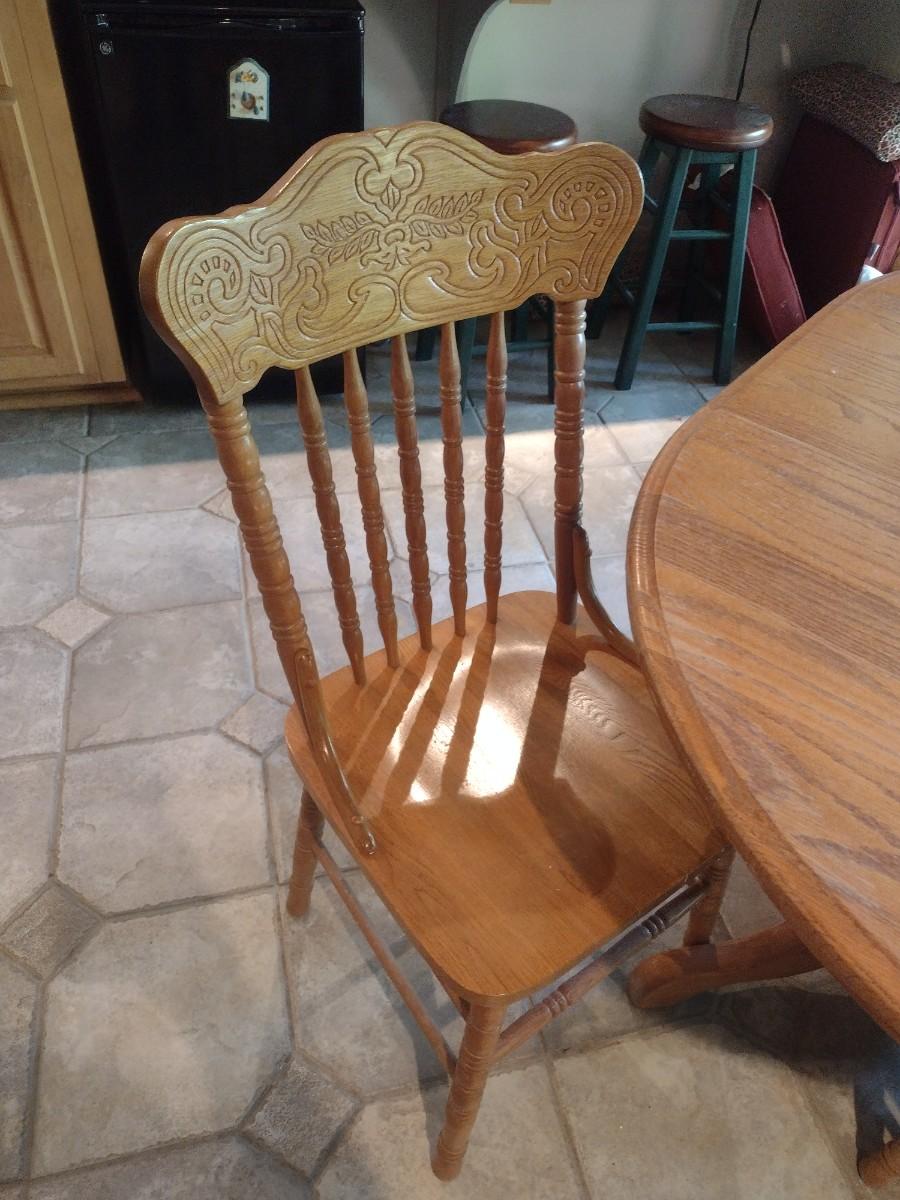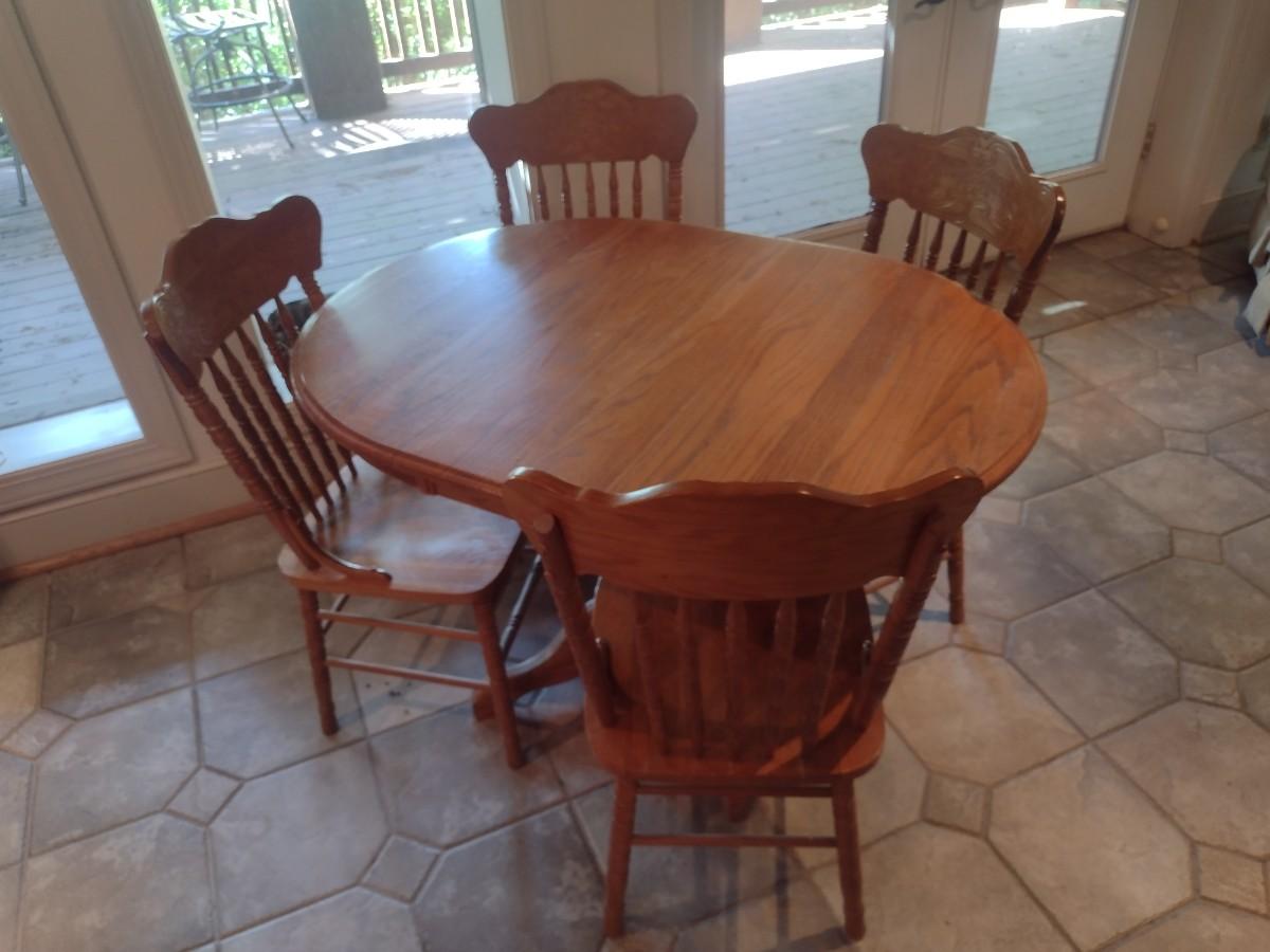 Solid Wood Oak Table and Four Matching Chairs. Lower-level item. Bring assistance to carry up the stairs to the main floor.