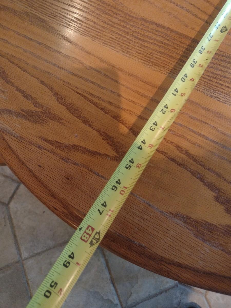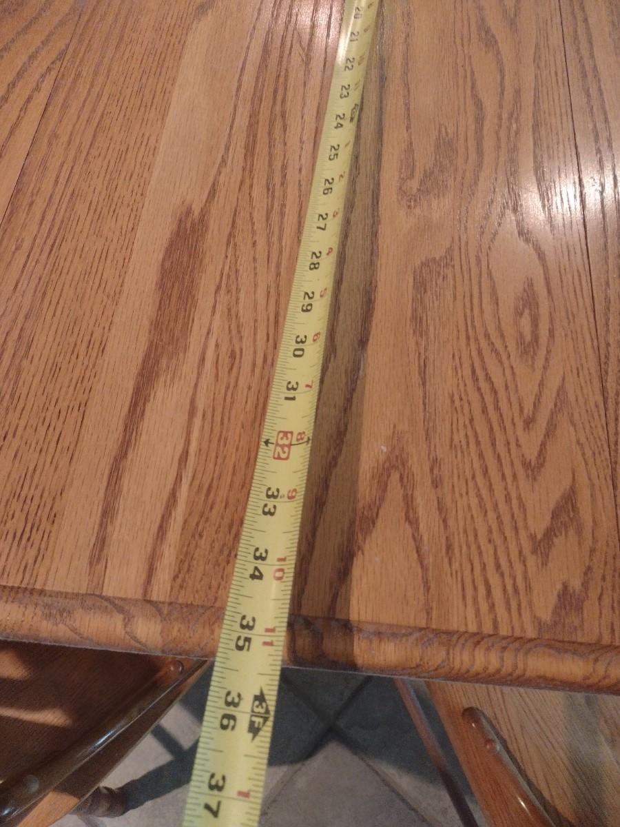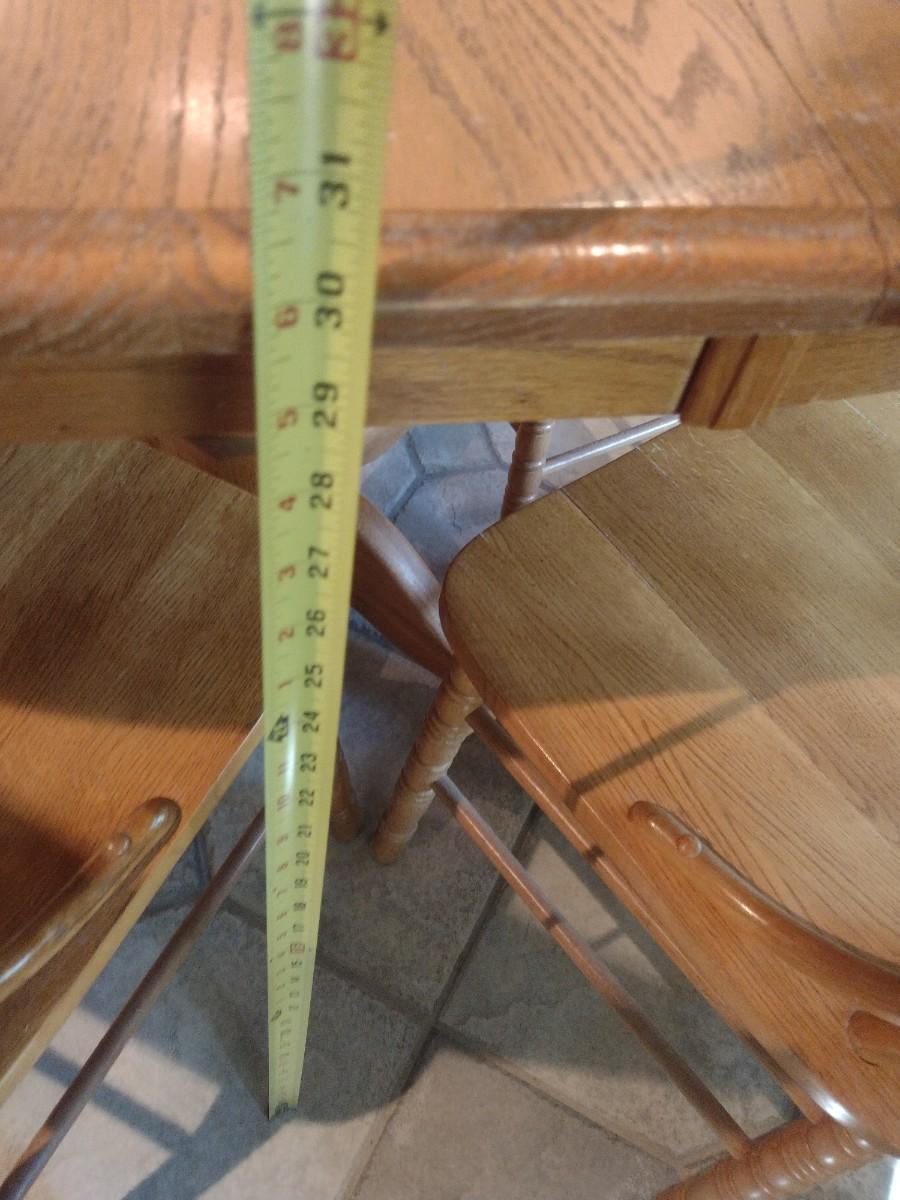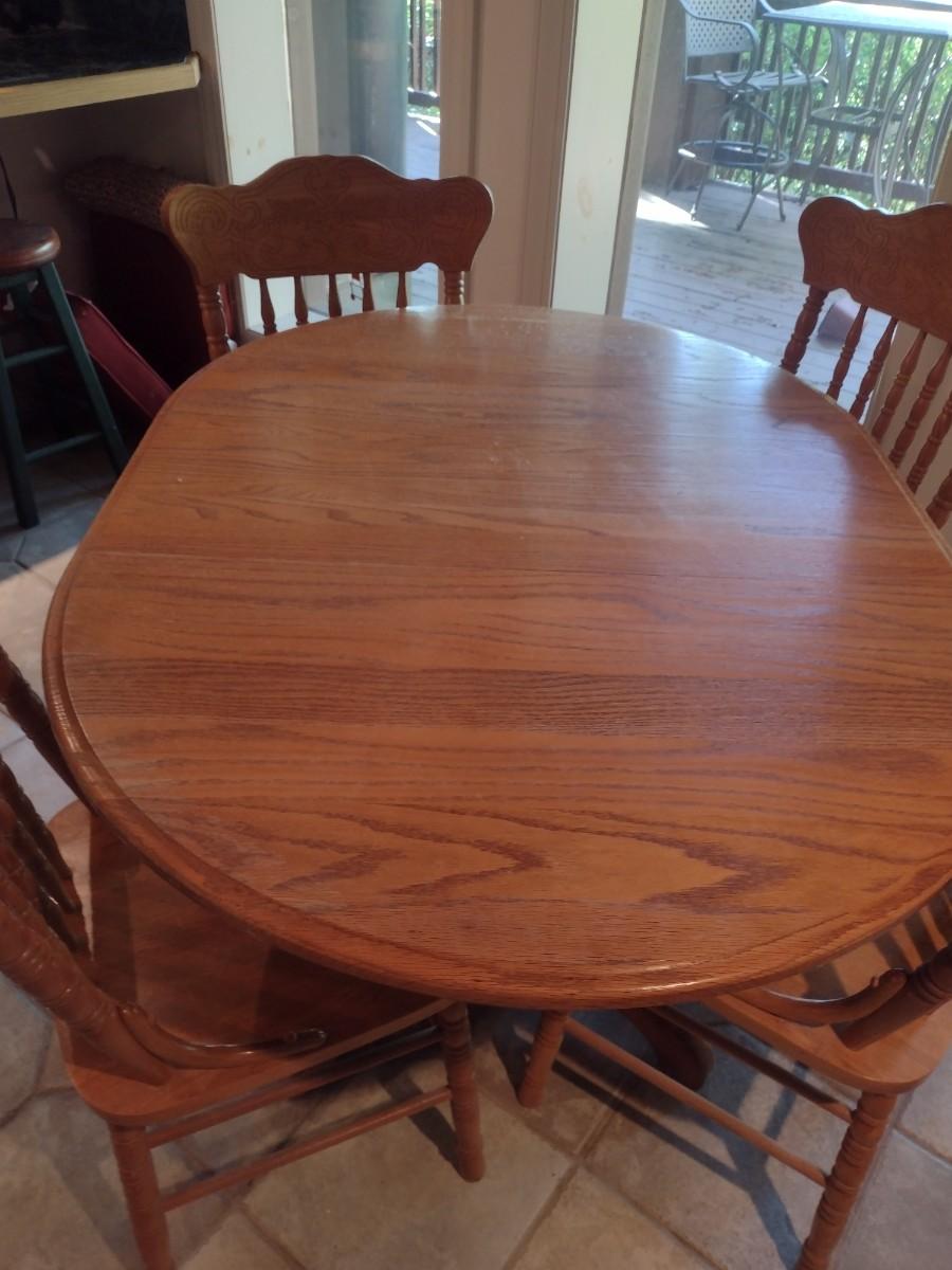 Solid Wood Oak Table and Four Matching Chairs. Lower-level item. Bring assistance to carry up the stairs to the main floor.