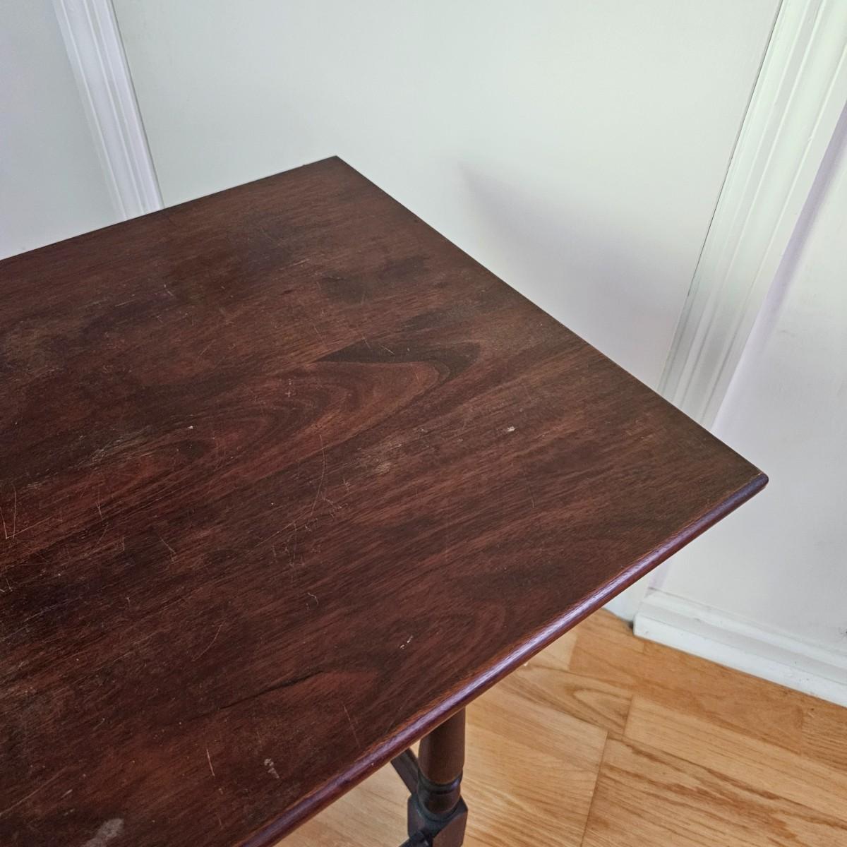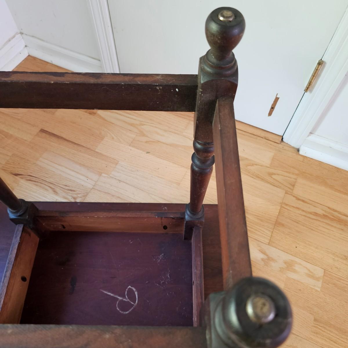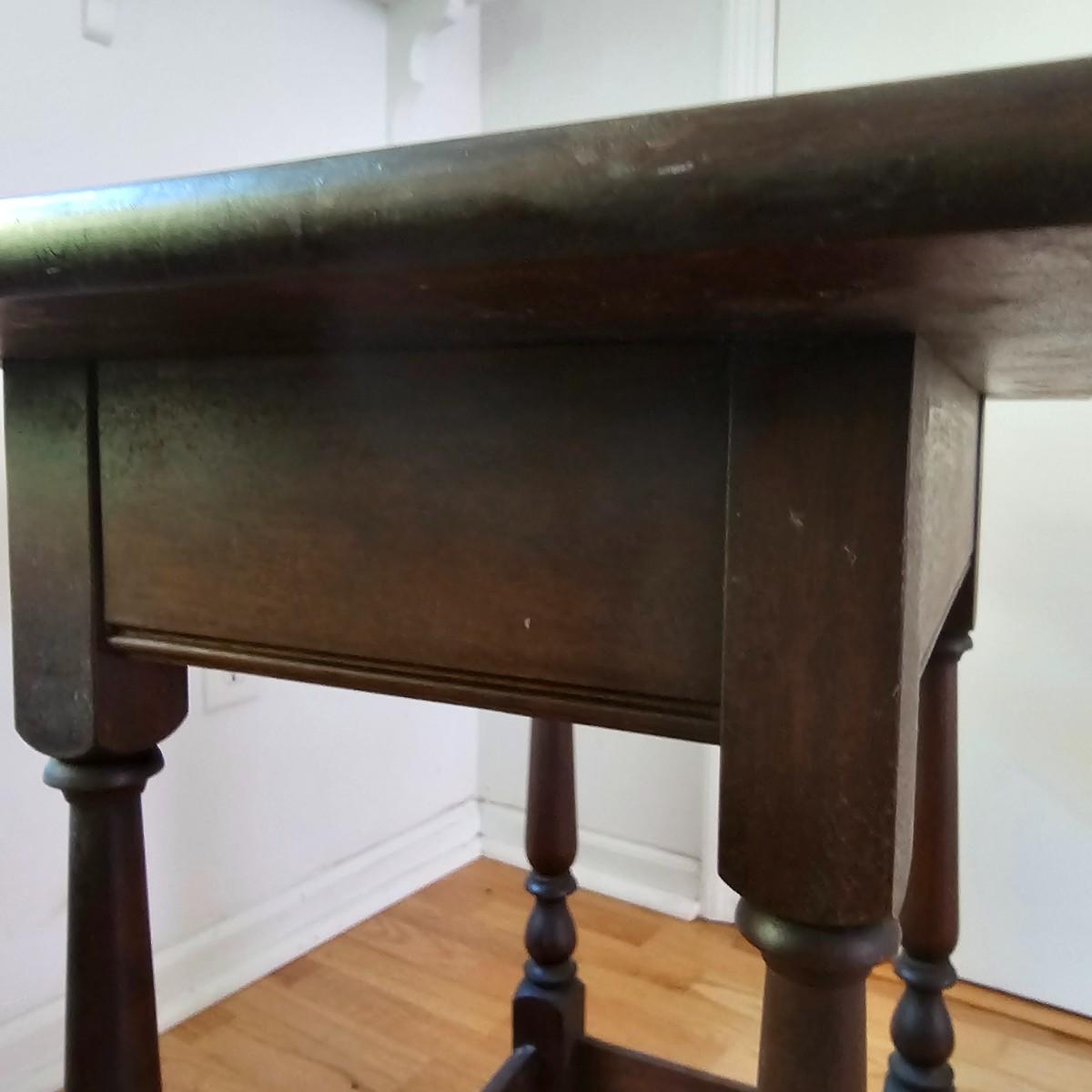 Rectangular shape wood table with turned legs. Solid stringers near base of legs. Table measures 28" x 18" x 26"H. Minor blemishes on top of table. See photos for details. Local pickup only.