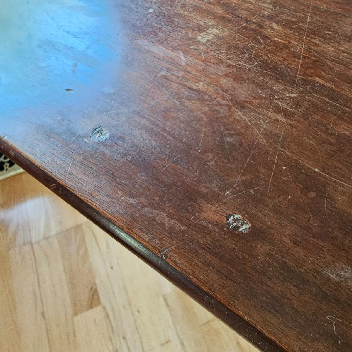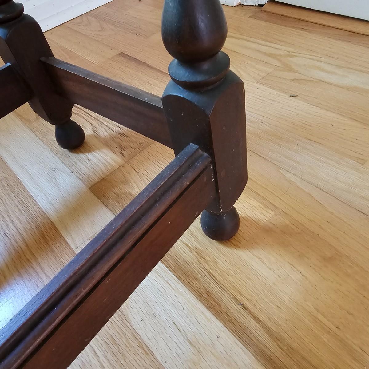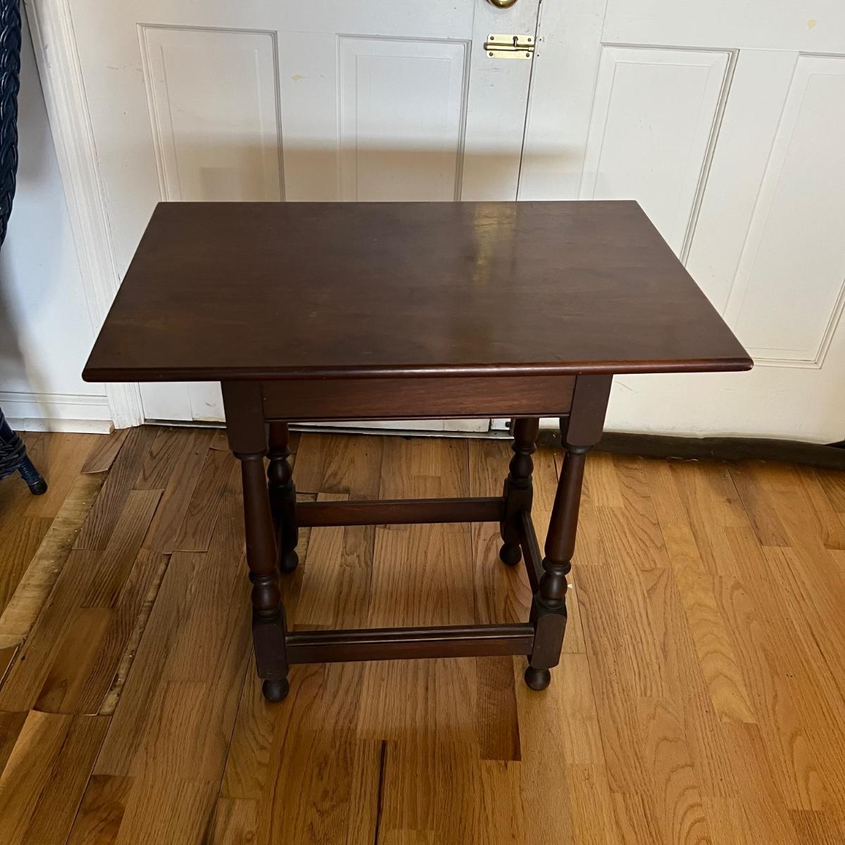 Rectangular shape wood table with turned legs. Solid stringers near base of legs. Table measures 28" x 18" x 26"H. Minor blemishes on top of table. See photos for details. Local pickup only.