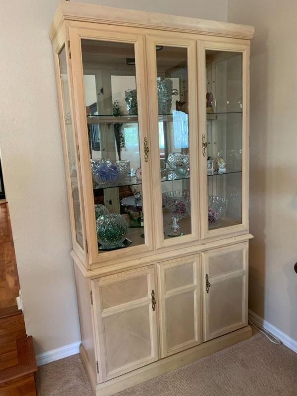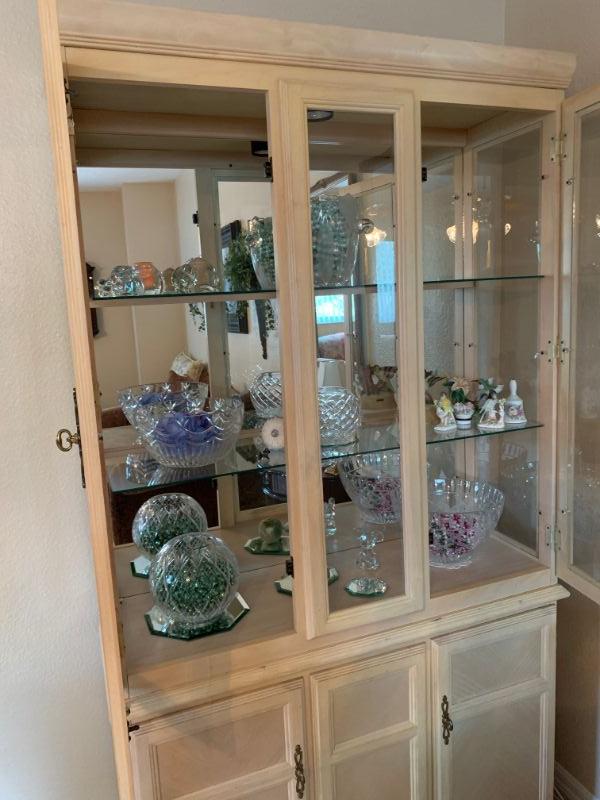Two glass doors open in the front. Two glass shelves with storage in bottom cabinet. Two pieces. Comes with accessories in cabinet.