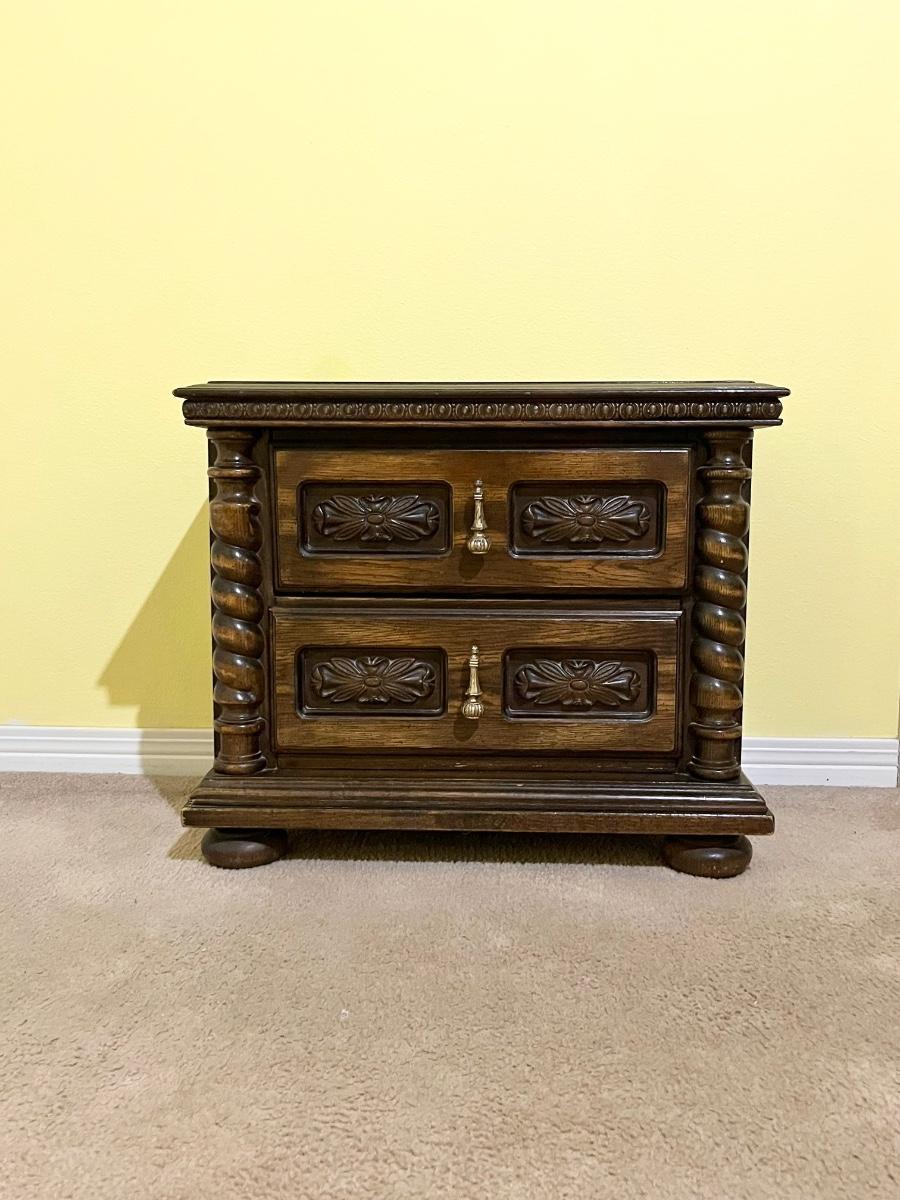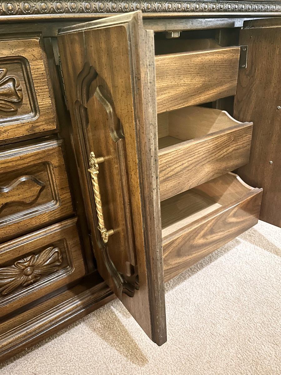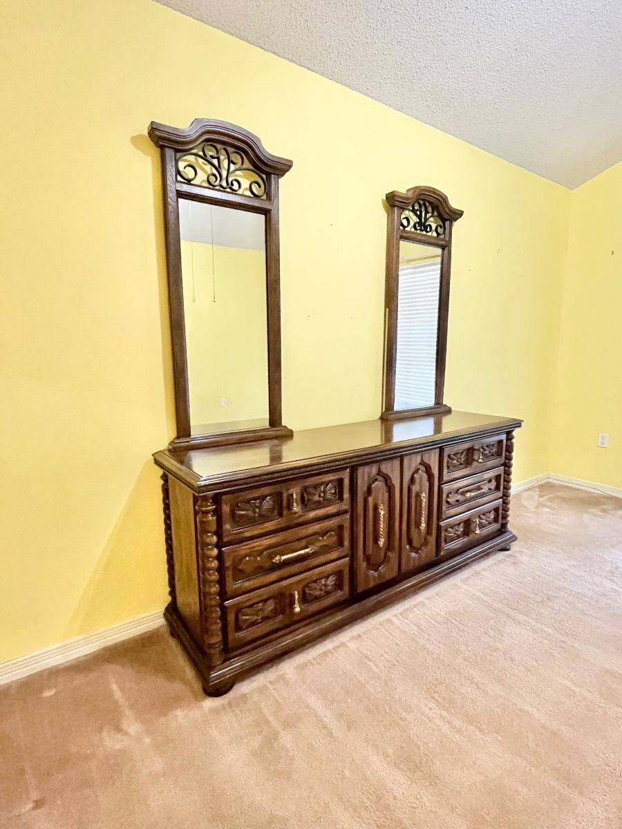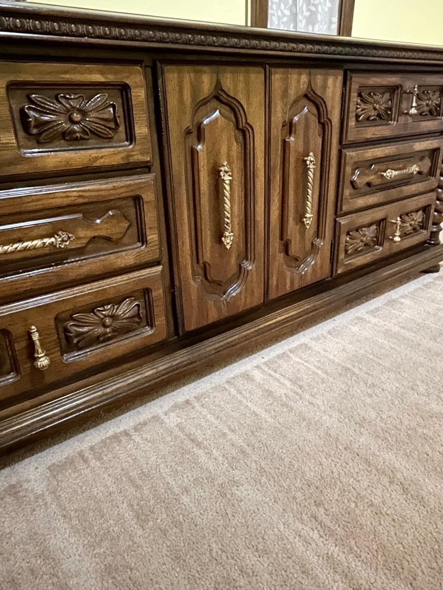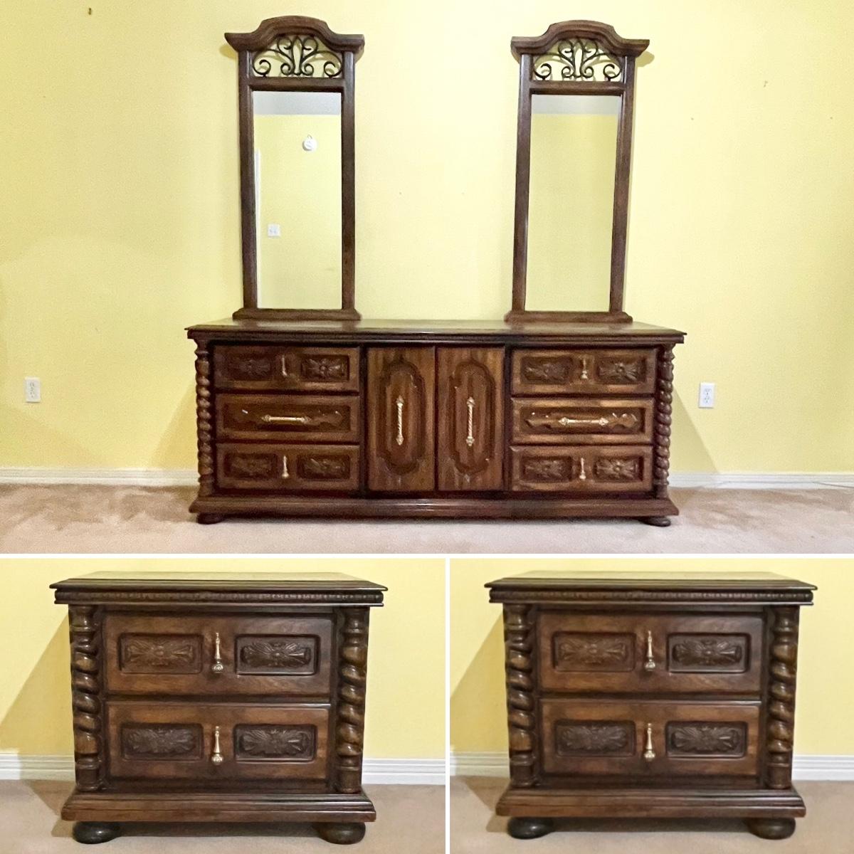 No Brand Name found~ Includes: (1) Dresser = 30” H x 75” W x 19.5” D ~ (2) Mirrors = 50” H x 22.5” W x 3” D ~ (2) Nightstands = 23” H x 27.5 W x 17” D ~ *Only one drawer on dresser, located at the bottom needs repair