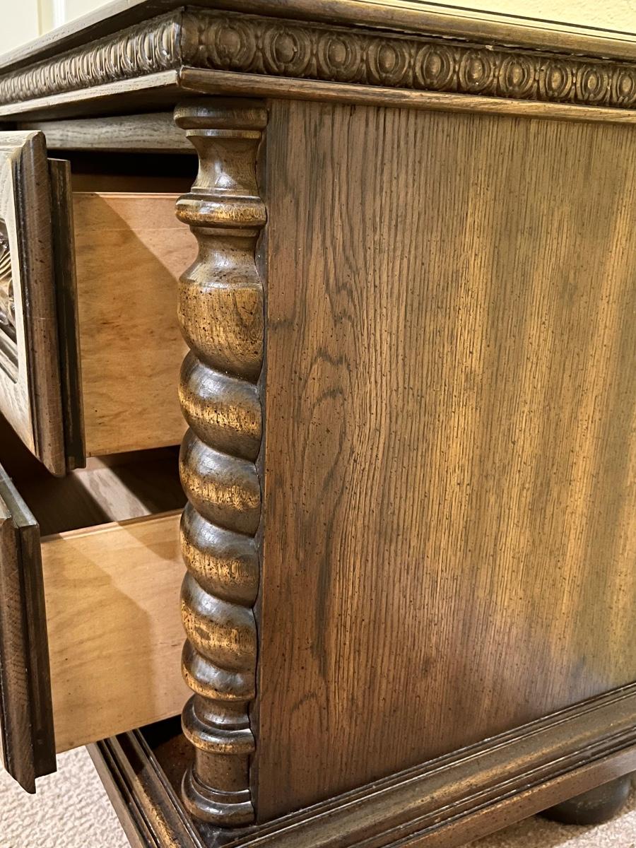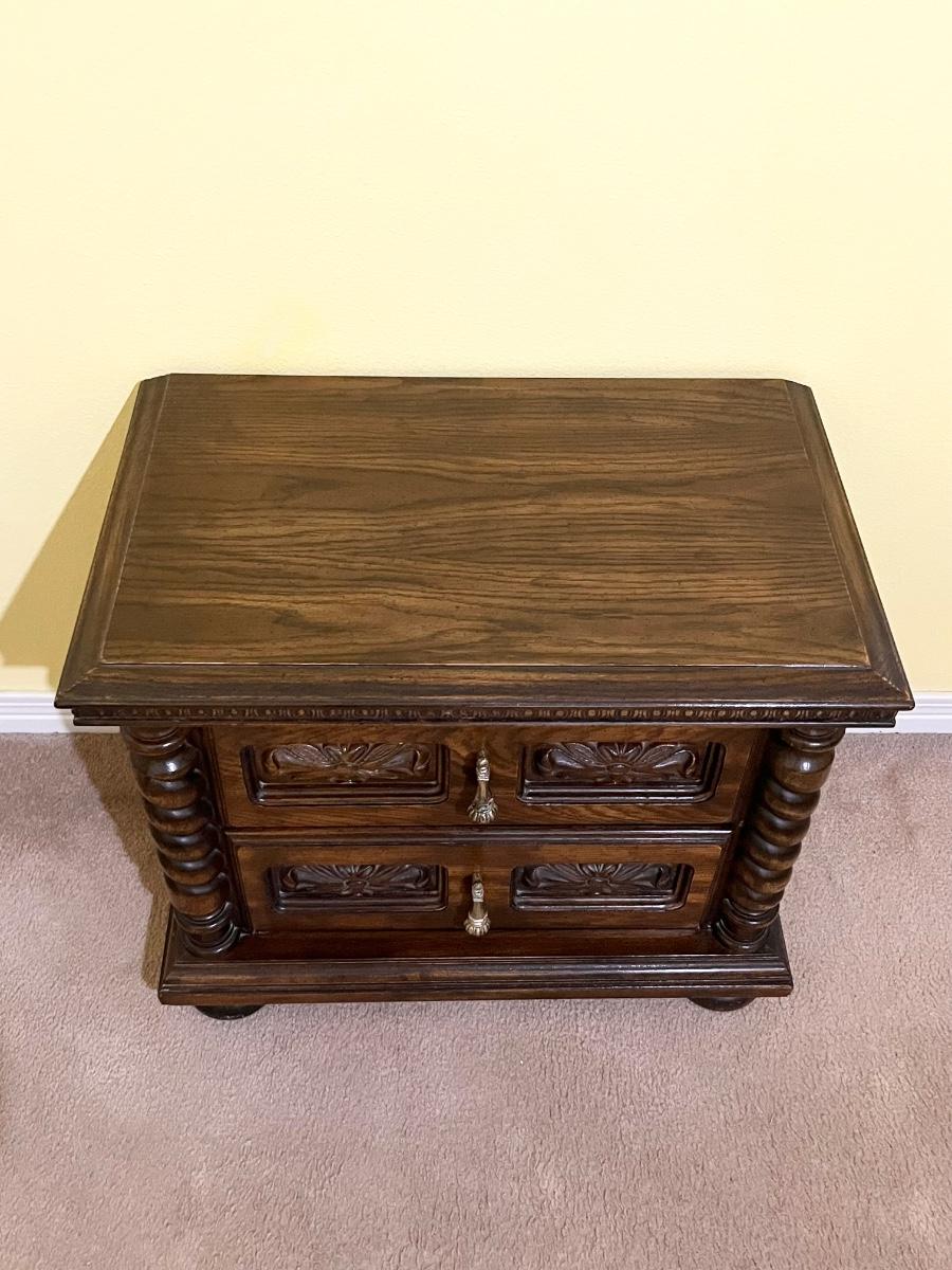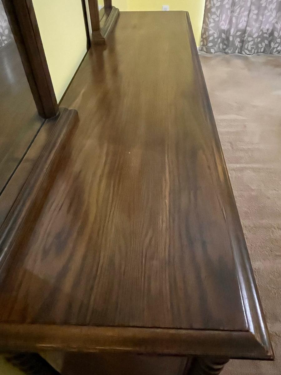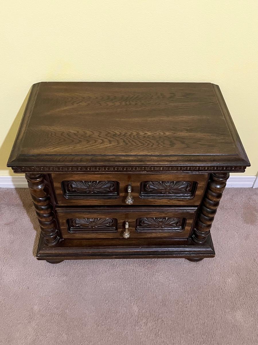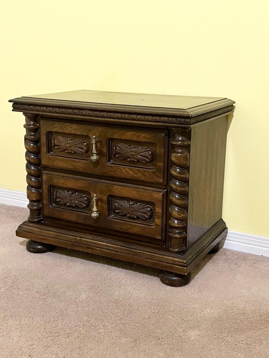 No Brand Name found~ Includes: (1) Dresser = 30” H x 75” W x 19.5” D ~ (2) Mirrors = 50” H x 22.5” W x 3” D ~ (2) Nightstands = 23” H x 27.5 W x 17” D ~ *Only one drawer on dresser, located at the bottom needs repair