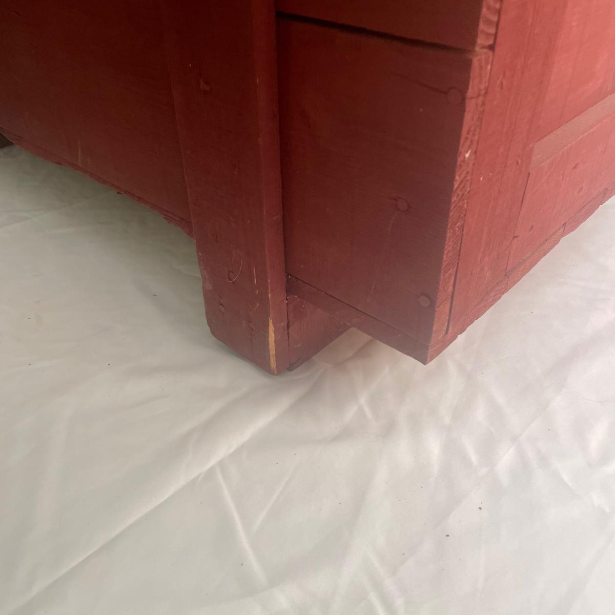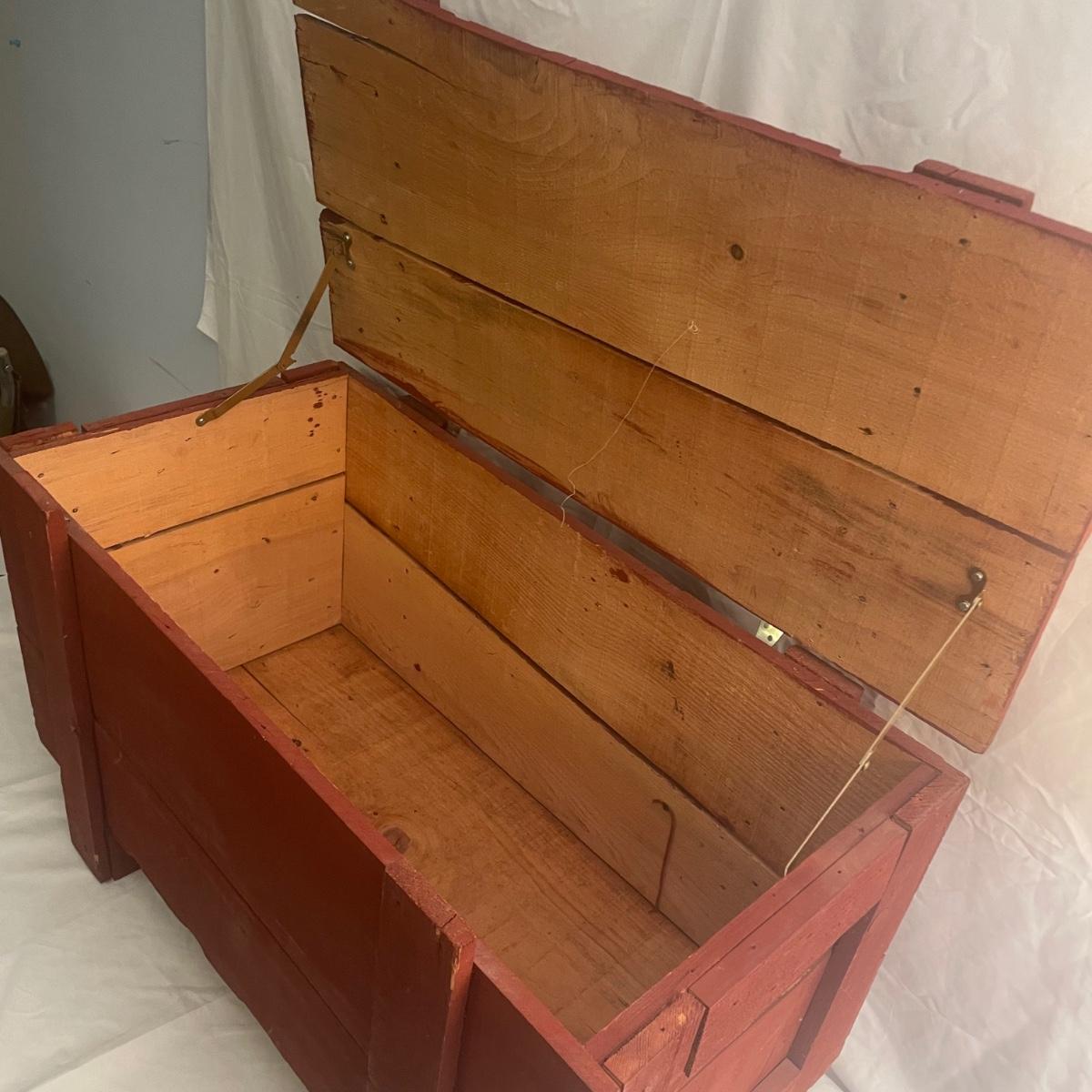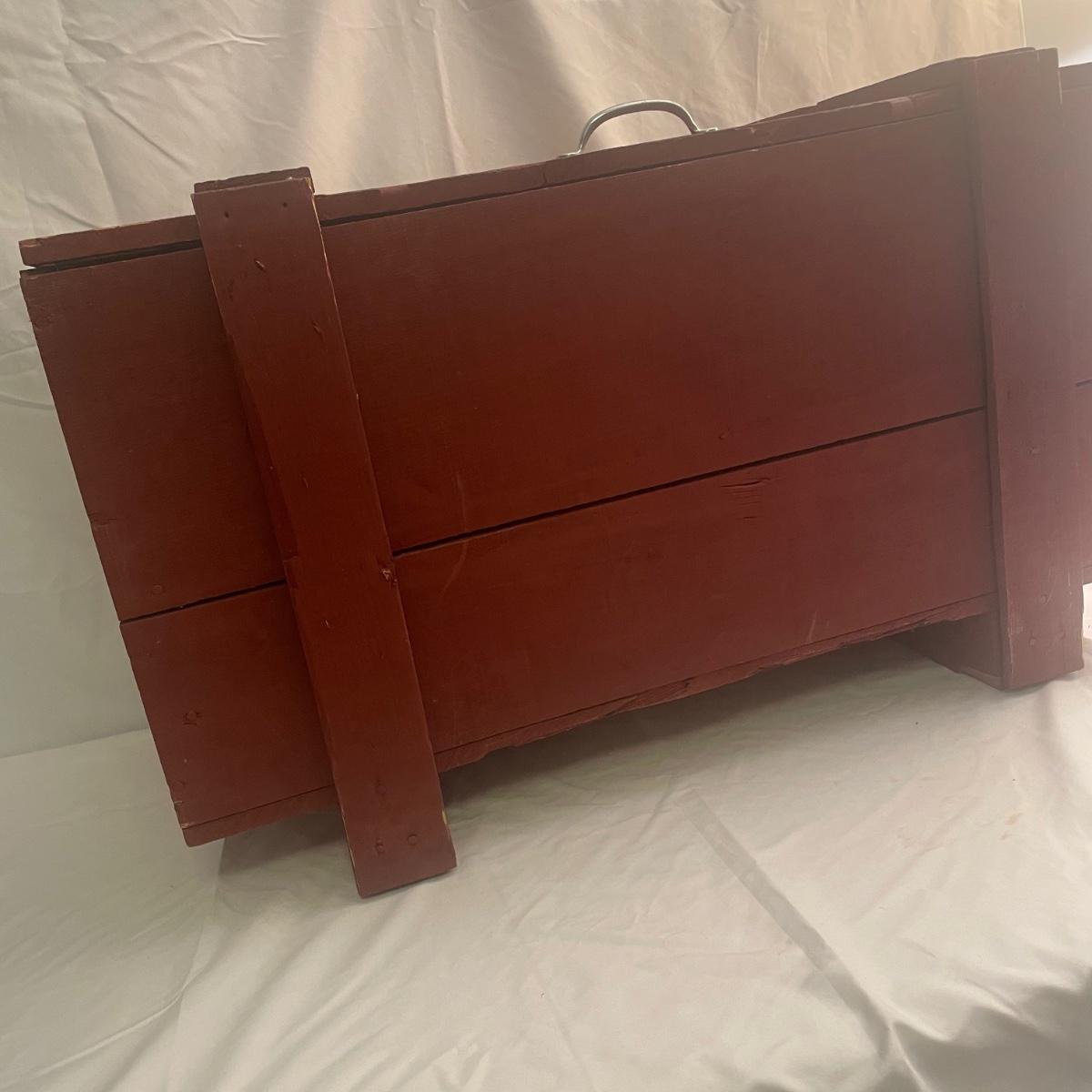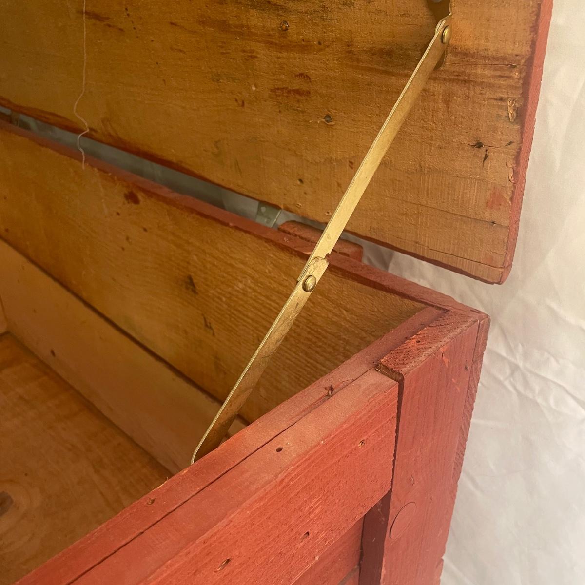 This wooden chest has been painted red and is in clean and good condition. Lid supports are brass whereas the rest of the metal hardware is newer and silver-colored.