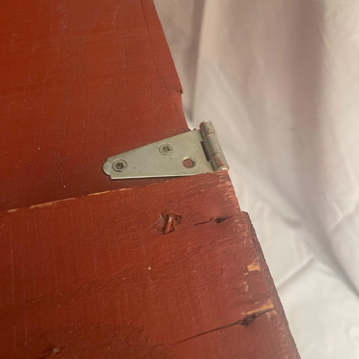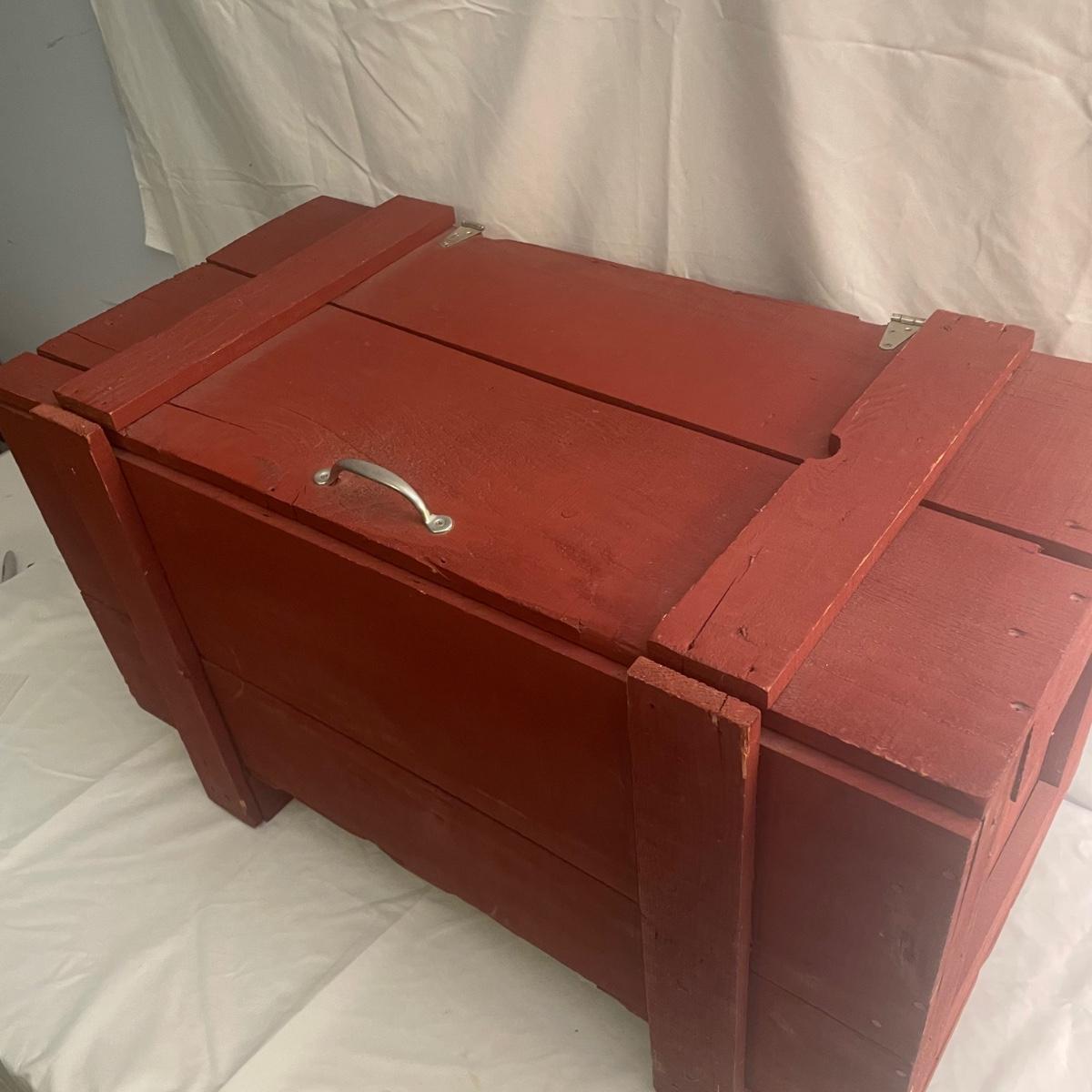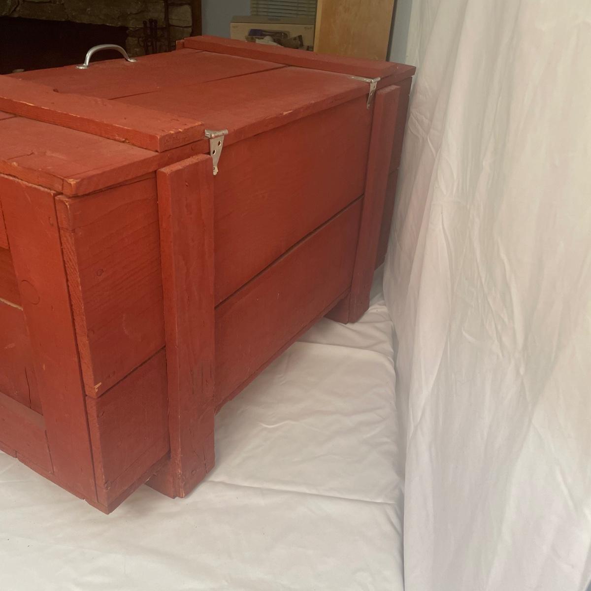 This wooden chest has been painted red and is in clean and good condition. Lid supports are brass whereas the rest of the metal hardware is newer and silver-colored.