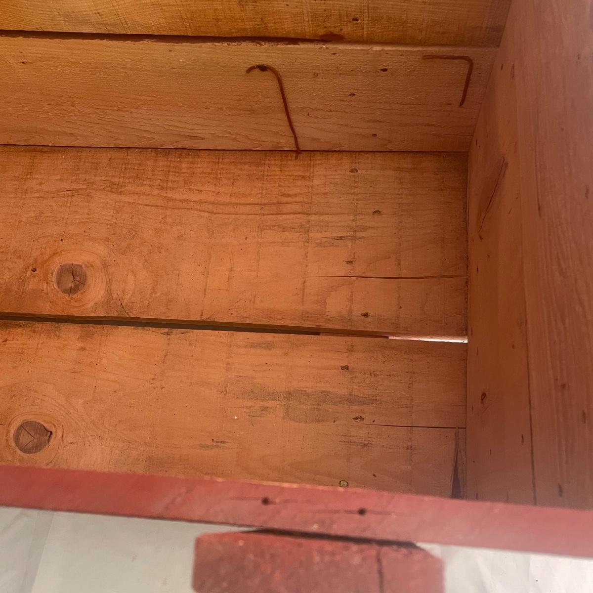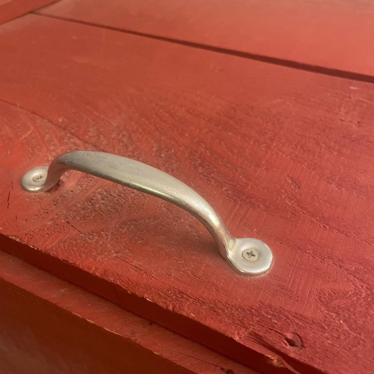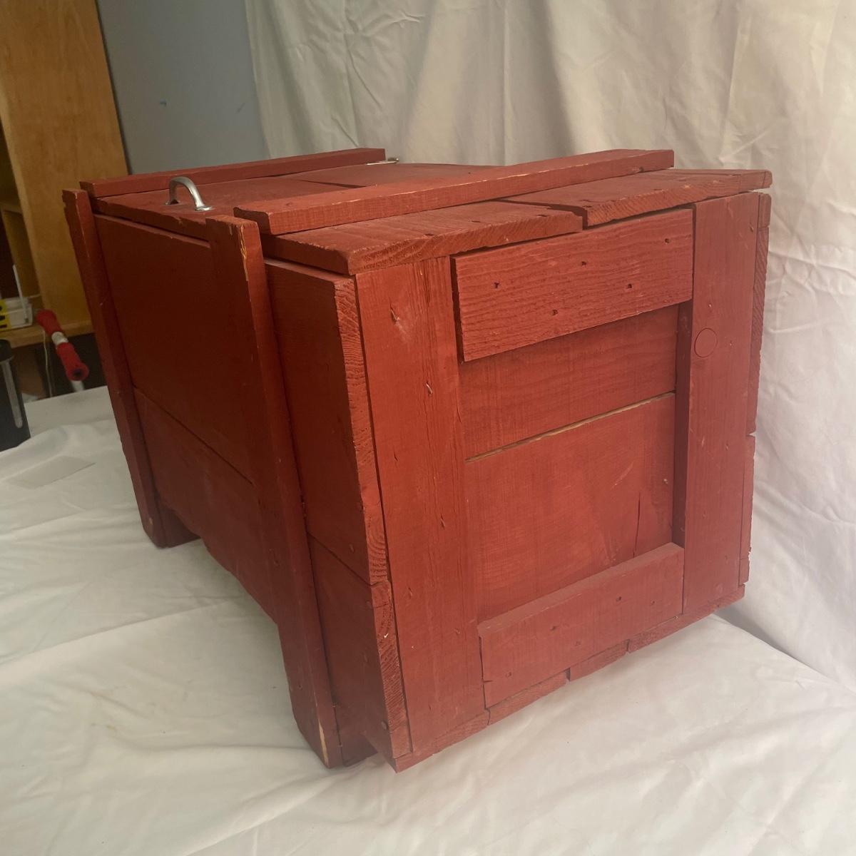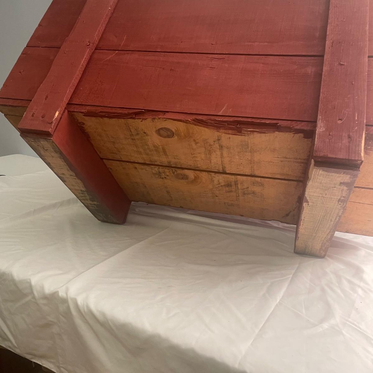 This wooden chest has been painted red and is in clean and good condition. Lid supports are brass whereas the rest of the metal hardware is newer and silver-colored.
