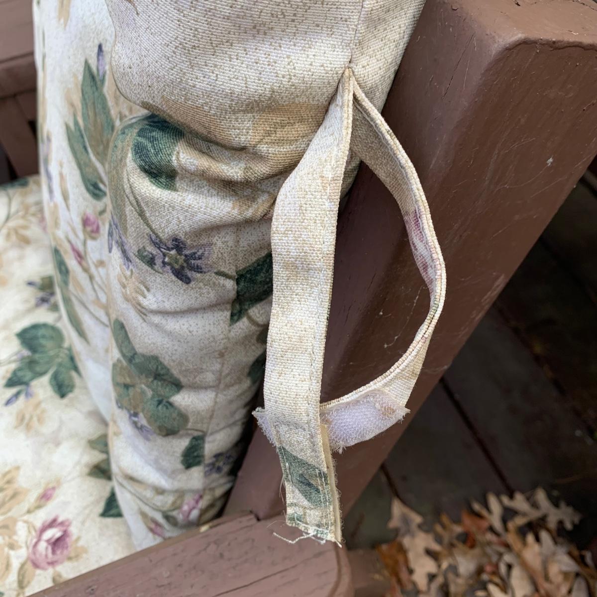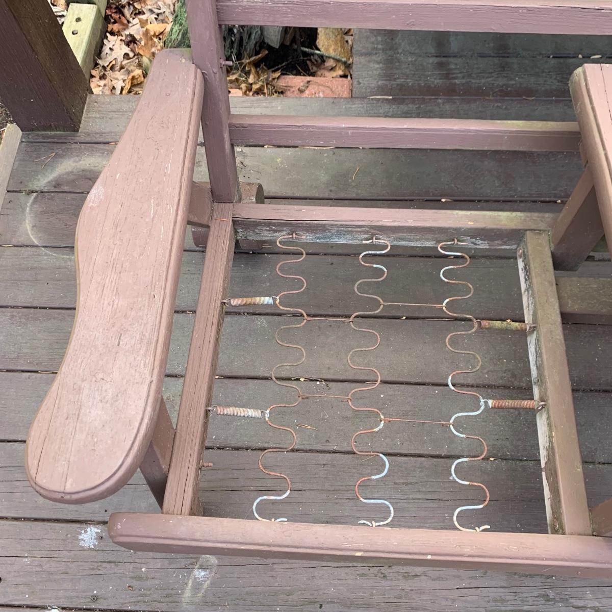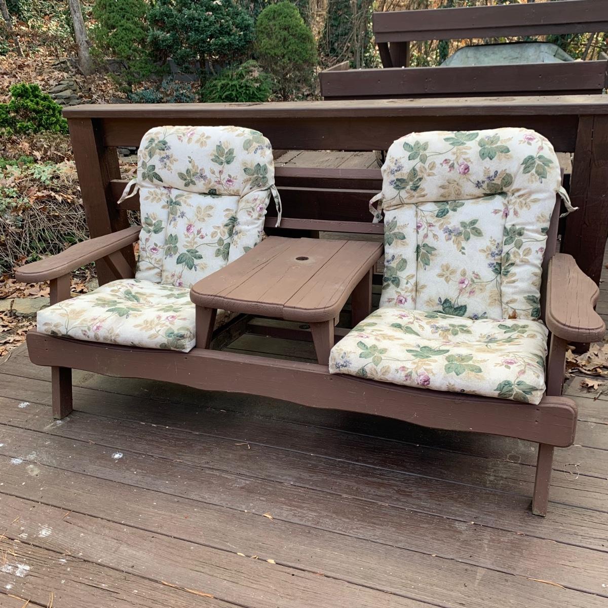 Solid wood patio bench with two spring supported seats and an attached table in the middle with a hole for an umbrella. Bench has been painted brown. A pair of seat cushions is included. The two back legs have wooden wheels attached. The bench is very solid and sturdy. Some wear and paint chipping is apparent from outdoor use. Bench measures approximately 71” x 32” x 30”H. The seat height without the cushions is 13.5”.