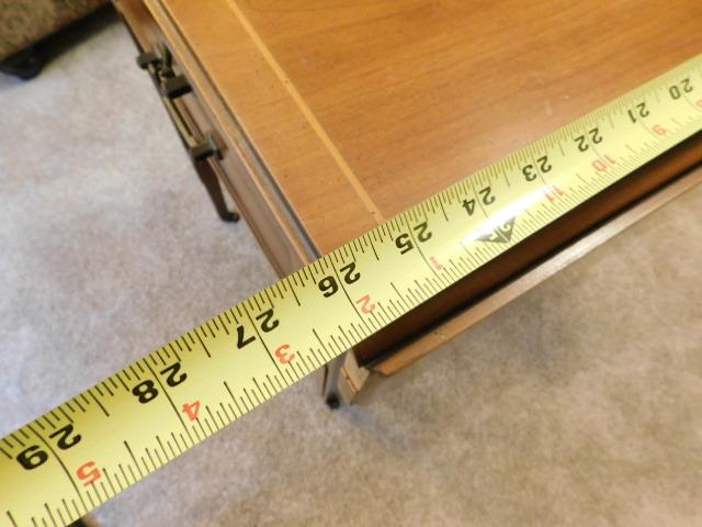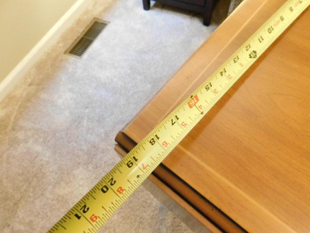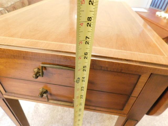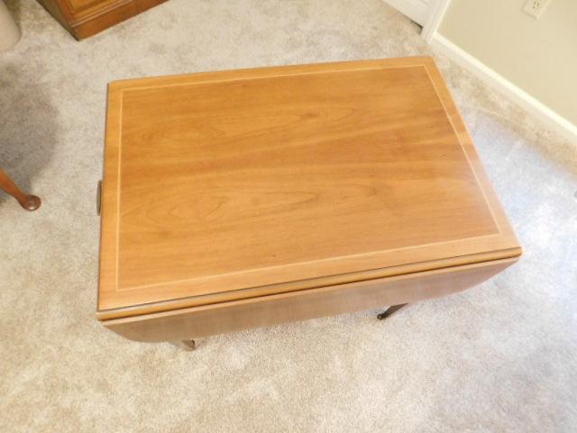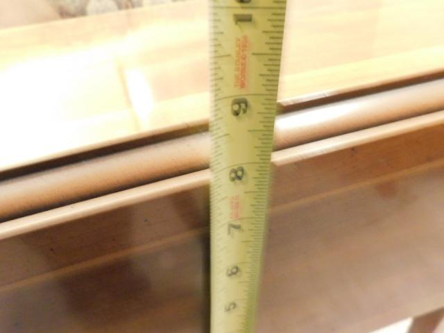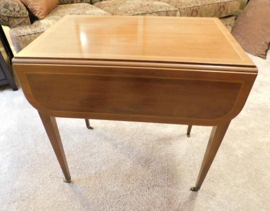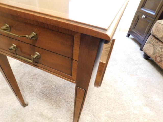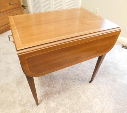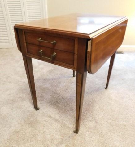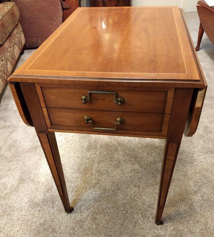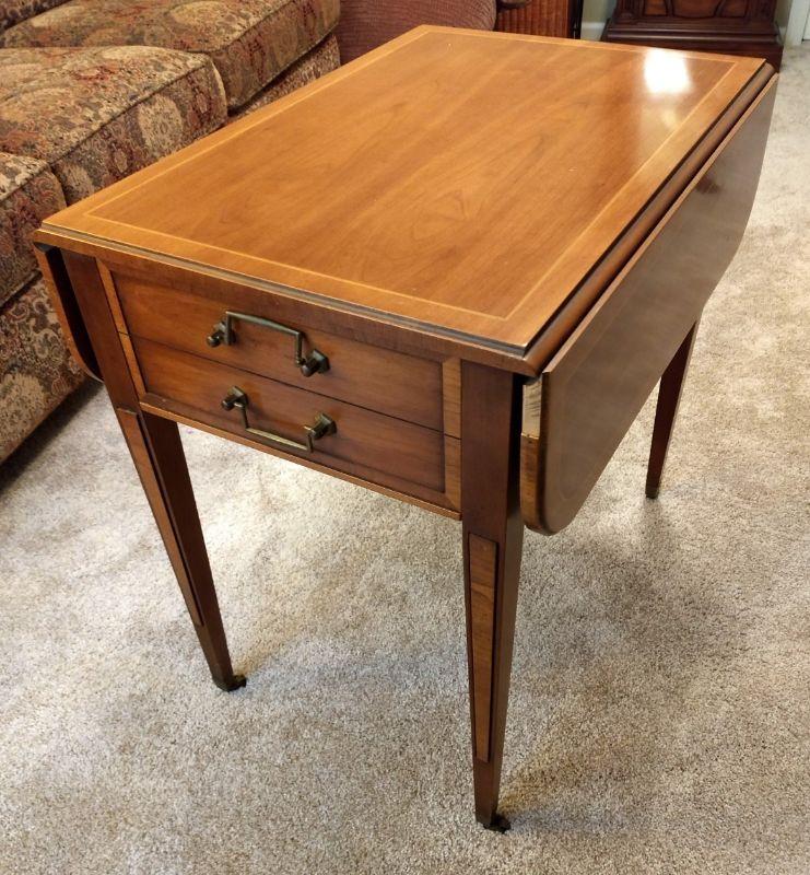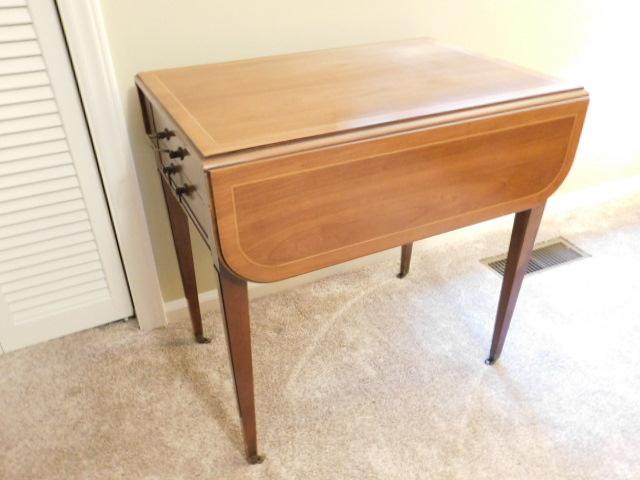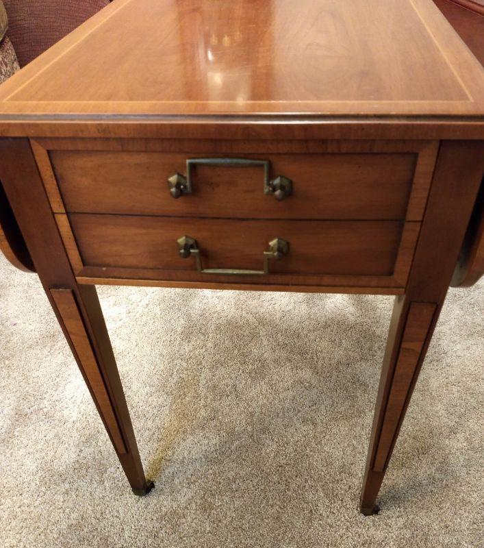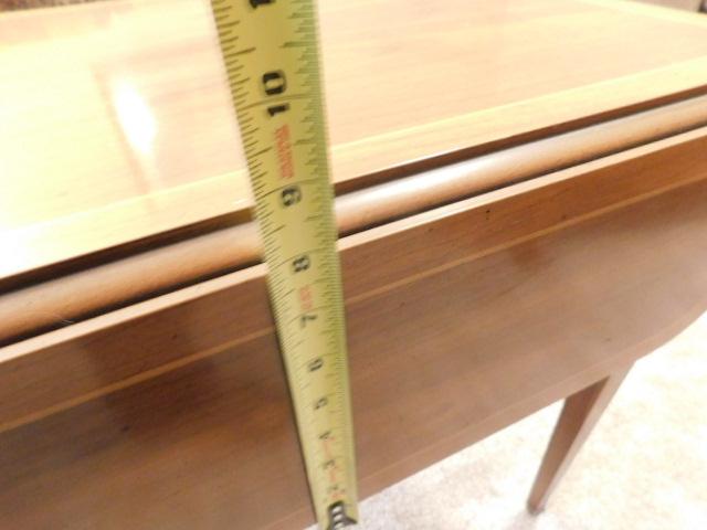 Solid Wood Pembroke Drop Leaf Side Table with Drawer 26"x18"x26" has a small delamination on drop leaf as shown. Missing piece is available for repair. Main floor