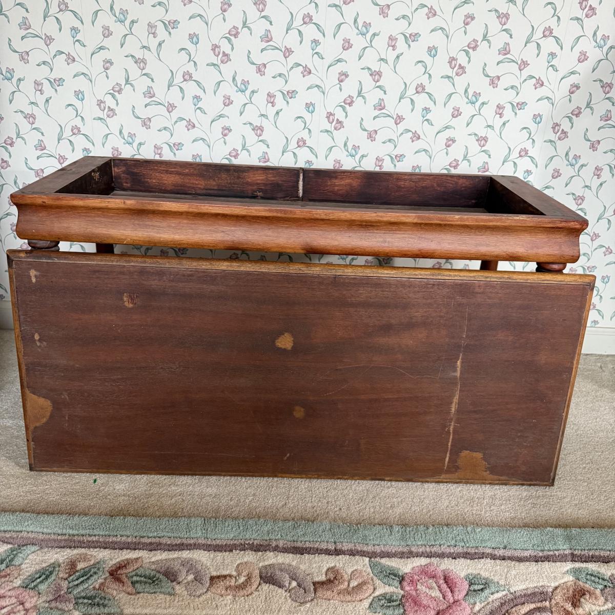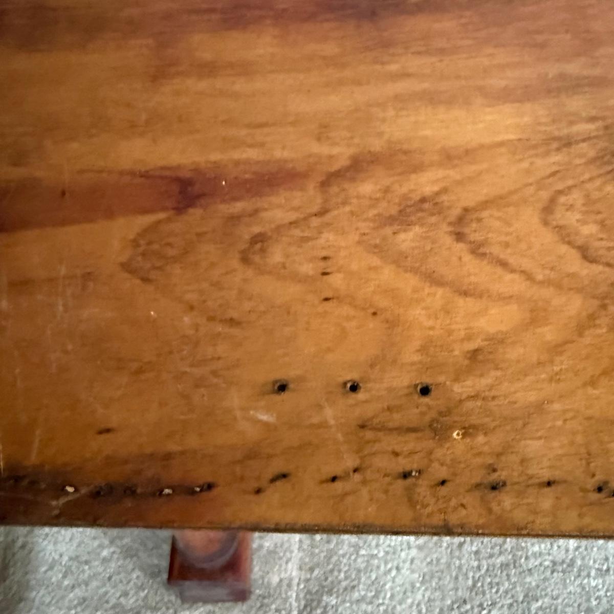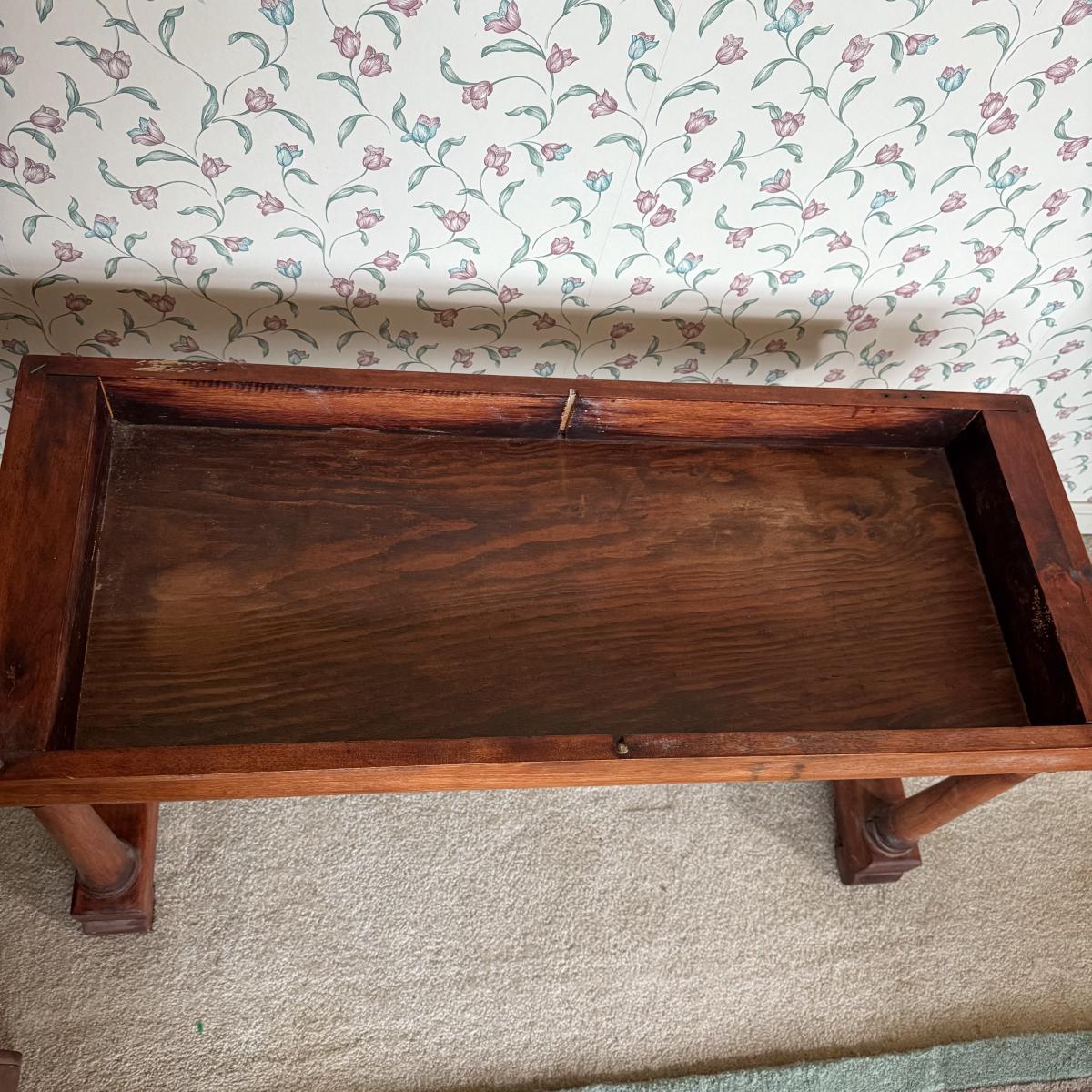 This lot contains a sunning solid wood piano bench. The lid to the bench is not secured to it and does come off. It measures 38” x 16” x 20.5”H. There are some small scrapes on the corners and edges, see pictures for details. Local pick up only.