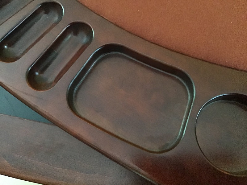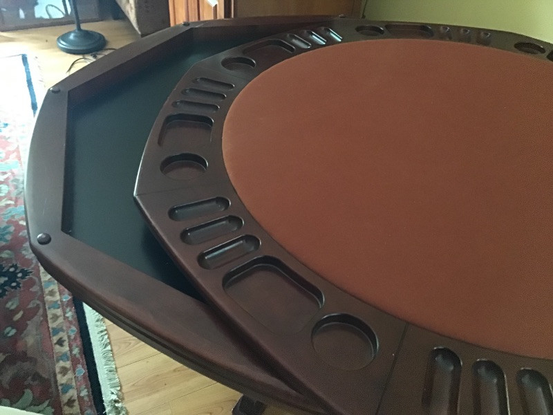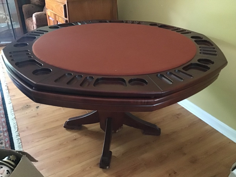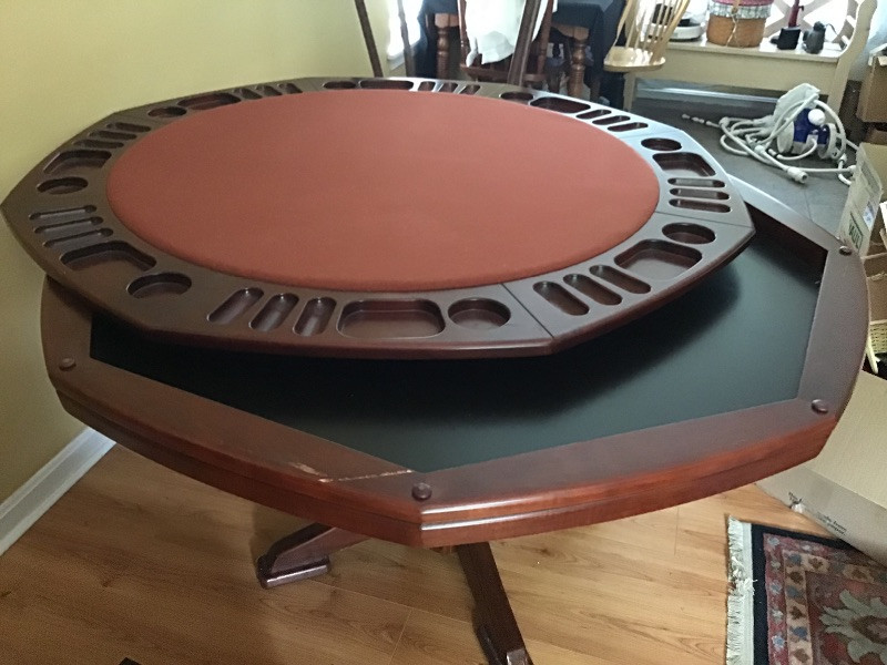 SOLID WOOD POKER/DINING TABLE. FLIP POKER TOP OVER FOR SOLID FLAT TABLE TOP FOR DINING. OCTAGONAL SHAPE APPROX 55 INCHES ROUND.