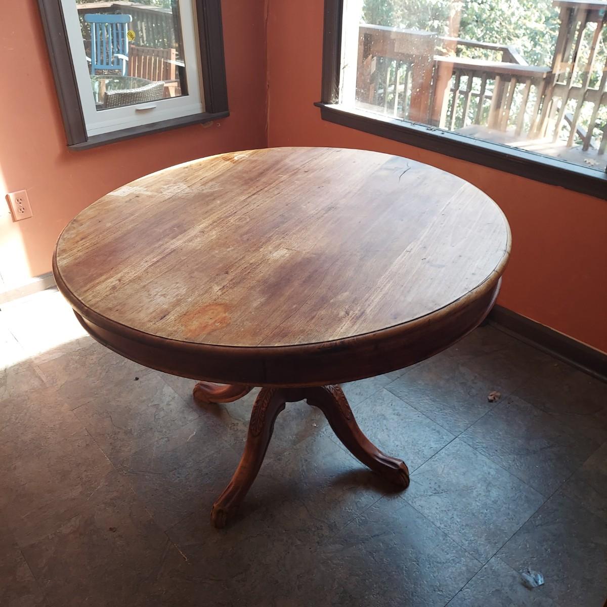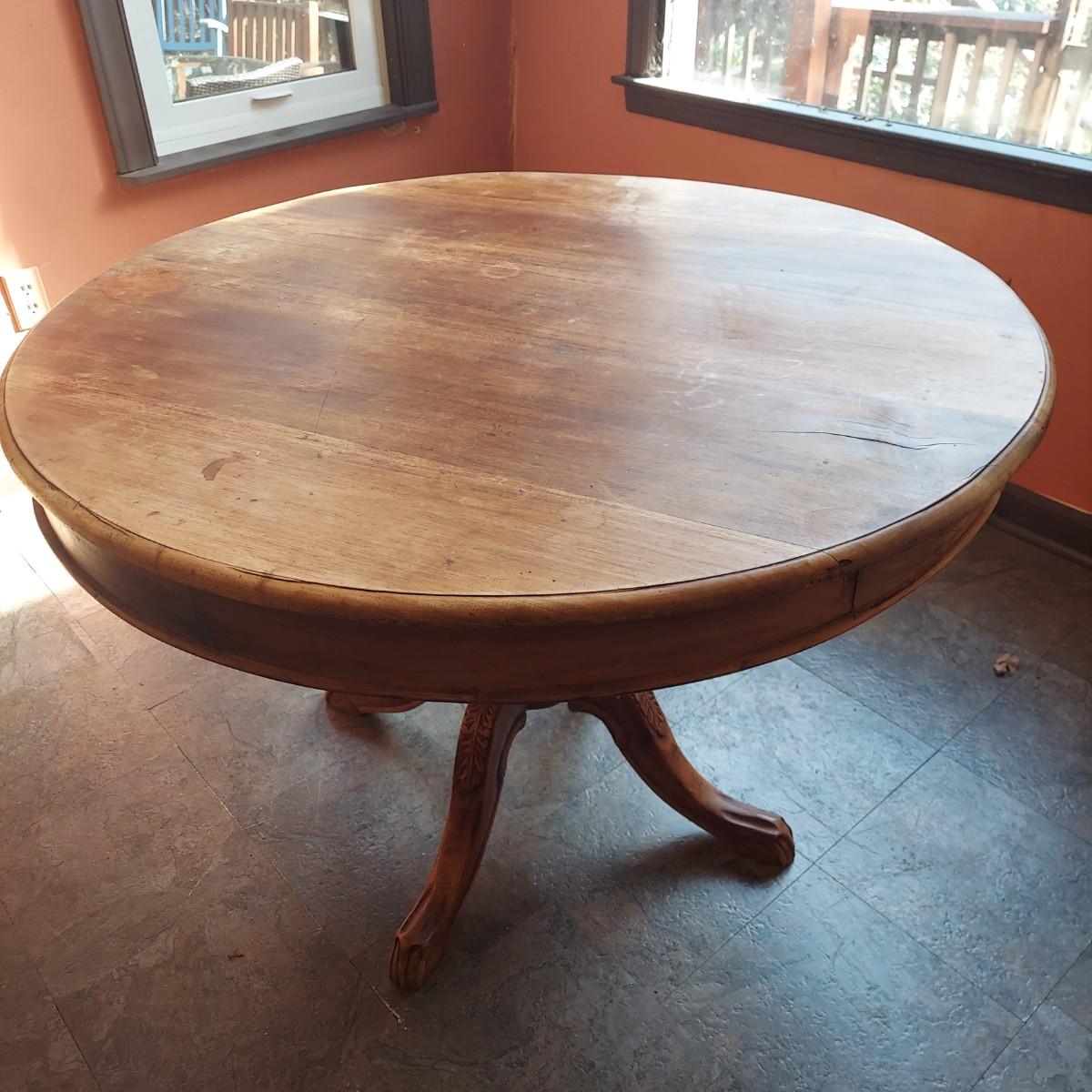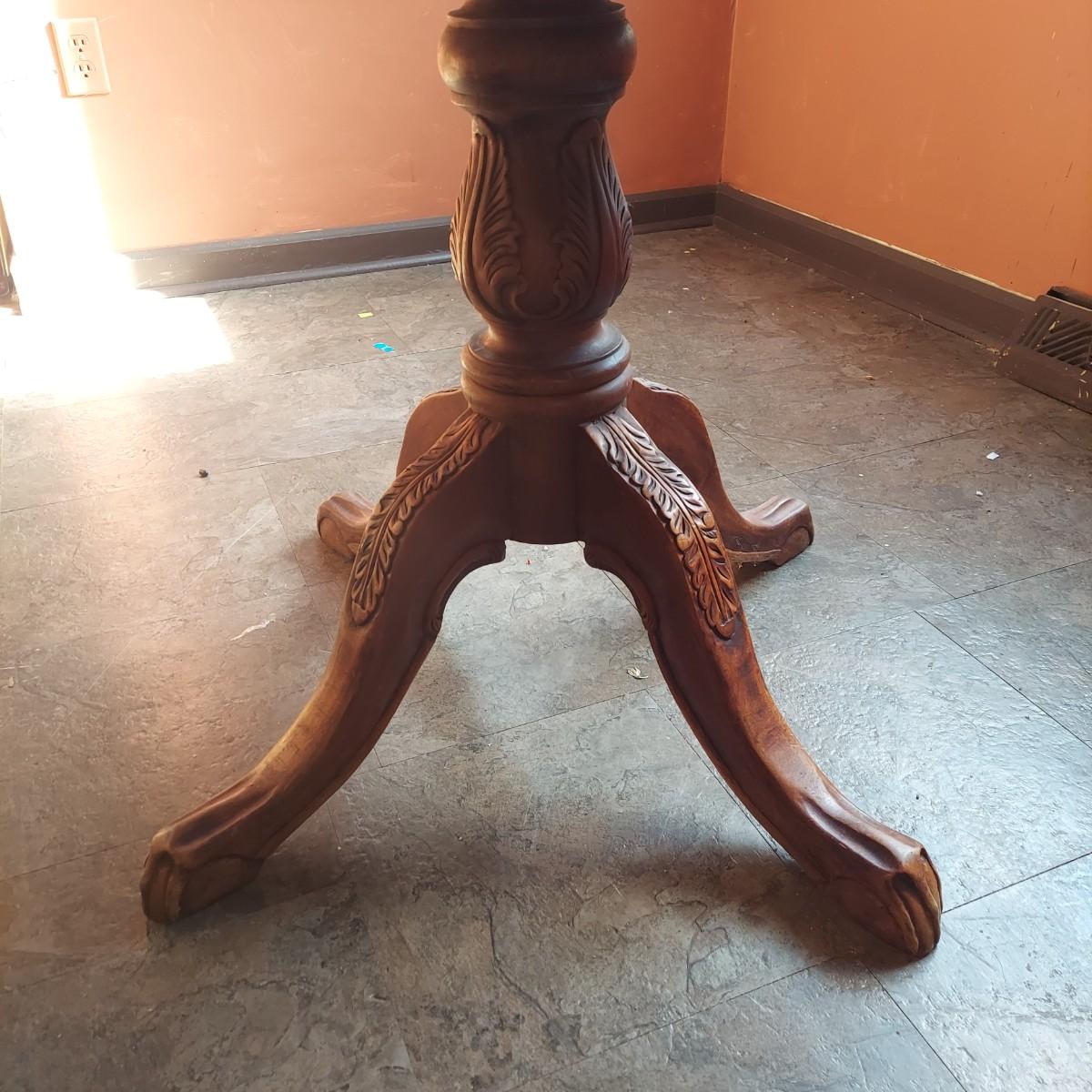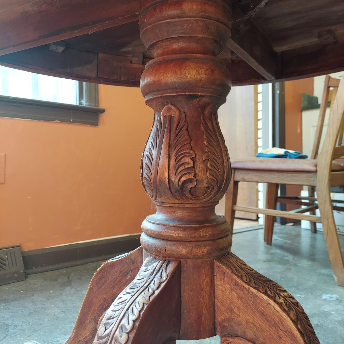 Solid wood round dining room table with carved pedestal and claw feet. Table measures 43"D x 30"H. Some condition issues on top. Please see photos for details. Local Pickup Only