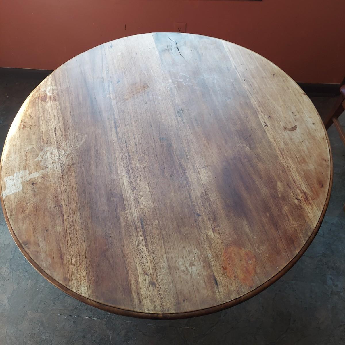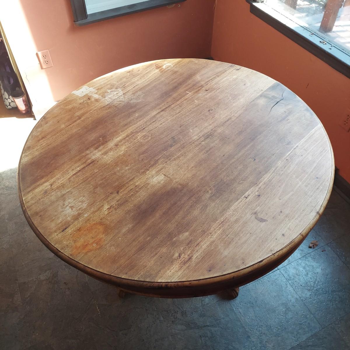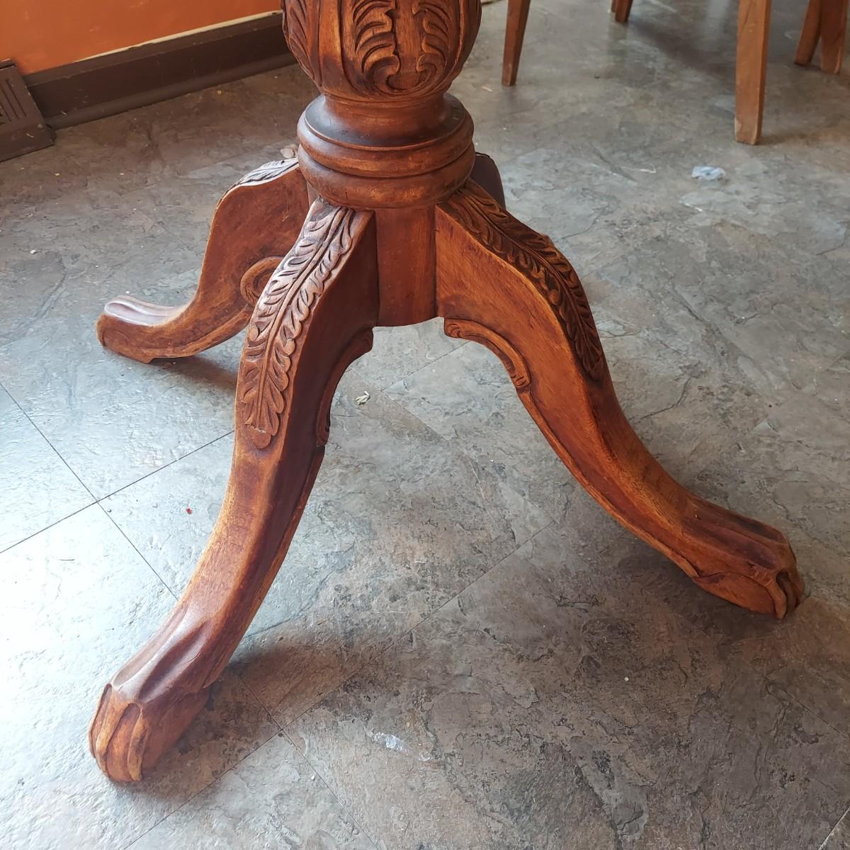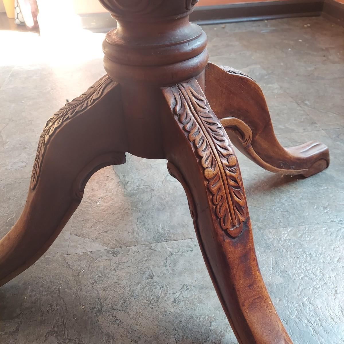 Solid wood round dining room table with carved pedestal and claw feet. Table measures 43"D x 30"H. Some condition issues on top. Please see photos for details. Local Pickup Only