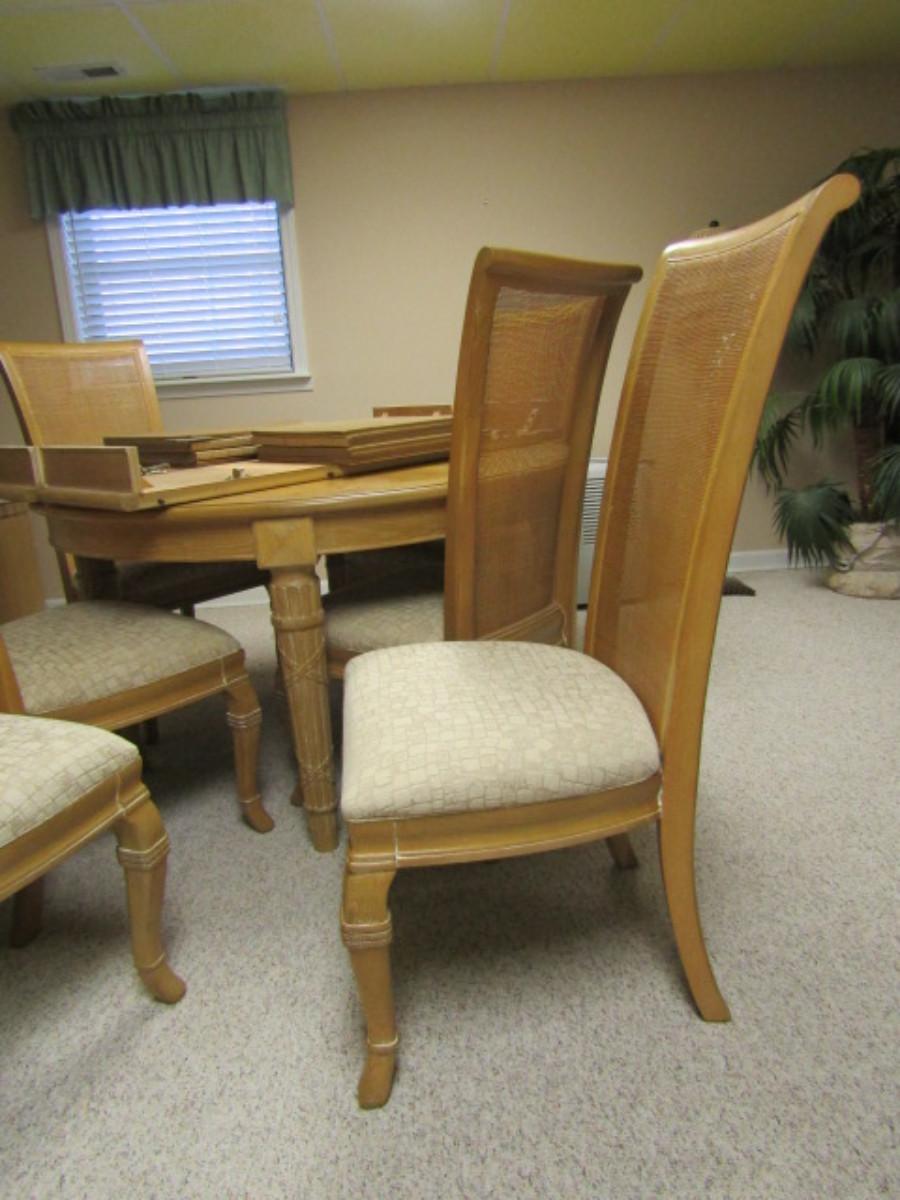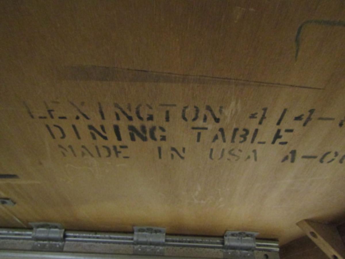 Solid Wood Round Table (54" in Diameter) with Protective Pad and Six Chairs Made by Lexington. Includes two additional leaves- each 14". In very good condition. Located downstairs- will need help with removal.
