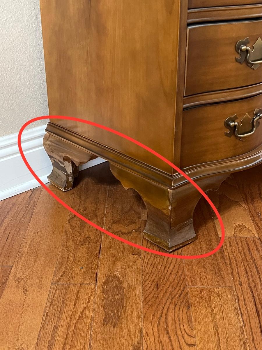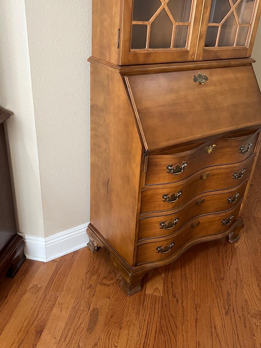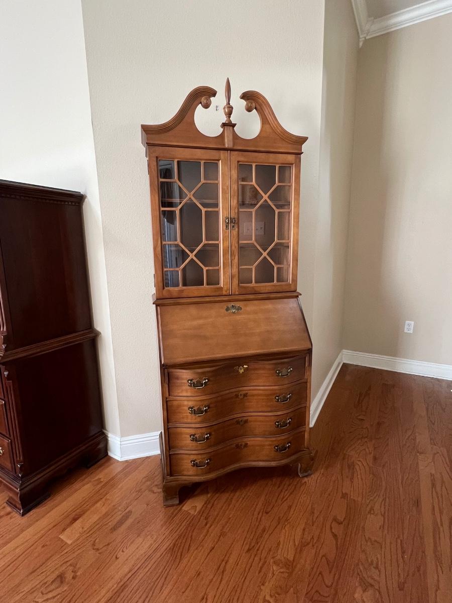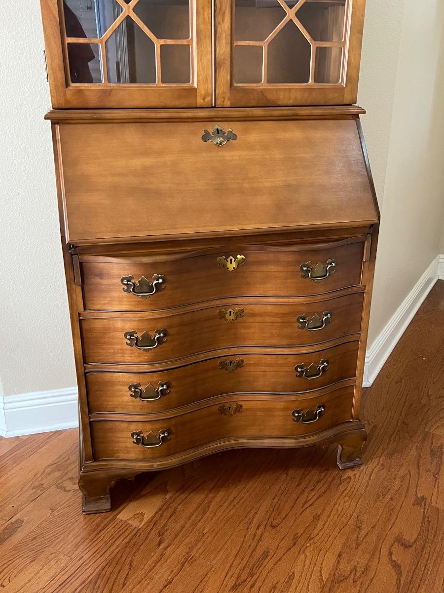This is one piece. All drawers slide in & out easily ~ No name brand found ~ Has no key ~ 79” H x 32” W x 17” D ~ Has approx 2" of minor water damage on feet. Will need a little TLC. Nothing Major, just some of the finish has faded due to the water.