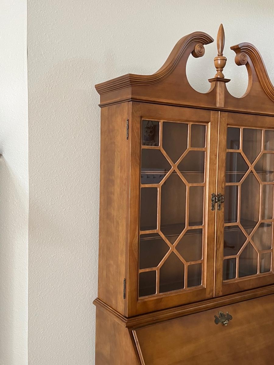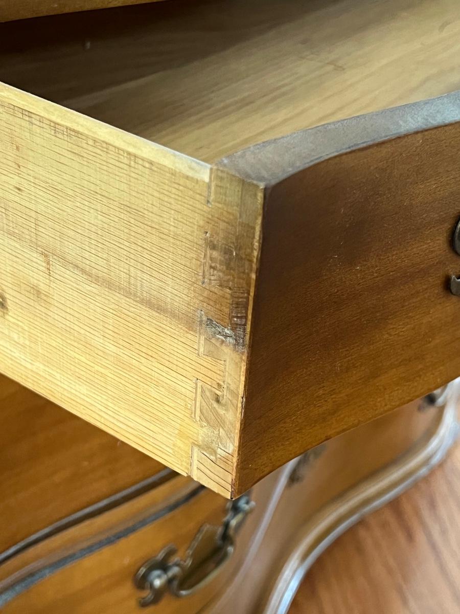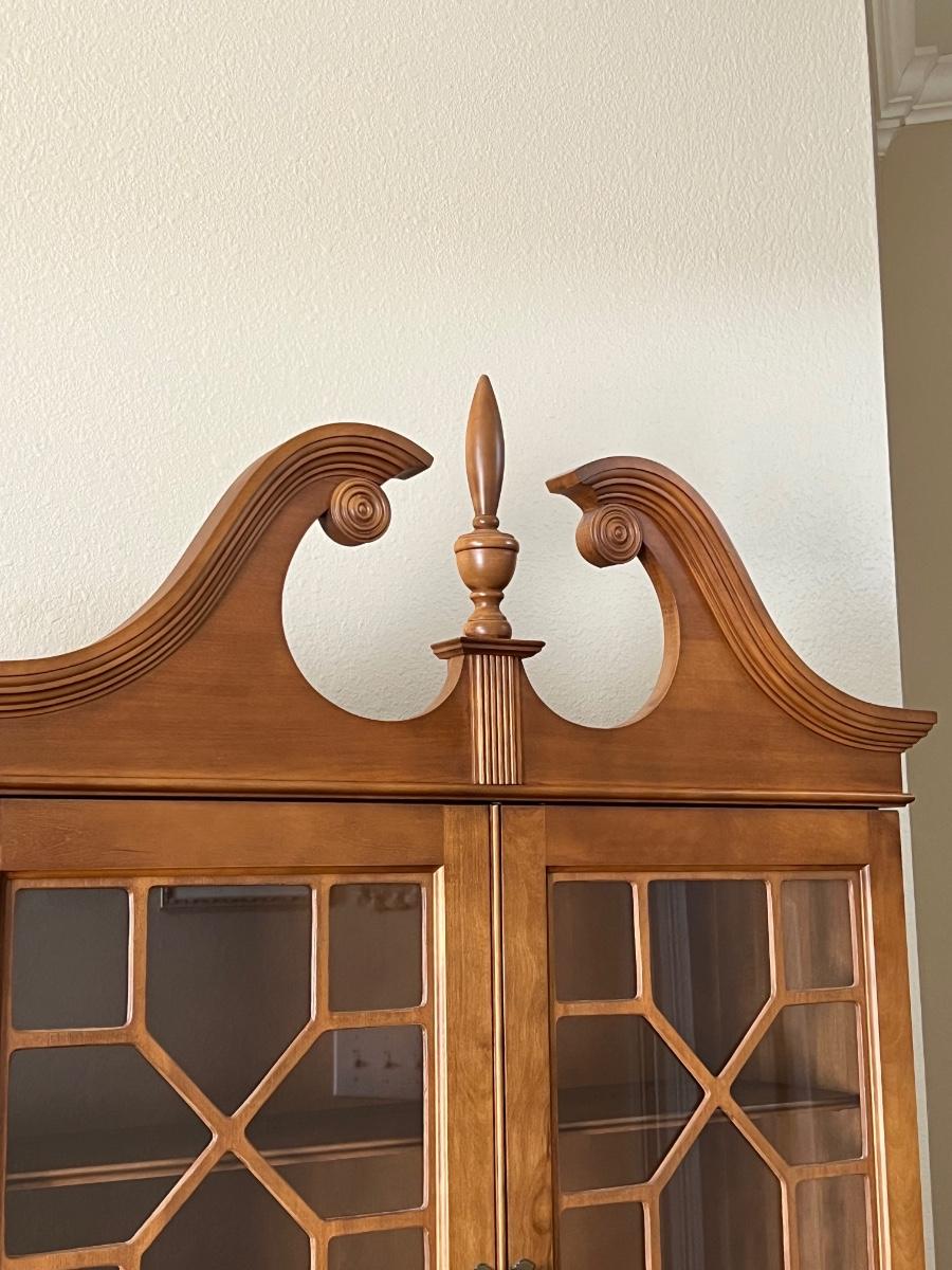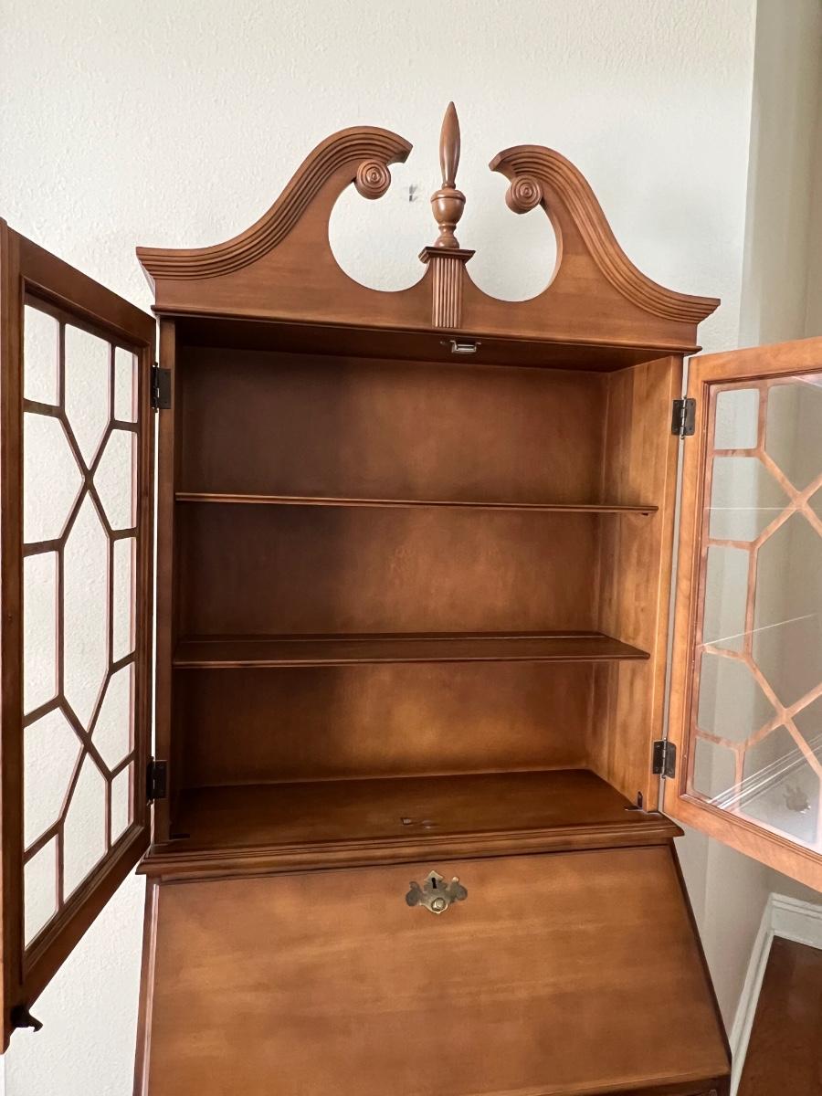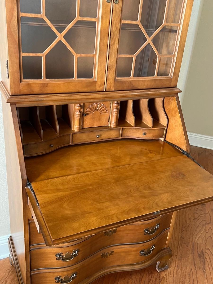 This is one piece. All drawers slide in & out easily ~ No name brand found ~ Has no key ~ 79” H x 32” W x 17” D ~ Has approx 2" of minor water damage on feet. Will need a little TLC. Nothing Major, just some of the finish has faded due to the water.