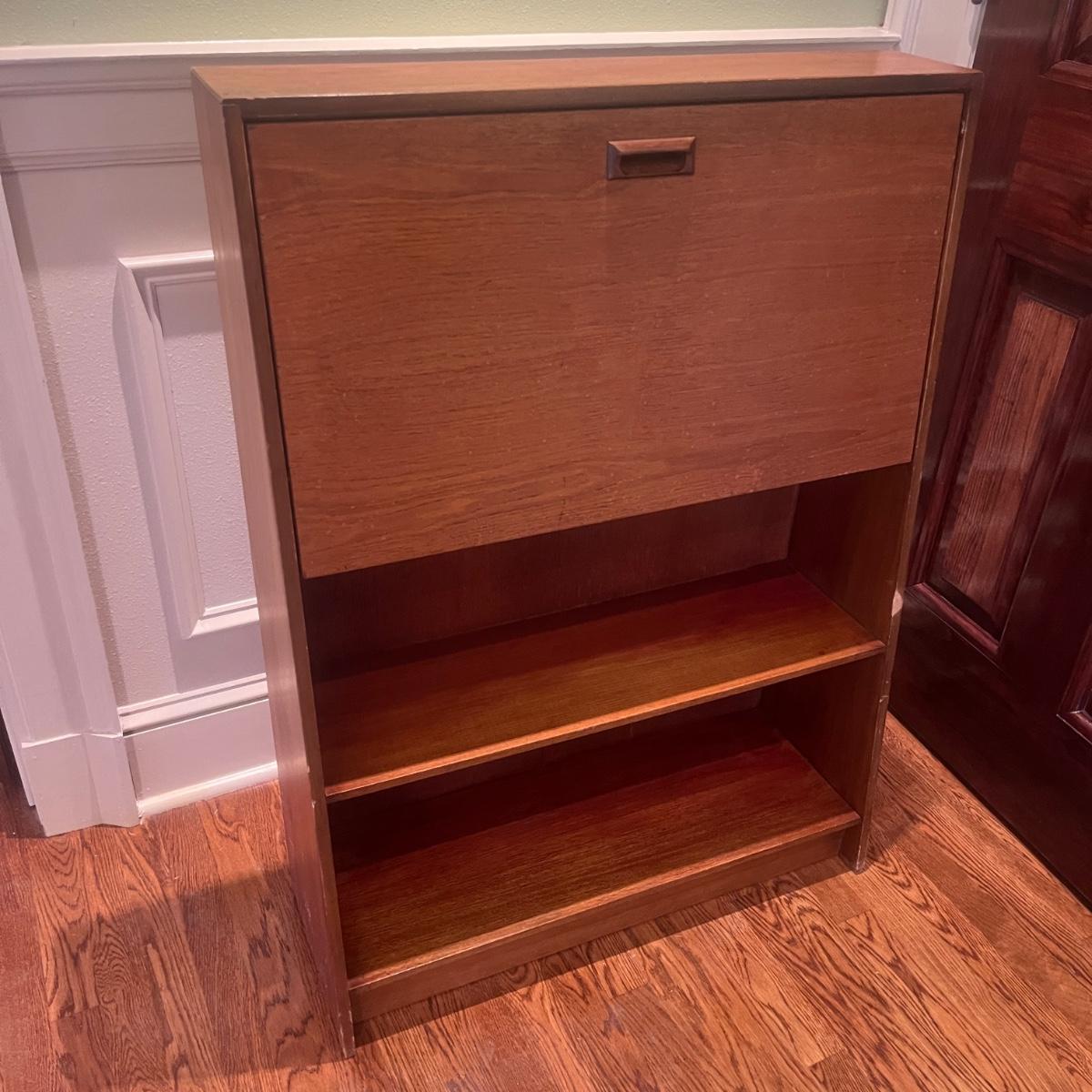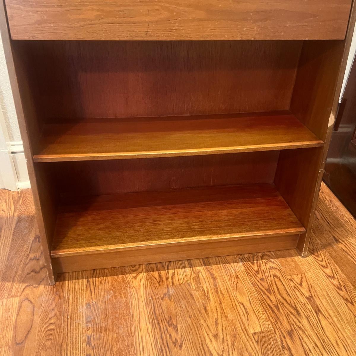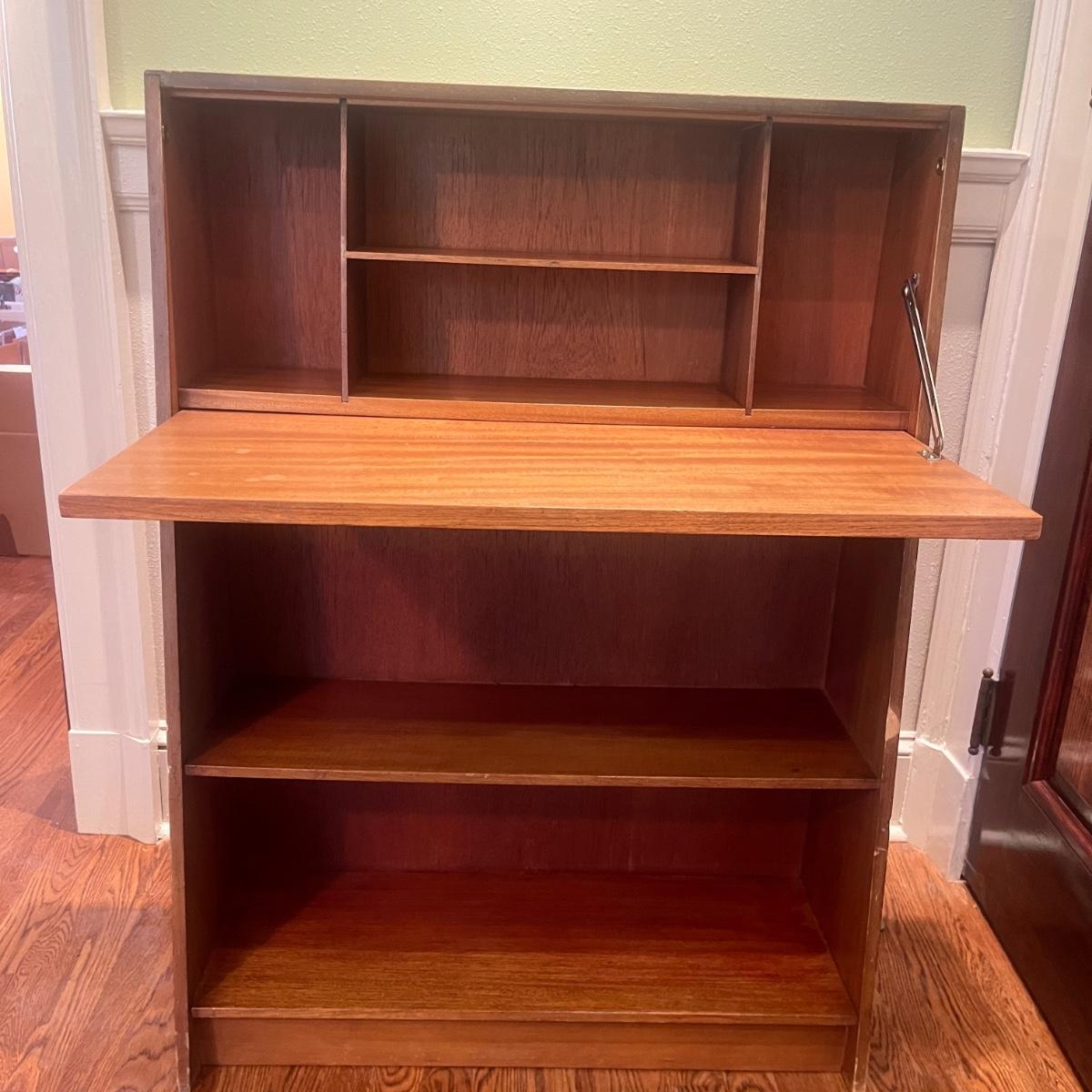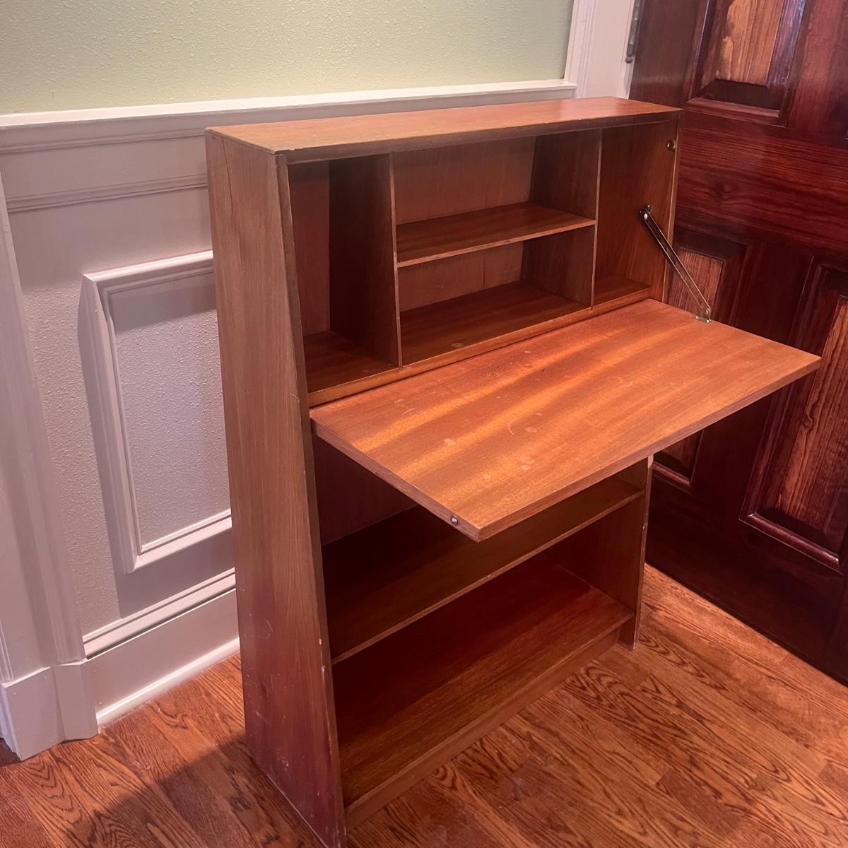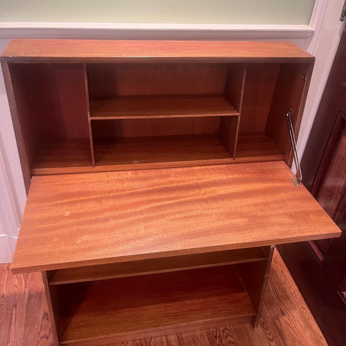 This solid wood secretary desk has a bookcase underneath in Mid Century style. Piece measures 30” x 11” x 41.5”H. Piece has scratches and nicks with one rubbed spot on the front, see pictures.