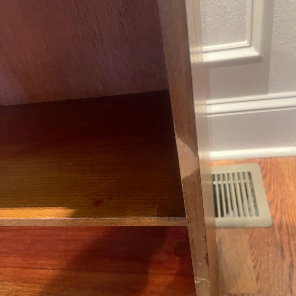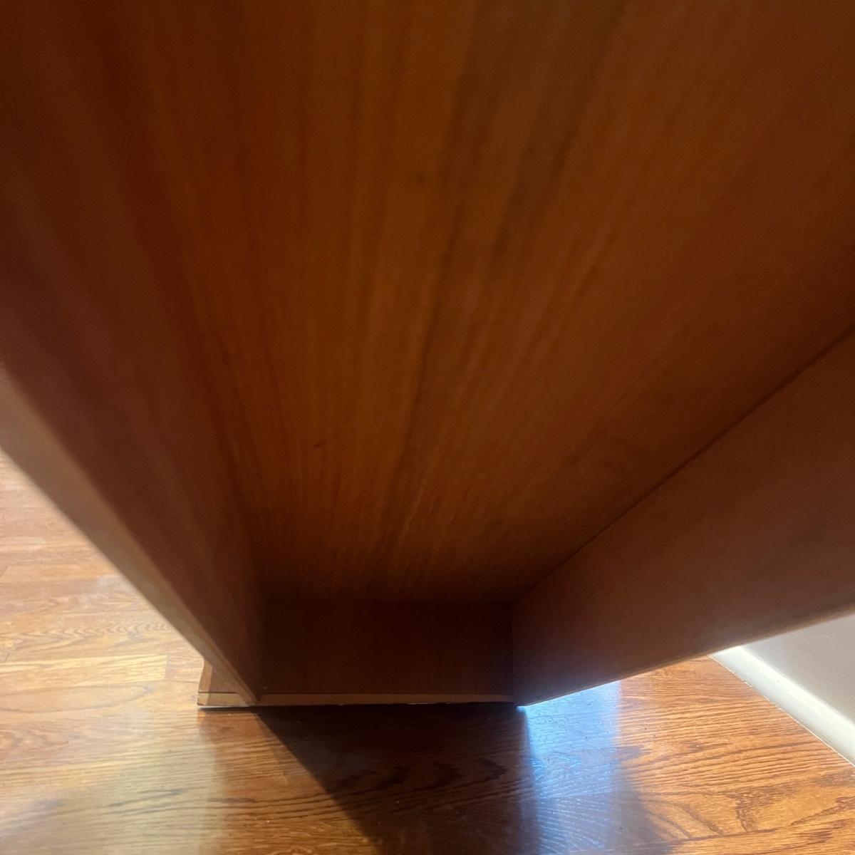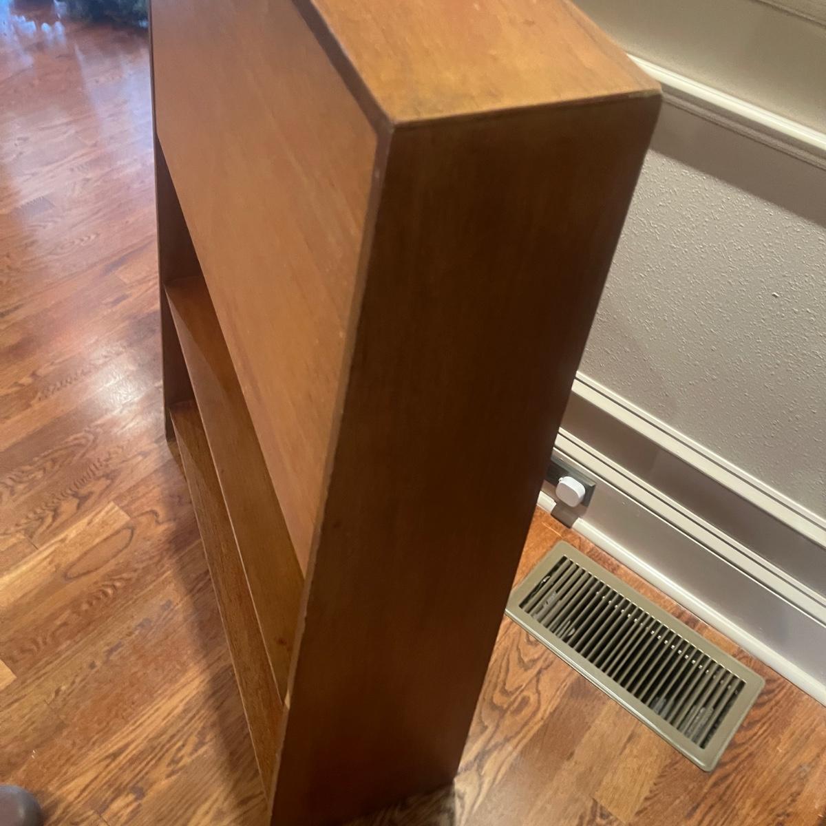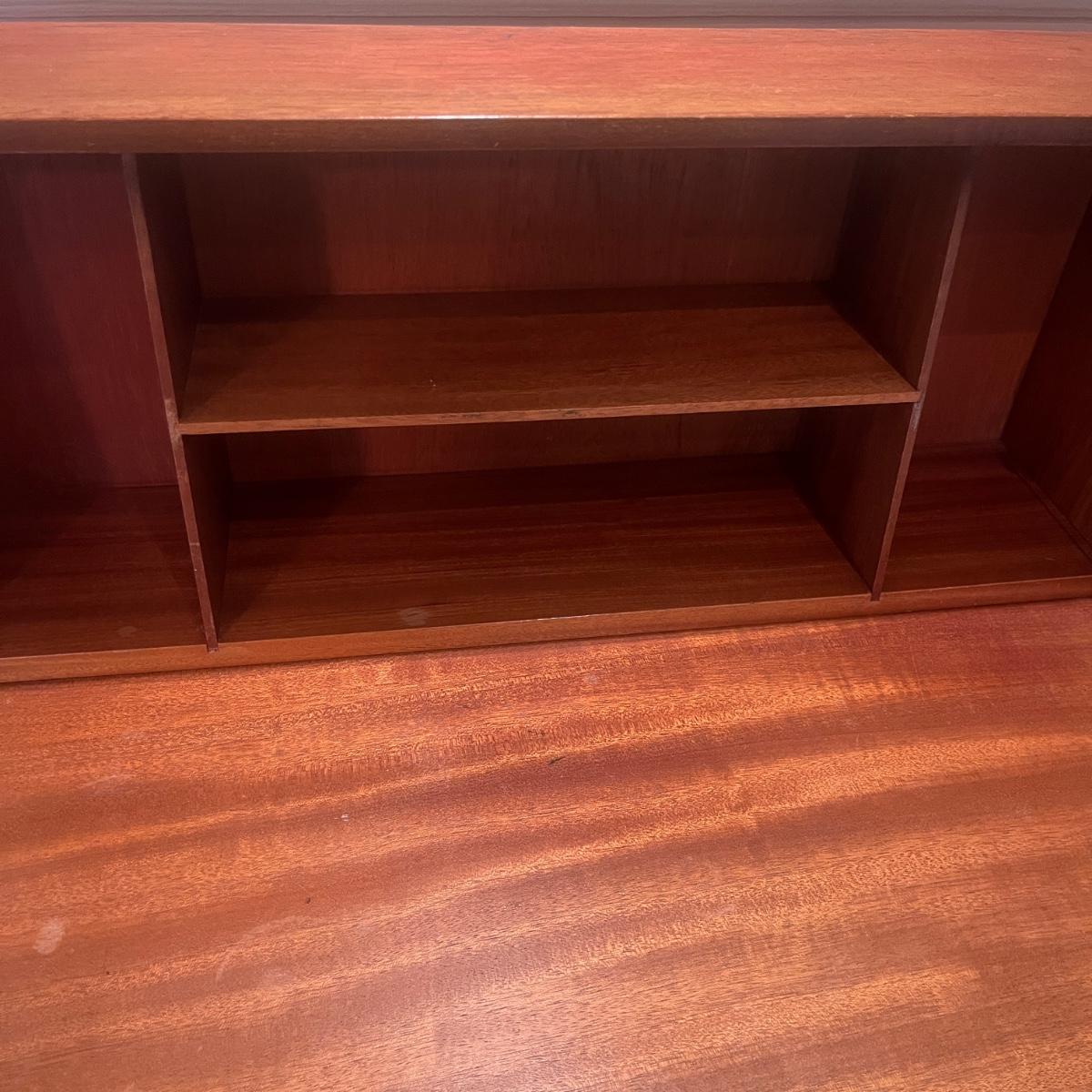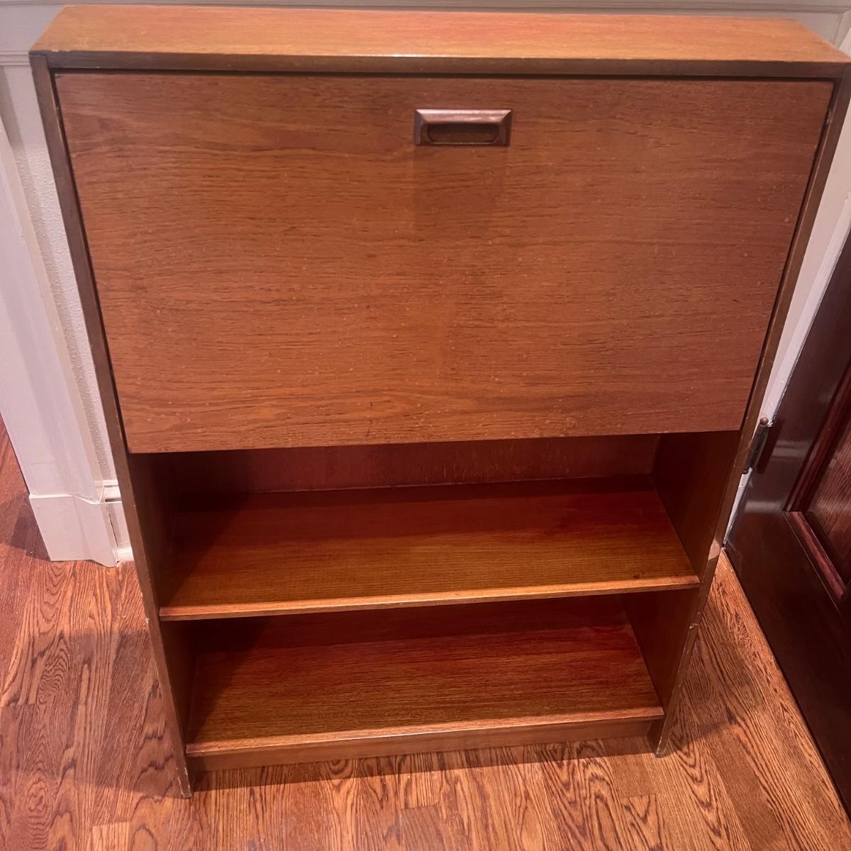 This solid wood secretary desk has a bookcase underneath in Mid Century style. Piece measures 30” x 11” x 41.5”H. Piece has scratches and nicks with one rubbed spot on the front, see pictures.