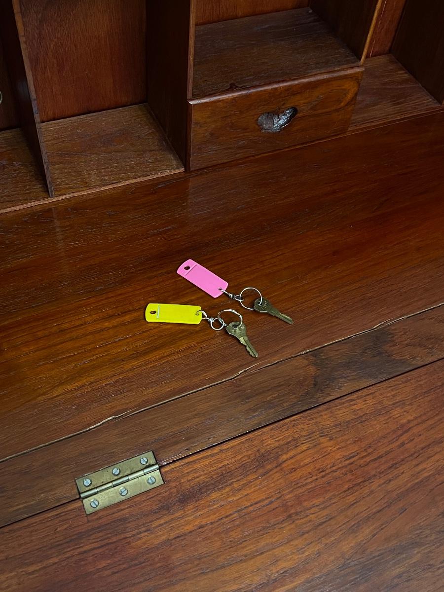 Has 2 keys ~ Solid Wood Drawers slide in & out easily ~ Little shelving unit inside secretary can be removed, see photos ~ No name brand found ~ Has some wood separation on inside, see photos, crack does not hinder the performance of the desk ~ Came from Hong Kong ~ 41” H x 36.25” W x 18” D