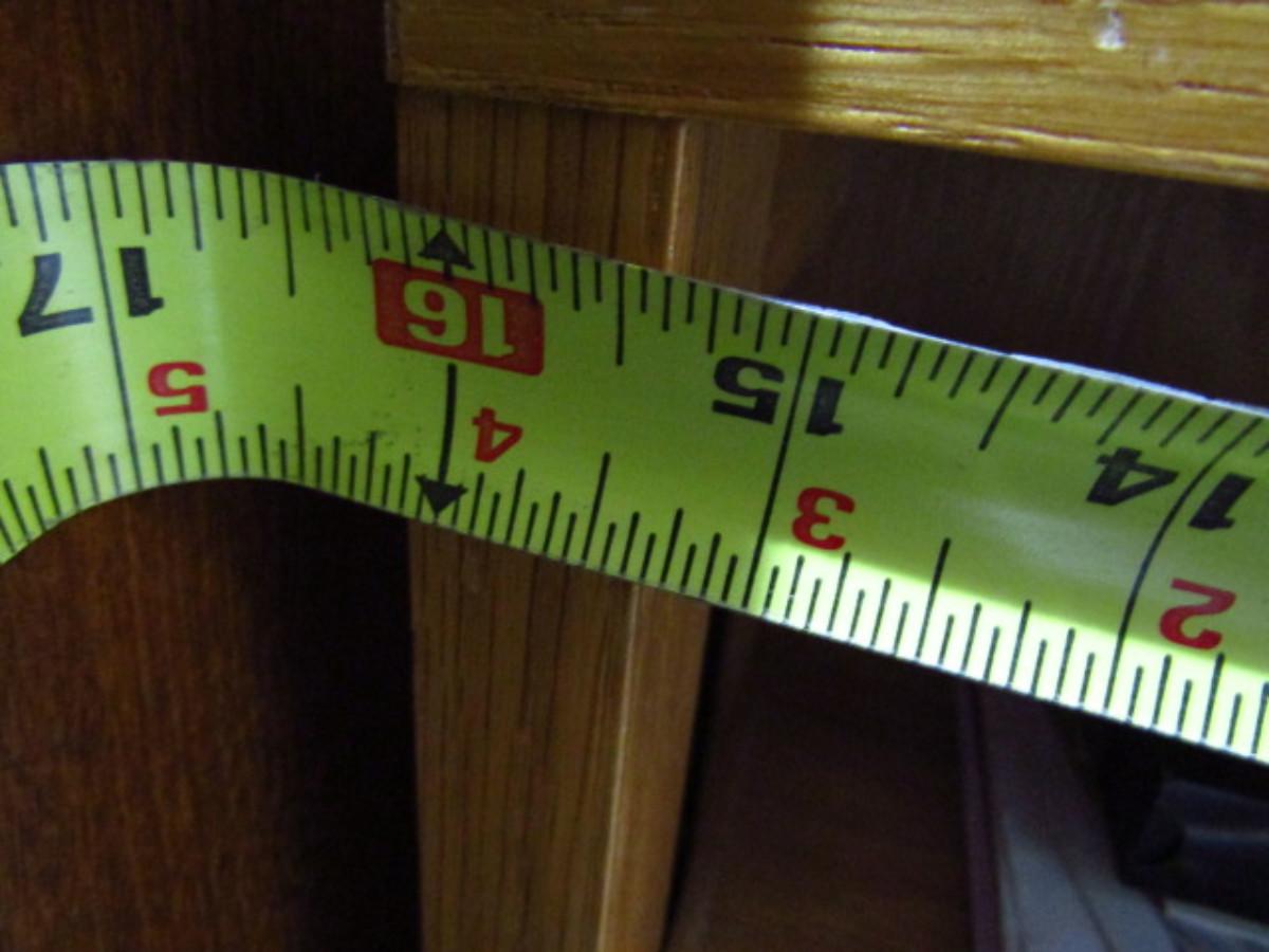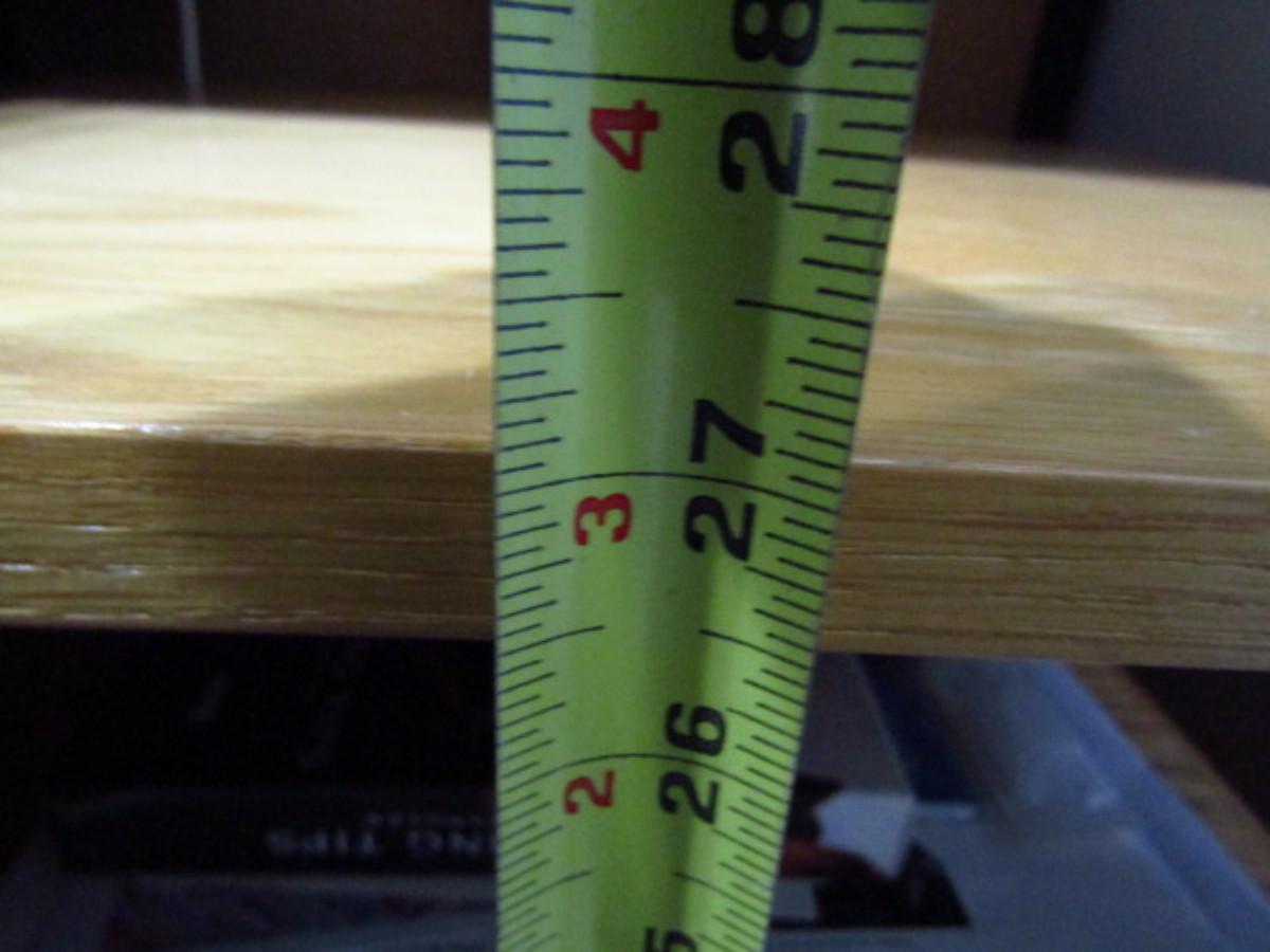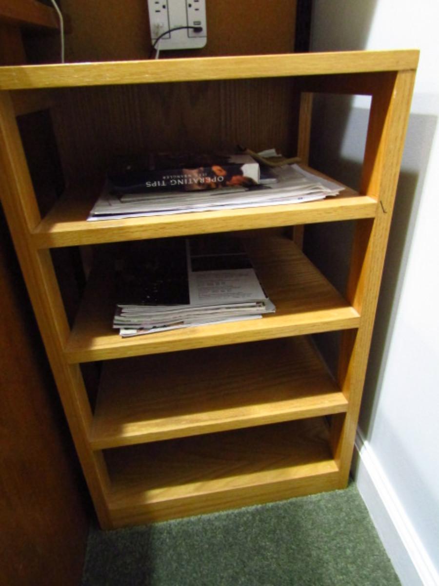 Solid Wood Shelving Unit- Item is Upstairs (Choice #1 of 2). Measures approx 16" wide, 14" deep, and 27" tall.