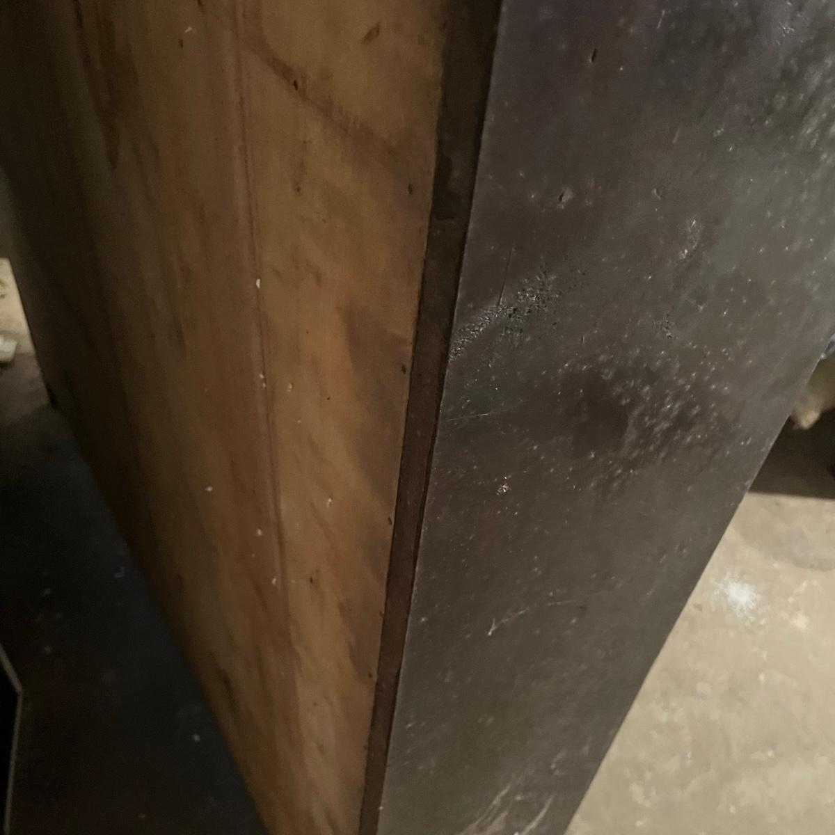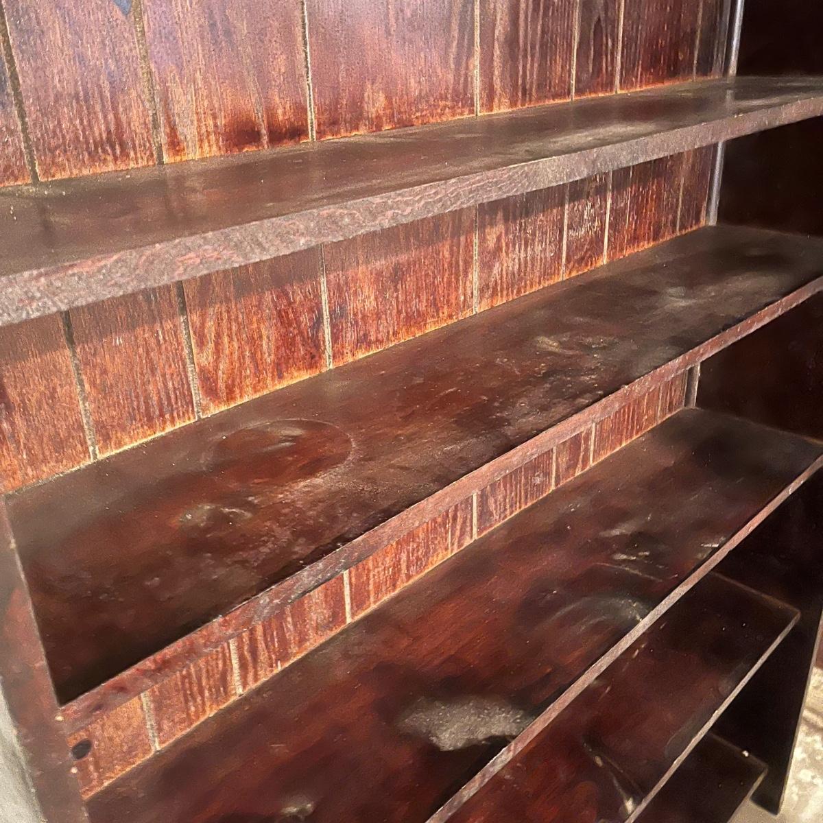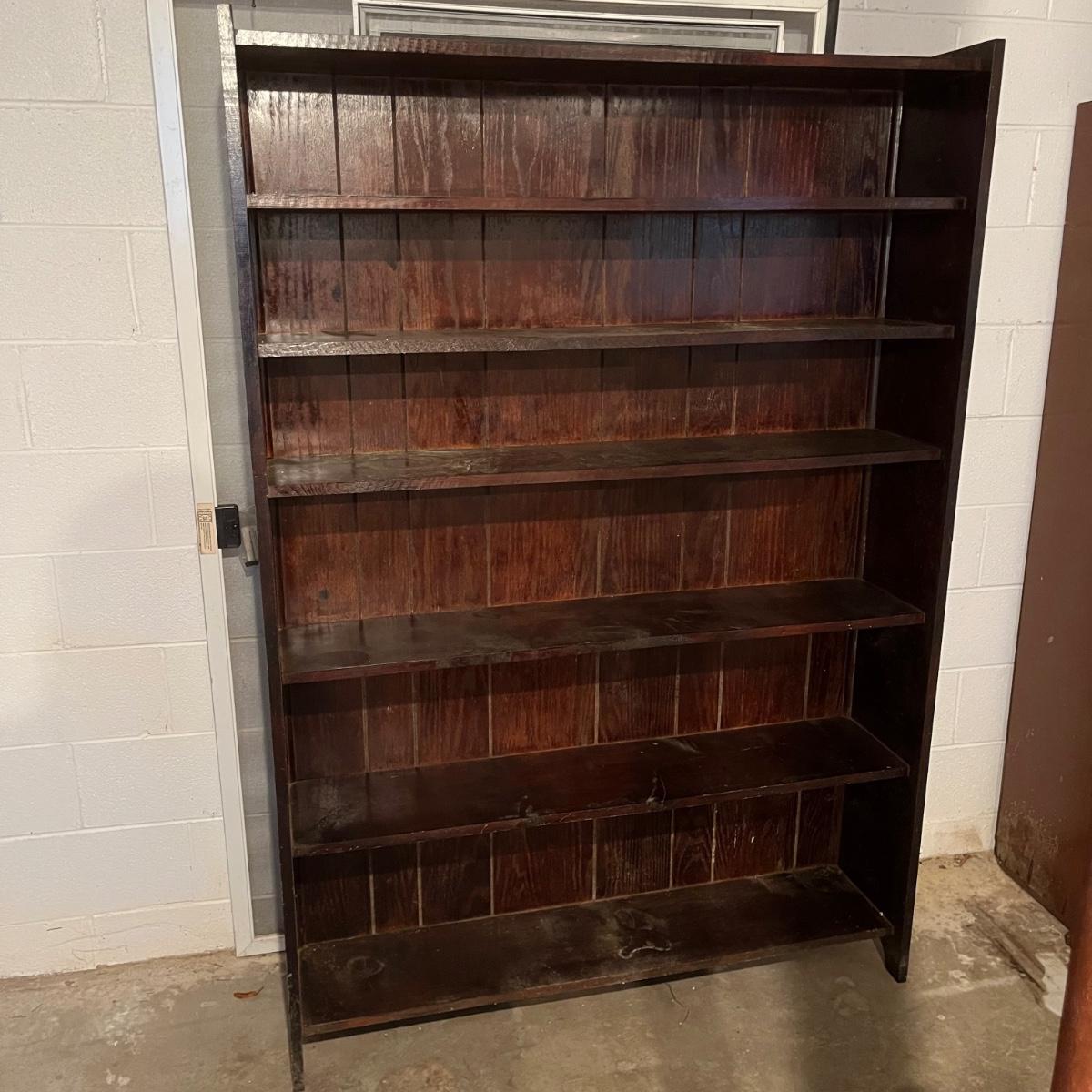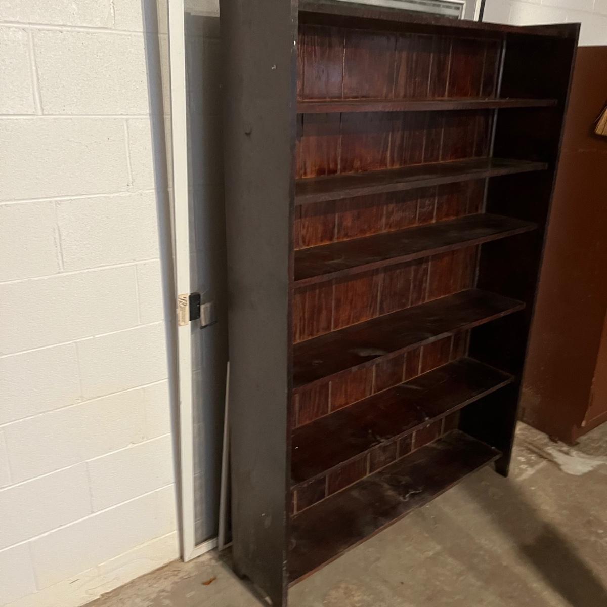 Lot includes a solid wood shelving unit with six shelves. Unit measures 11.5” x 50” x 72”. It will need to be cleaned.