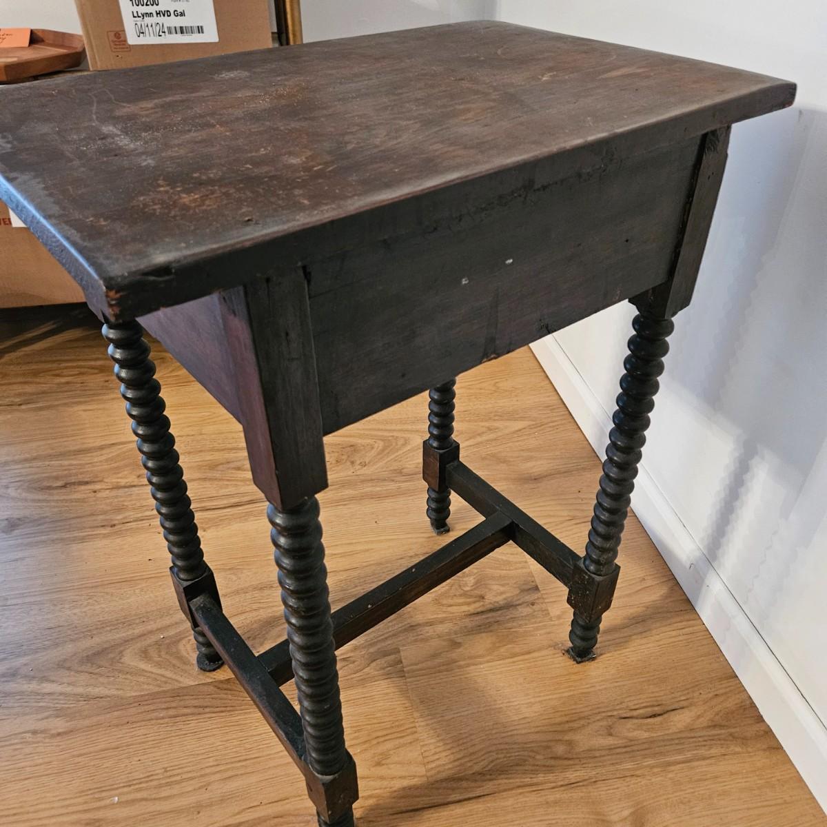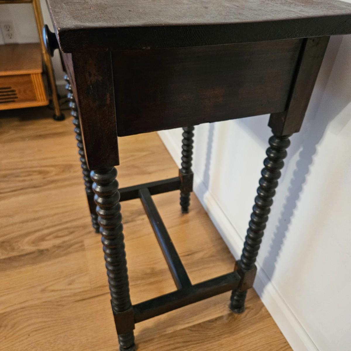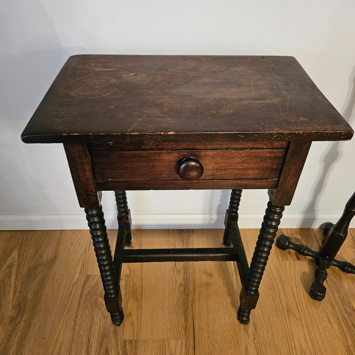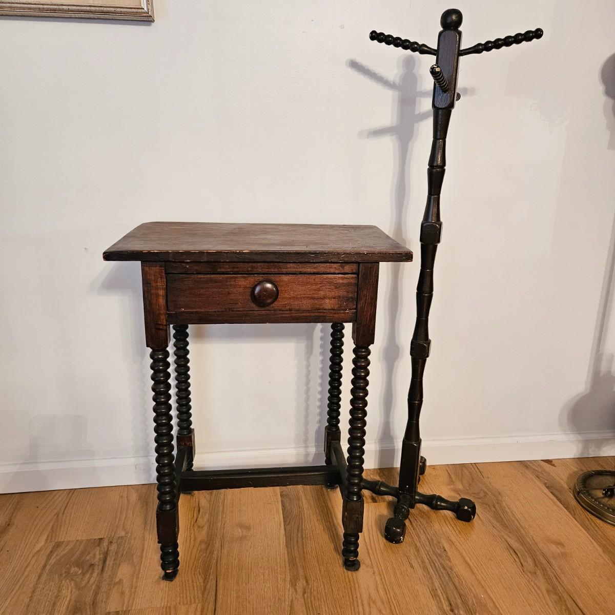 A small side table made of solid wood. It features spool legs, a dovetailed drawer and a rich dark stain. It measures approximately 23" x 14.5" x 29.5"H. Also included is a wooden coat tree with a similar stain. Local pickup only