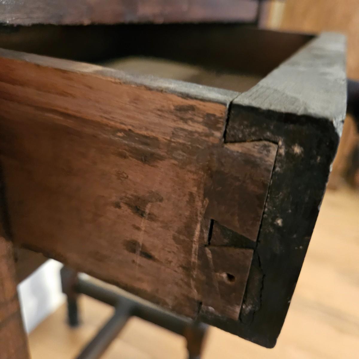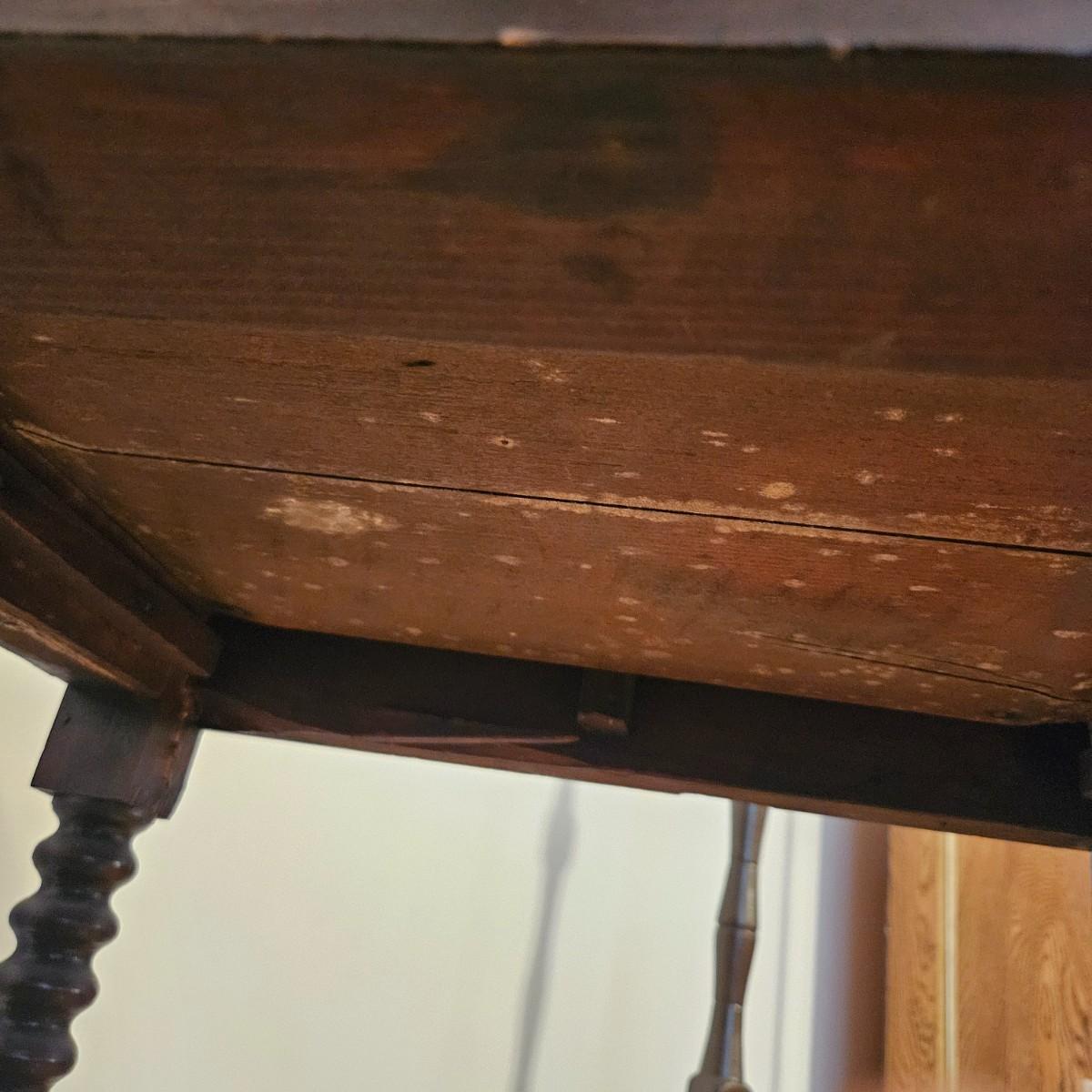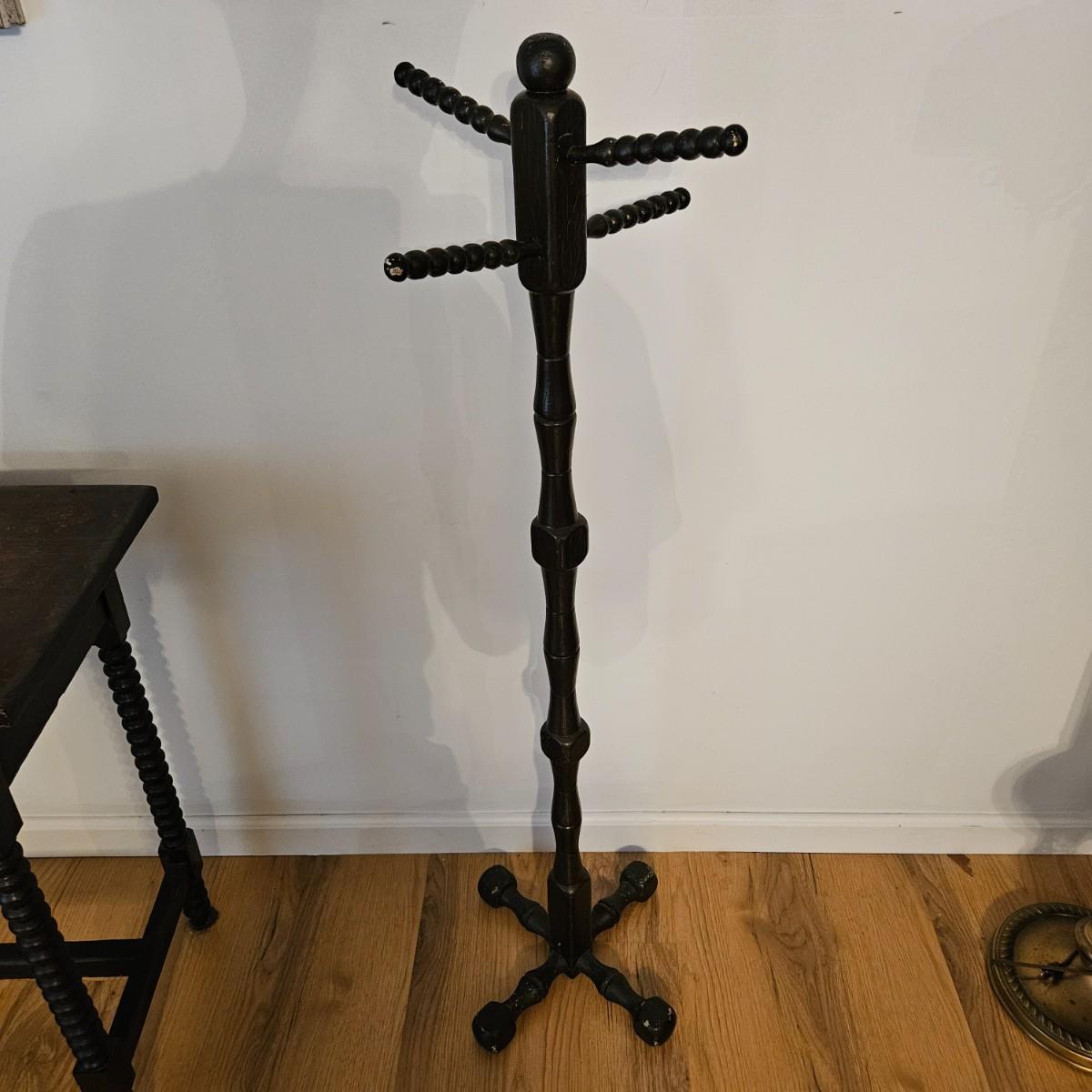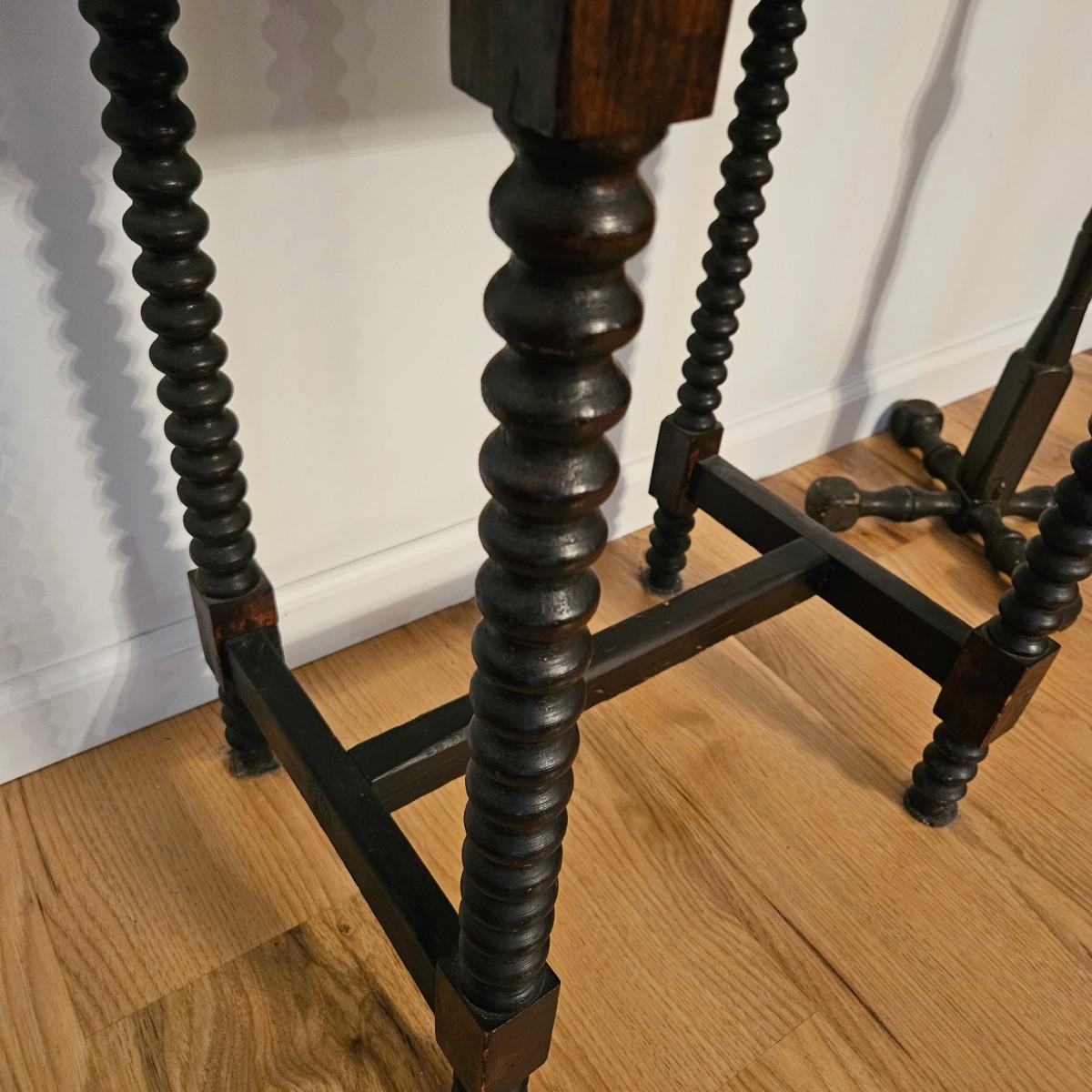 A small side table made of solid wood. It features spool legs, a dovetailed drawer and a rich dark stain. It measures approximately 23" x 14.5" x 29.5"H. Also included is a wooden coat tree with a similar stain. Local pickup only