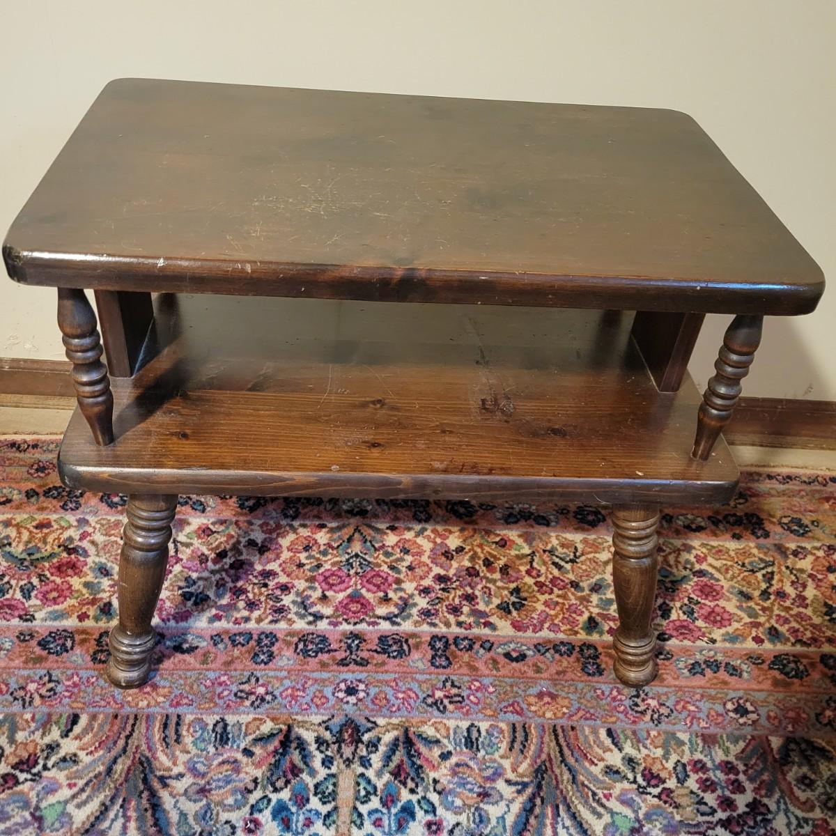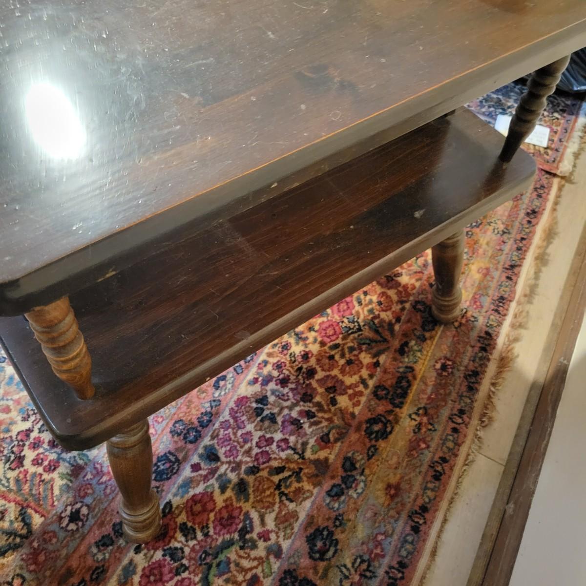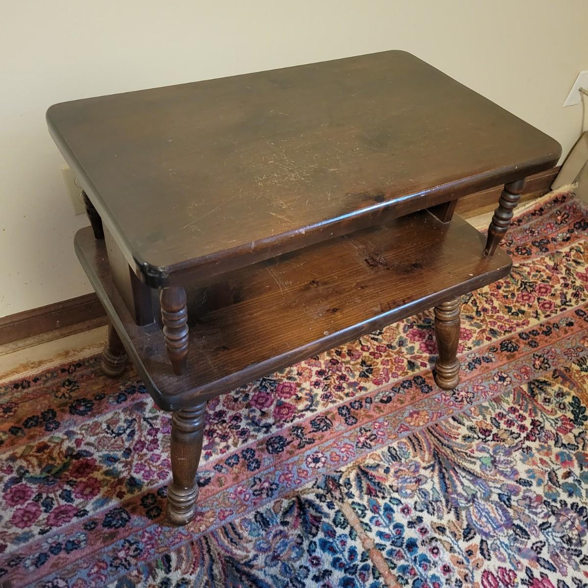 A solid wood side table that has two tiers. It measures approximately 27.5" x 17" x 24.5"H. The surface of this piece does have some scratches and blemishes. Local pickup only