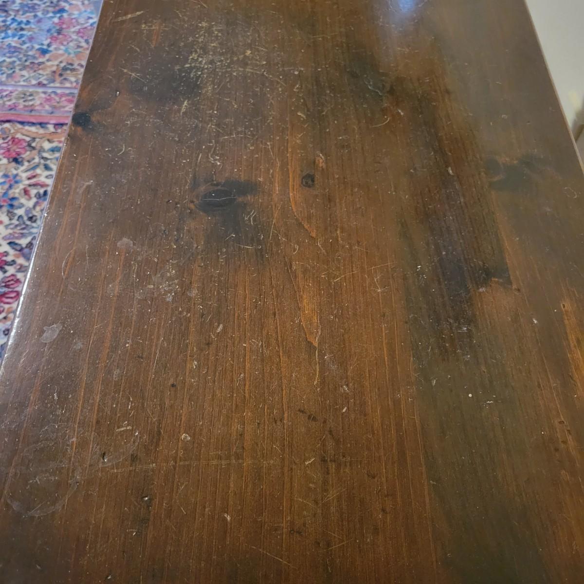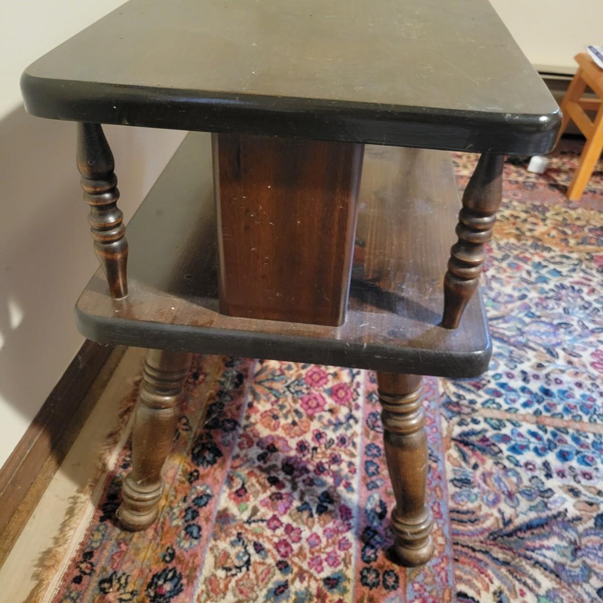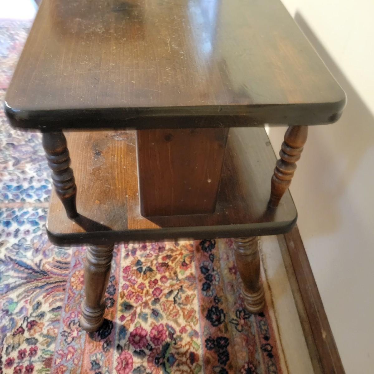 A solid wood side table that has two tiers. It measures approximately 27.5" x 17" x 24.5"H. The surface of this piece does have some scratches and blemishes. Local pickup only