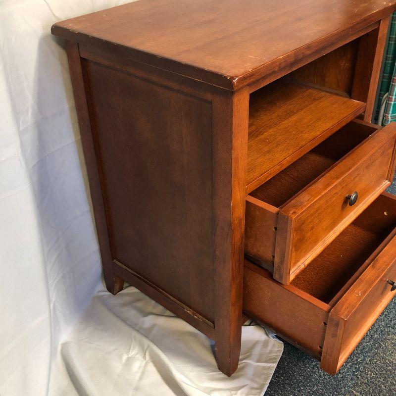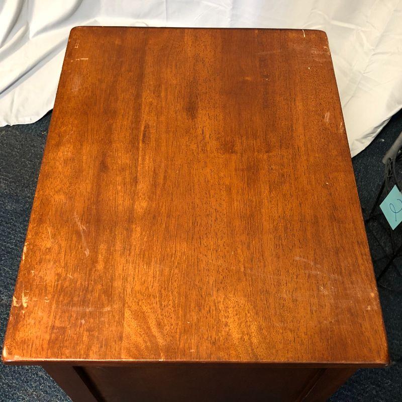 This is a modern made side table, but overall in good shape with no pressboard found. The drawers slide in and out smoothly on tracks. It is heavy so please bring help to lift and load. It does have some scratches to the top, but nothing so significant that you couldn't use it as is. It is 27" tall, 22" wide and 17" deep.