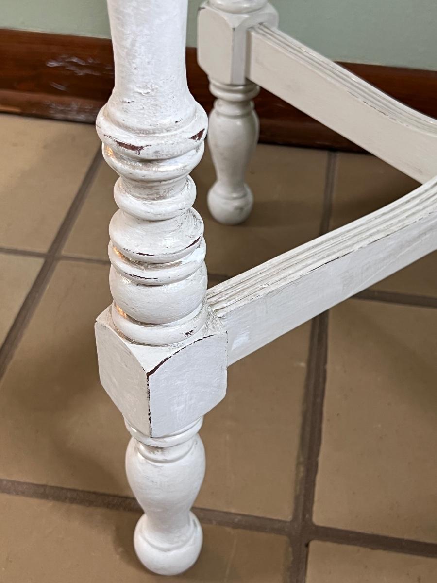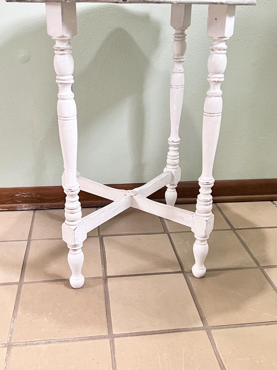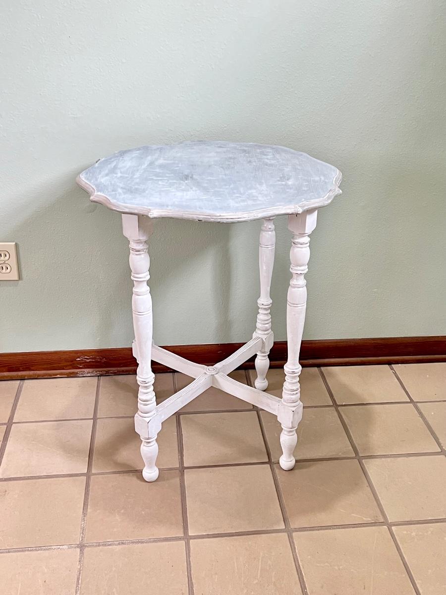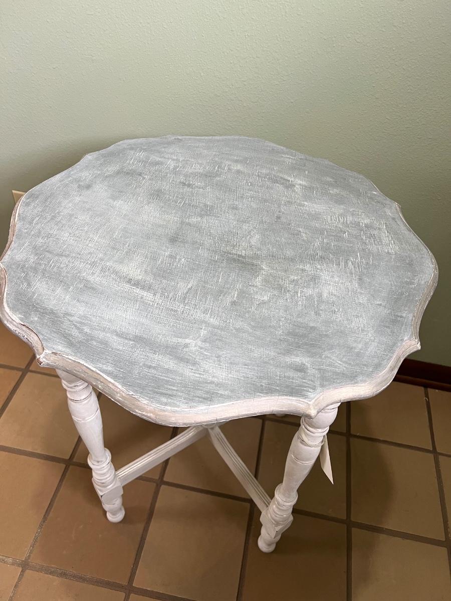 Table is a light gray distressed color with silver accents ~ 29” H x 24” Round