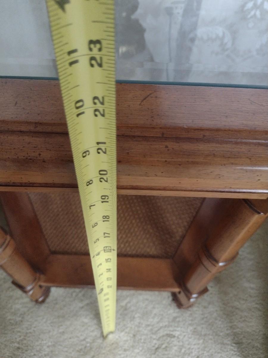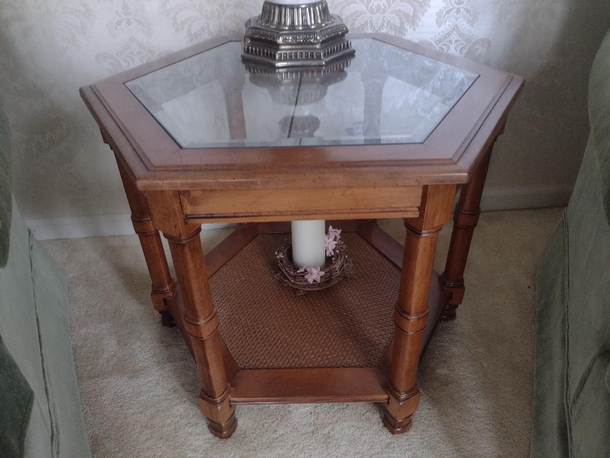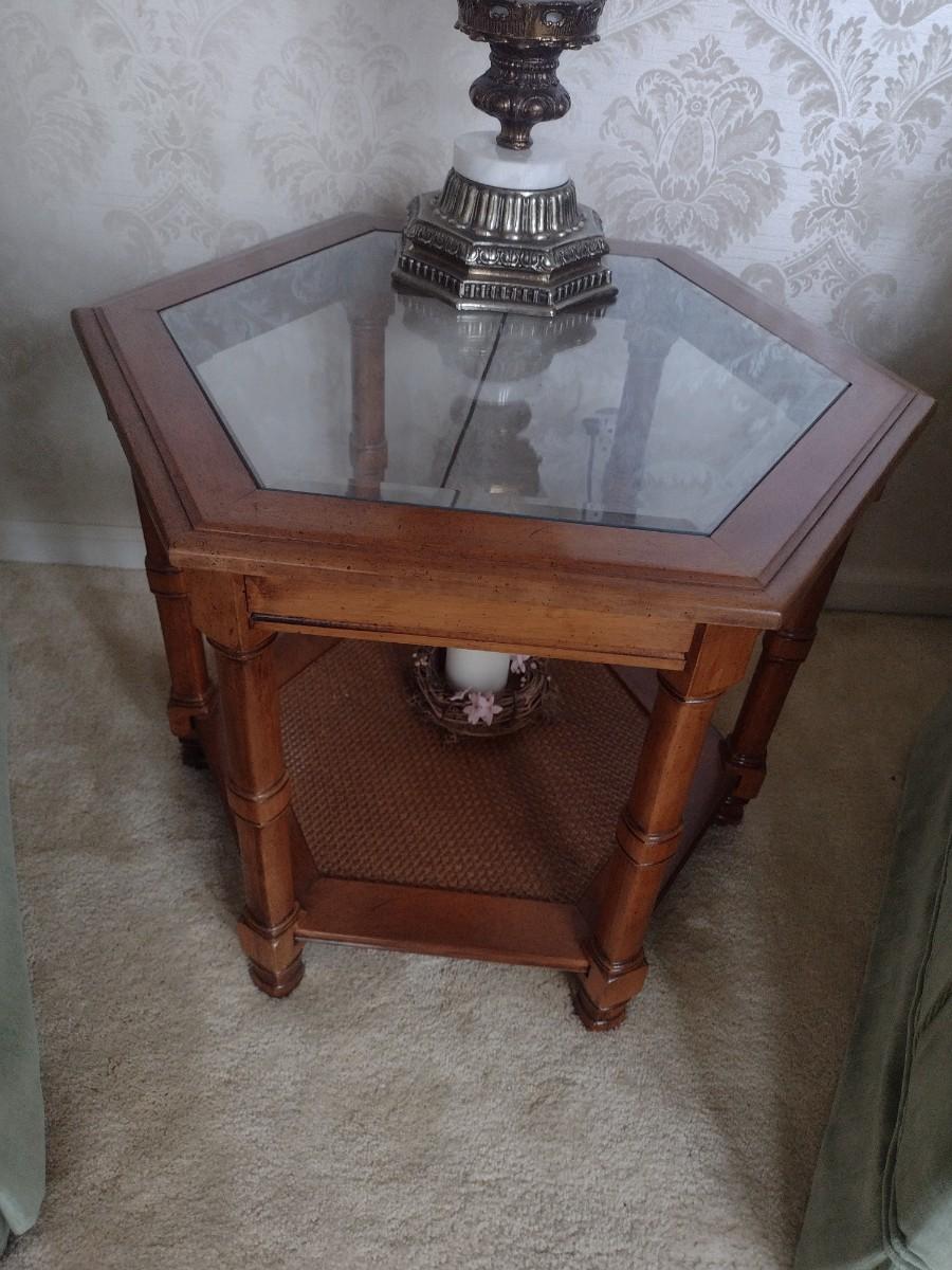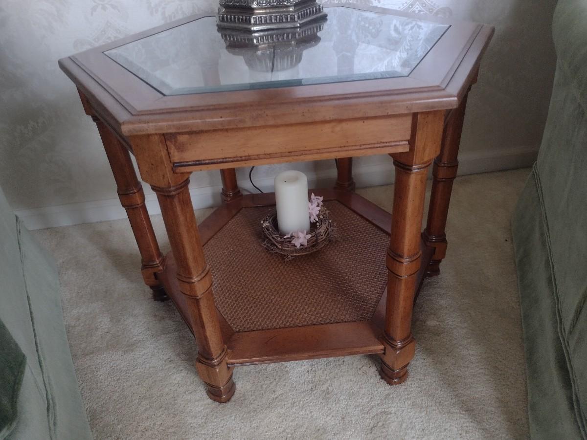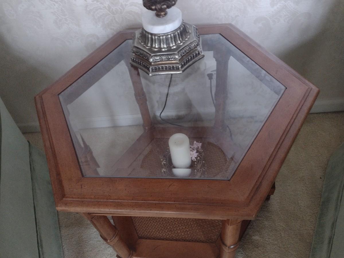 Solid Wood Six-Sided Side Table with Glass Top and Cane Bottom Shelf