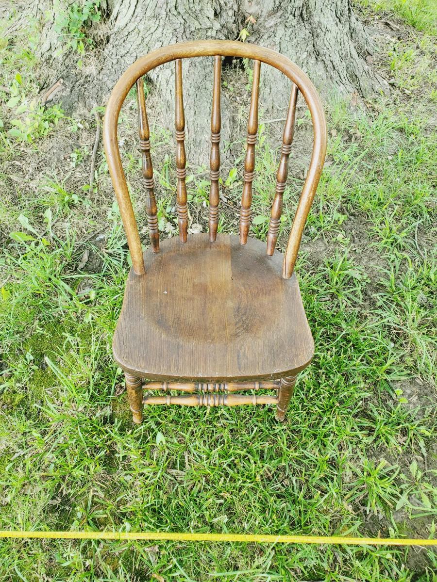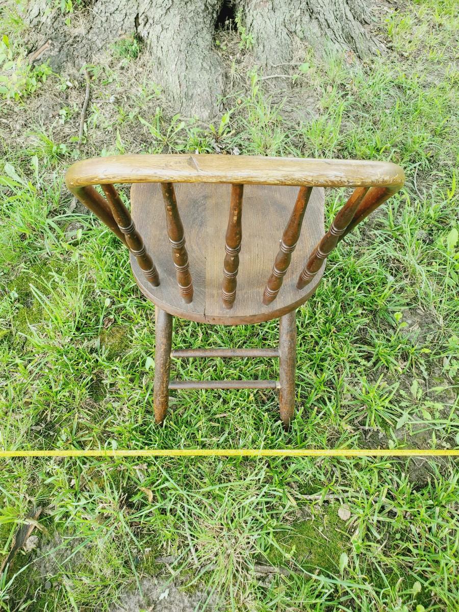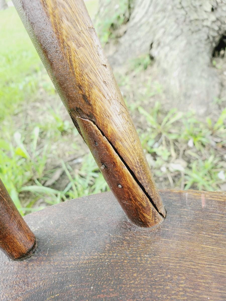 Solid chair, cracks in the side spindle, see photo. Approximately 17in floor to chair, 33in from floor to top of back. Good overall condition