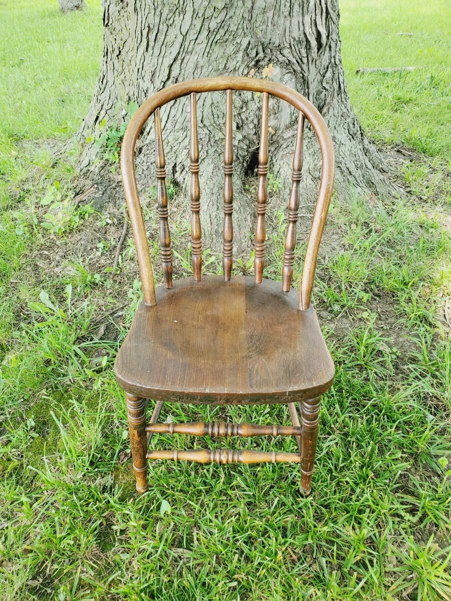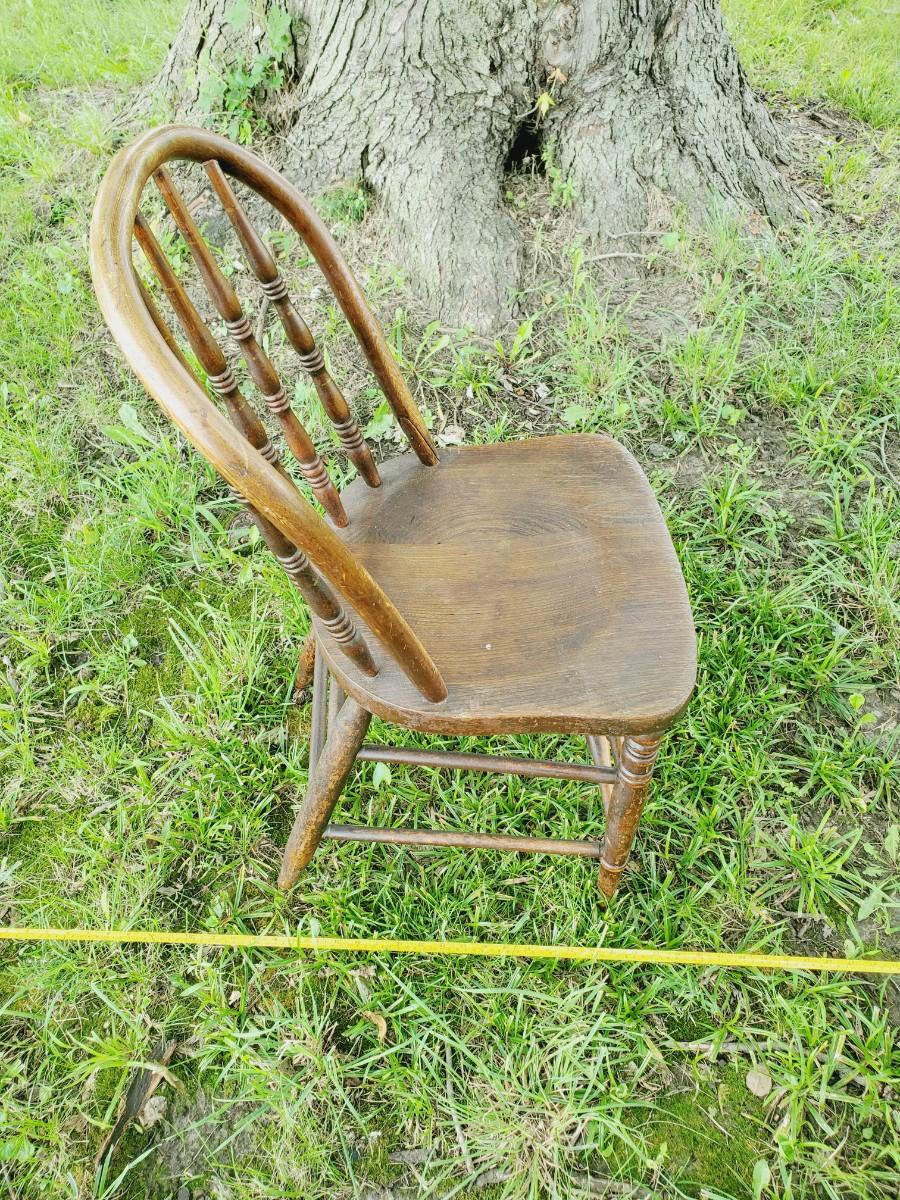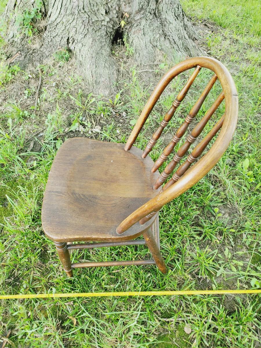 Solid chair, cracks in the side spindle, see photo. Approximately 17in floor to chair, 33in from floor to top of back. Good overall condition