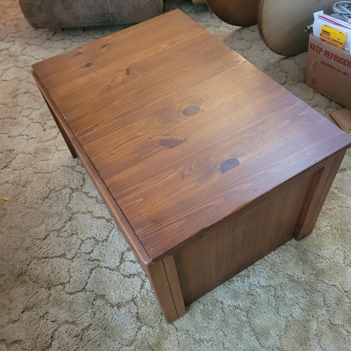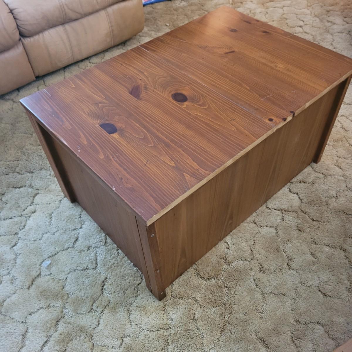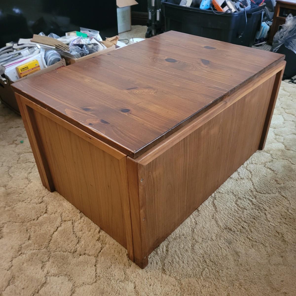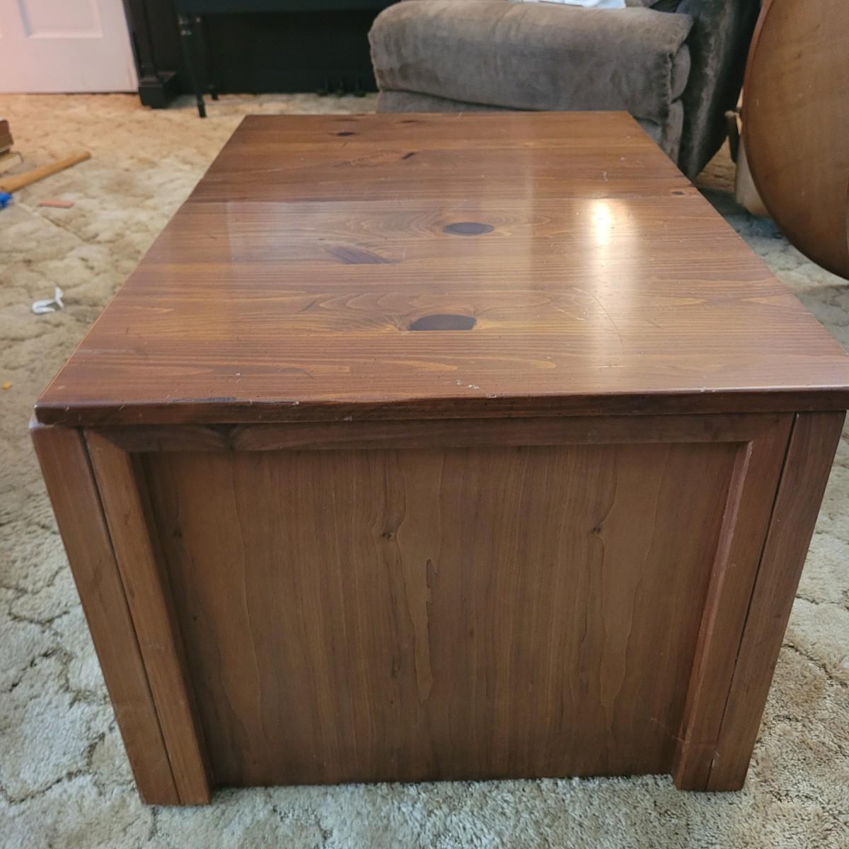 This lot includes one solid wood storage chest. This chest could also double as a table with storage underneath. The table top lifts completely off to allow access to a large storage space within. There does not appear to be a makers mark or signature. The chest measures 34" x 23" x 18.5"H.