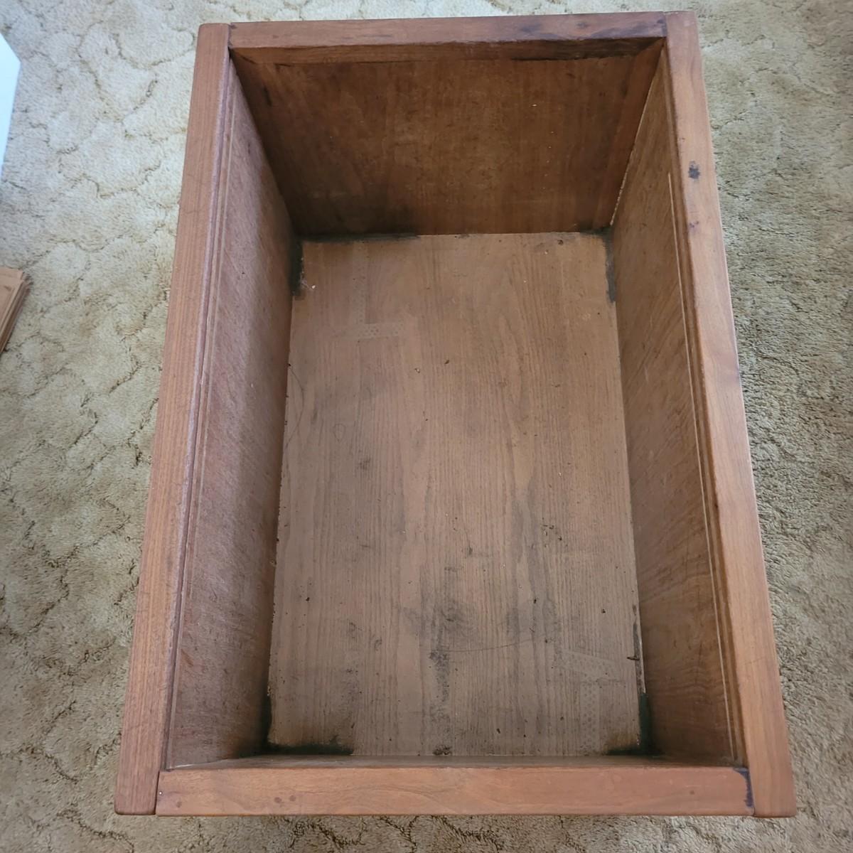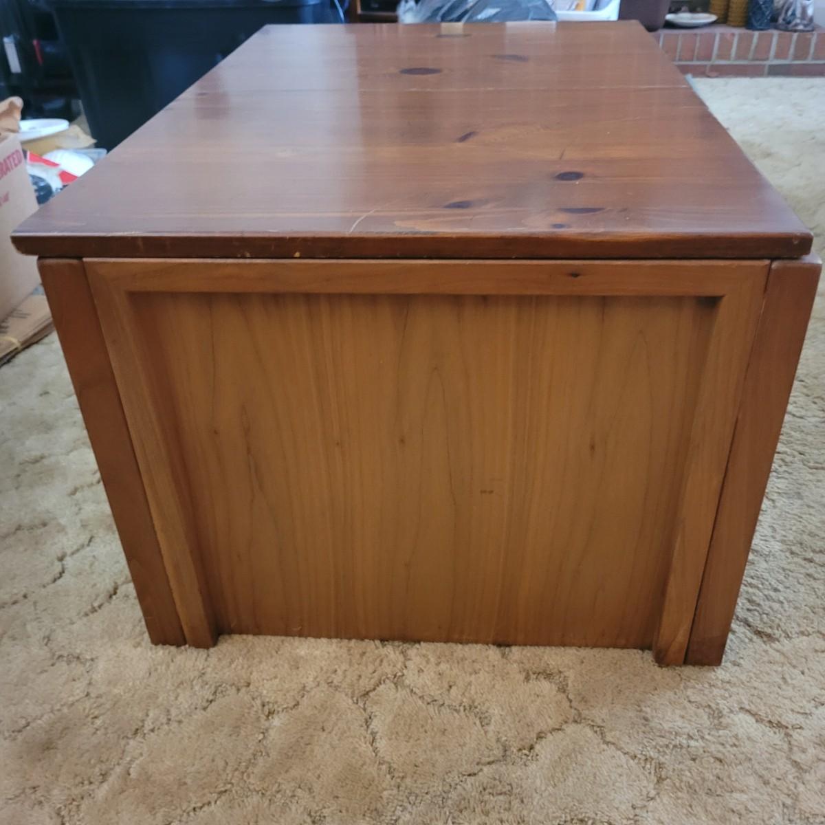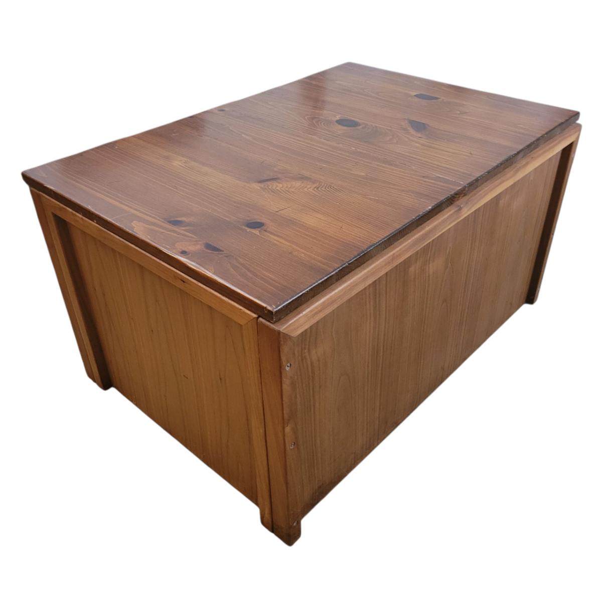 This lot includes one solid wood storage chest. This chest could also double as a table with storage underneath. The table top lifts completely off to allow access to a large storage space within. There does not appear to be a makers mark or signature. The chest measures 34" x 23" x 18.5"H.