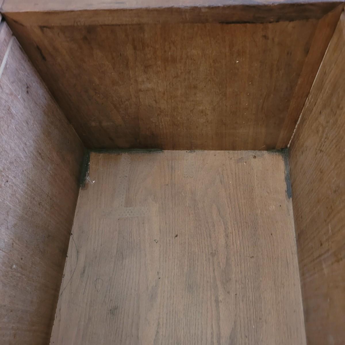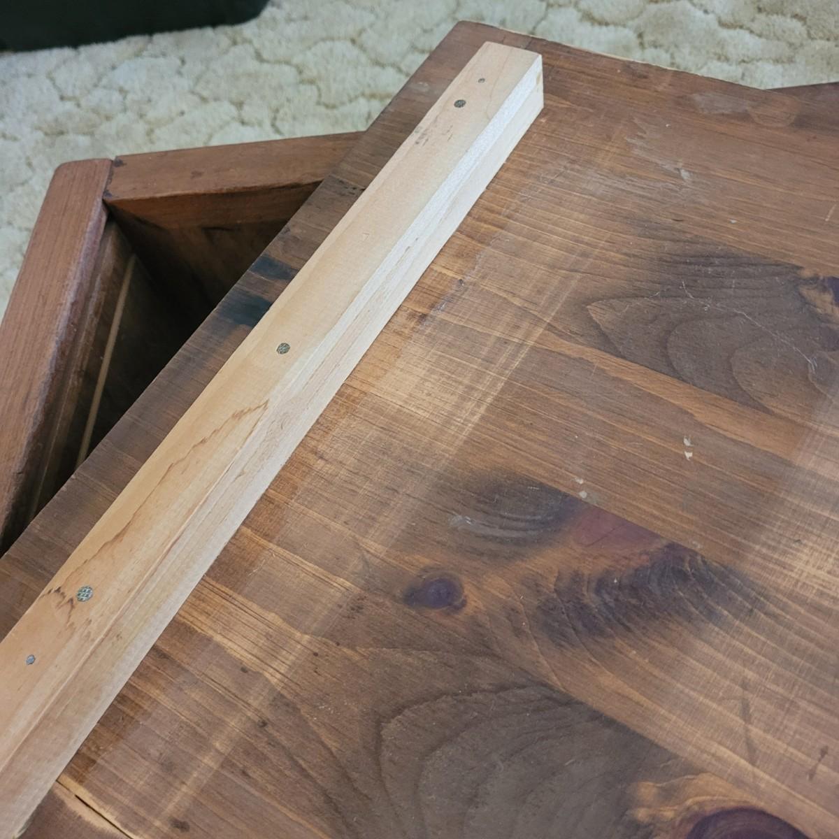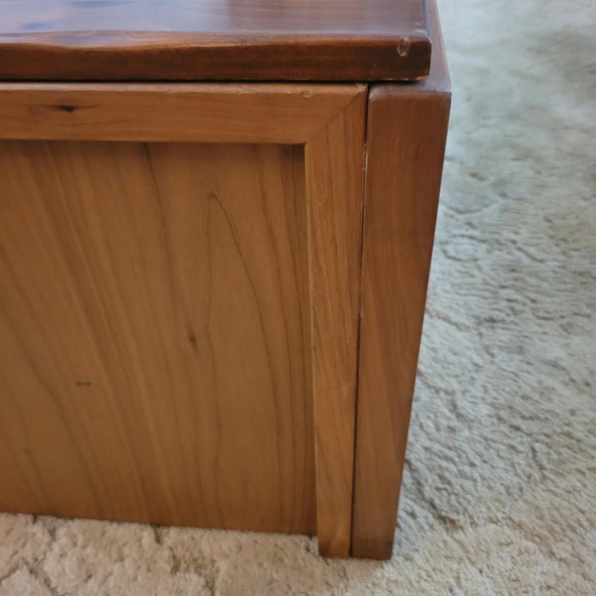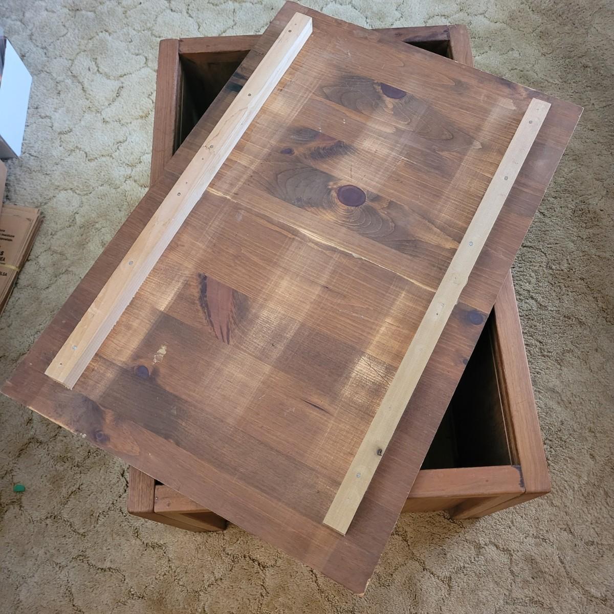 This lot includes one solid wood storage chest. This chest could also double as a table with storage underneath. The table top lifts completely off to allow access to a large storage space within. There does not appear to be a makers mark or signature. The chest measures 34" x 23" x 18.5"H.