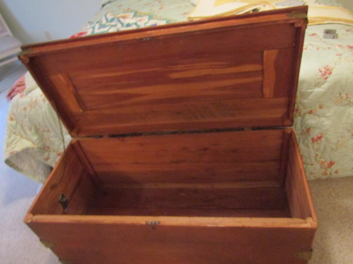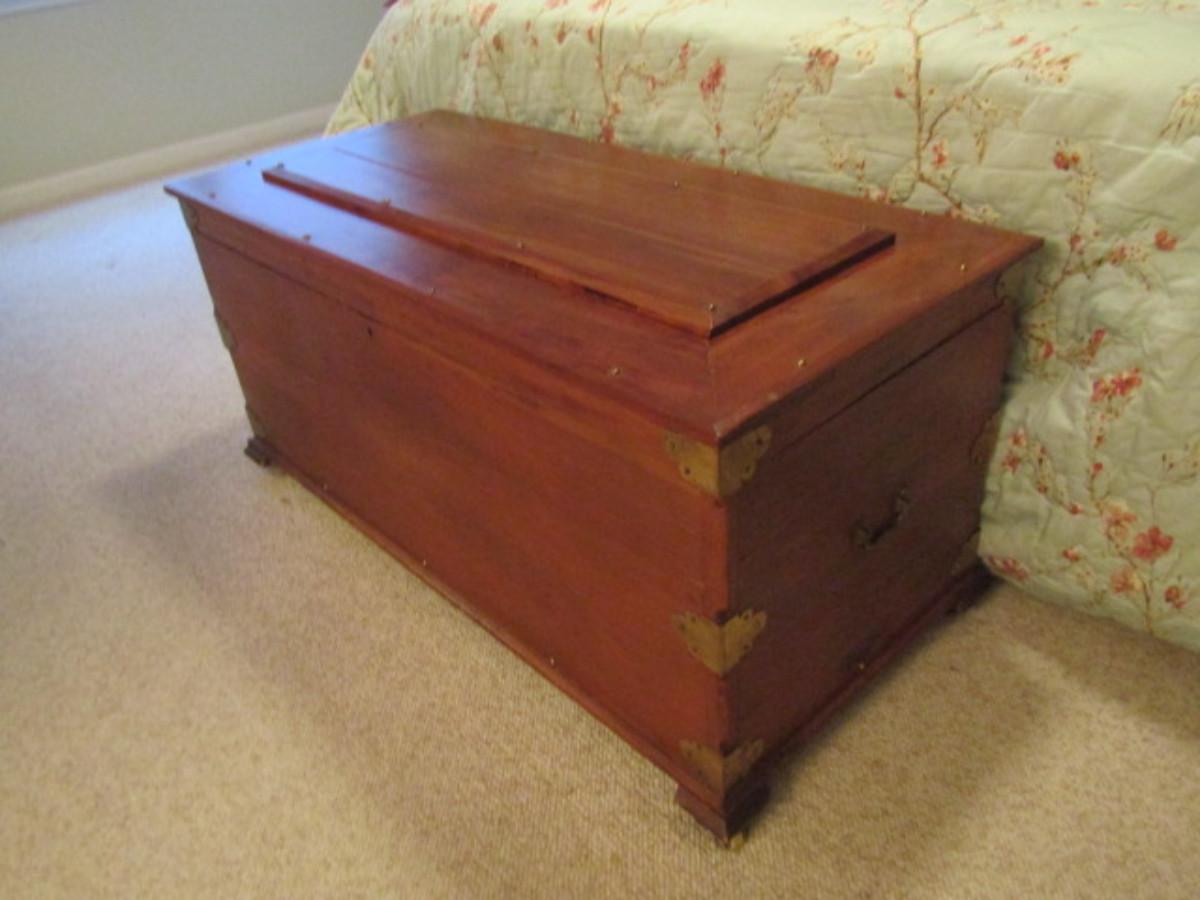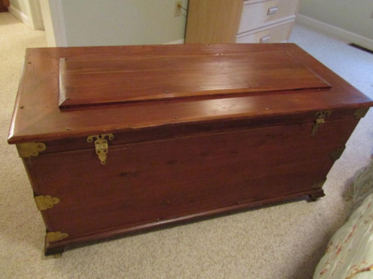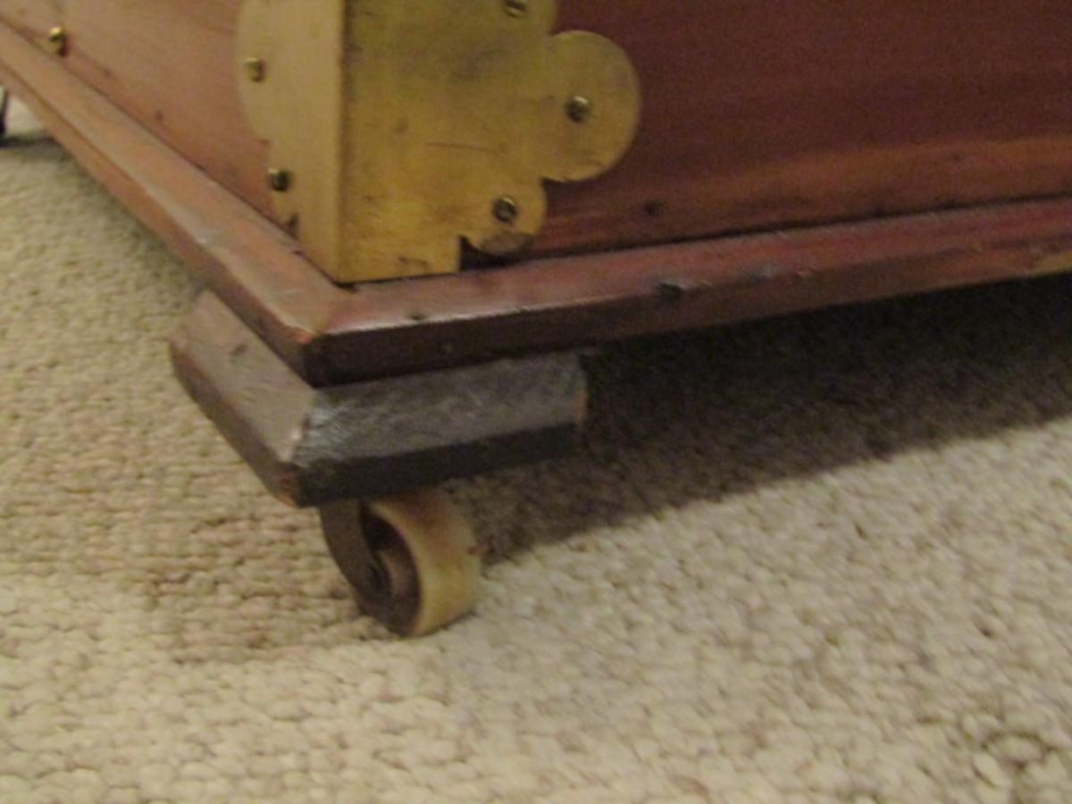 Solid Wood Storage Chest on Casters with Metal Accents- Approx 44 3/4" x 21 3/4" x 21 1/2". Some slight separation of boards on the bottom of chest- please see pictures.