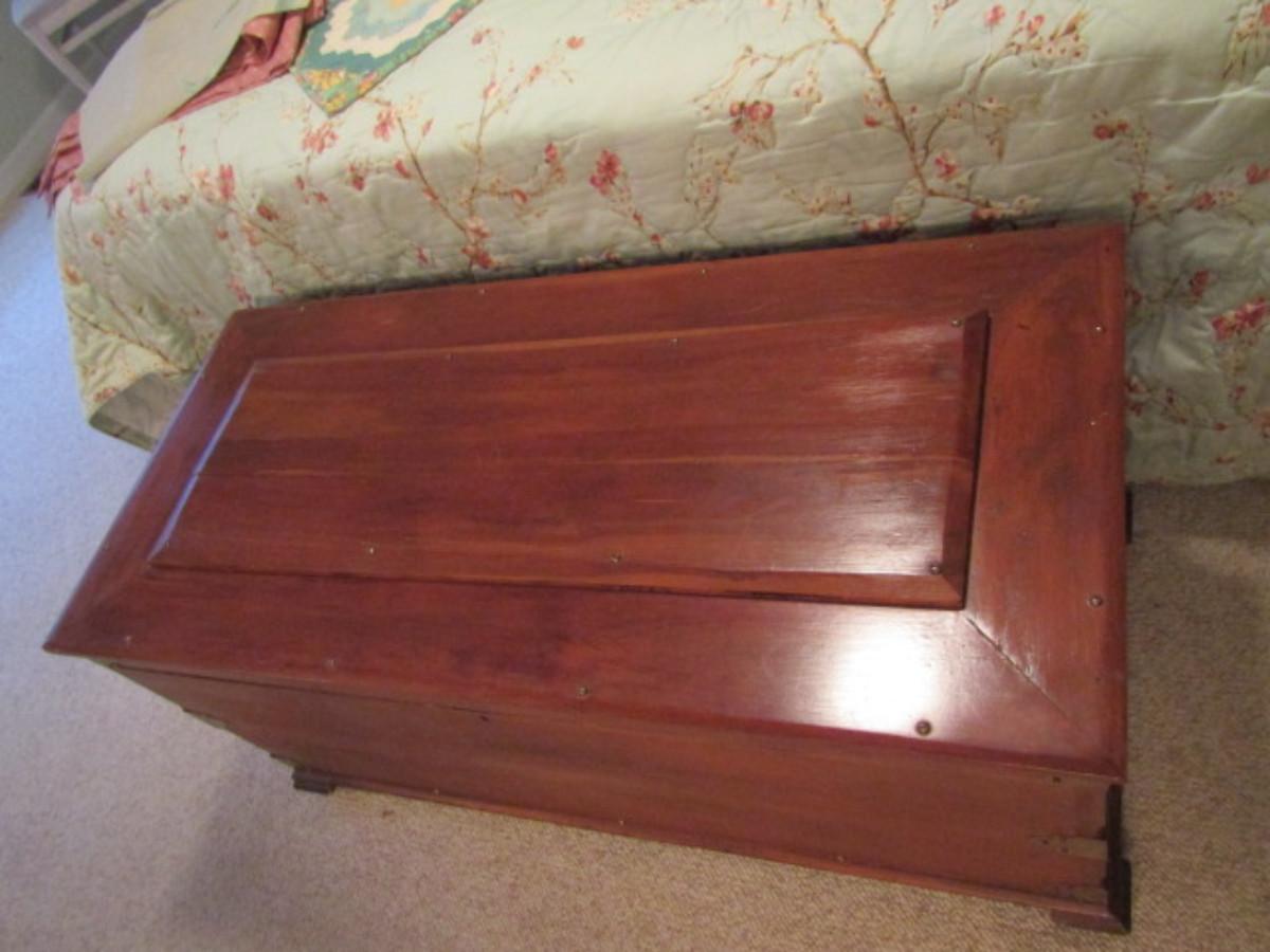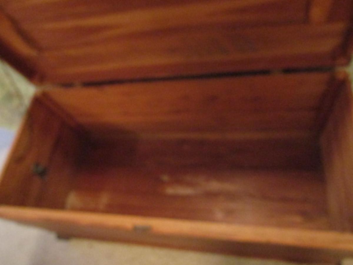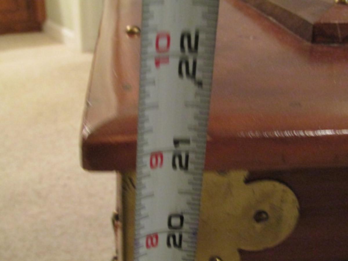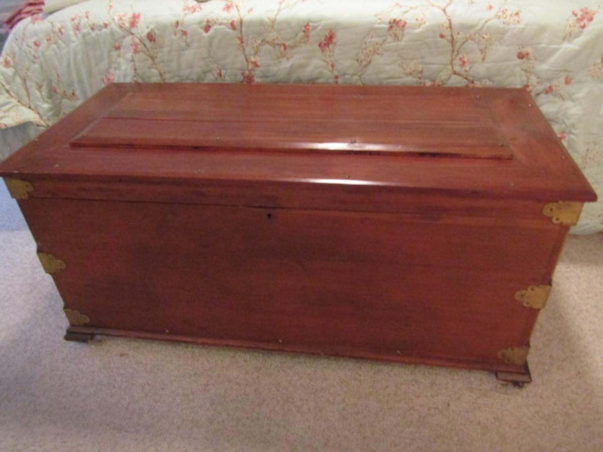 Solid Wood Storage Chest on Casters with Metal Accents- Approx 44 3/4" x 21 3/4" x 21 1/2". Some slight separation of boards on the bottom of chest- please see pictures.