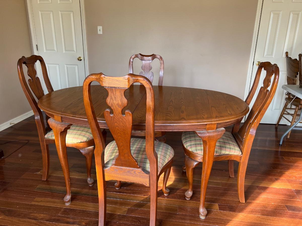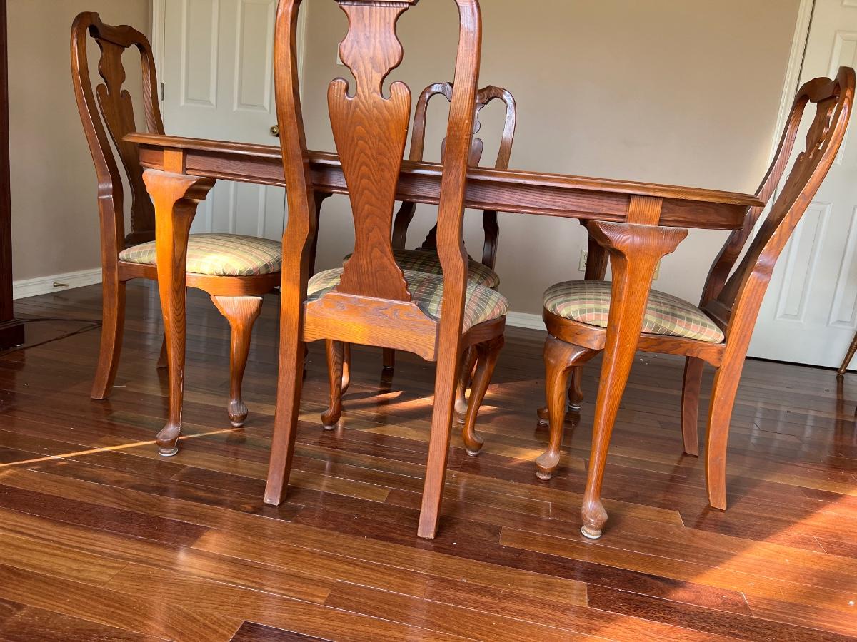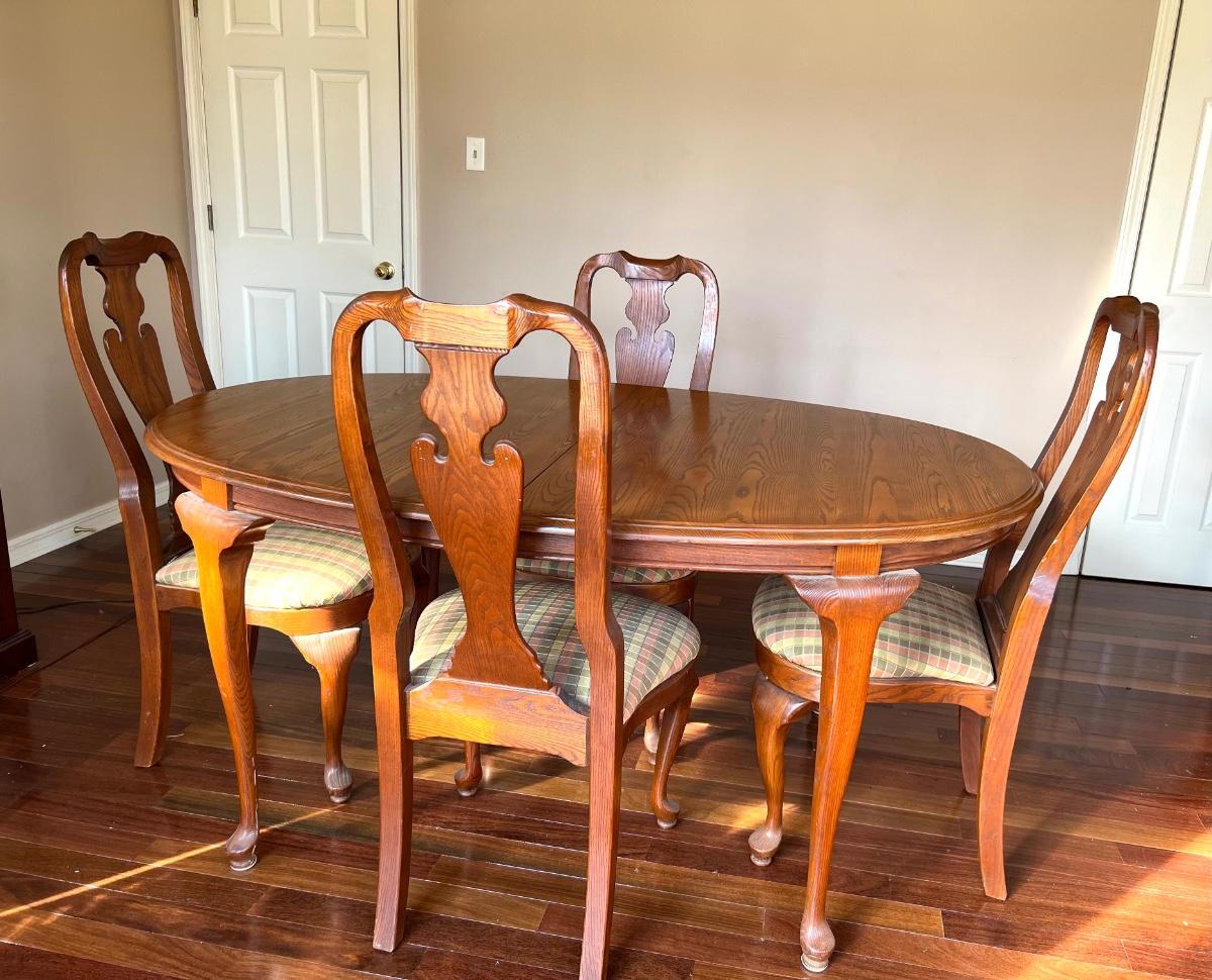 Solid wood Table with 4 chairs measures 66 inches long, 43 inches wide as pictured. Table has two additional leaves measuring 12 Inches each. Table can potentially be 90 inches long. Chairs measure 18 inches from the floor to seat.